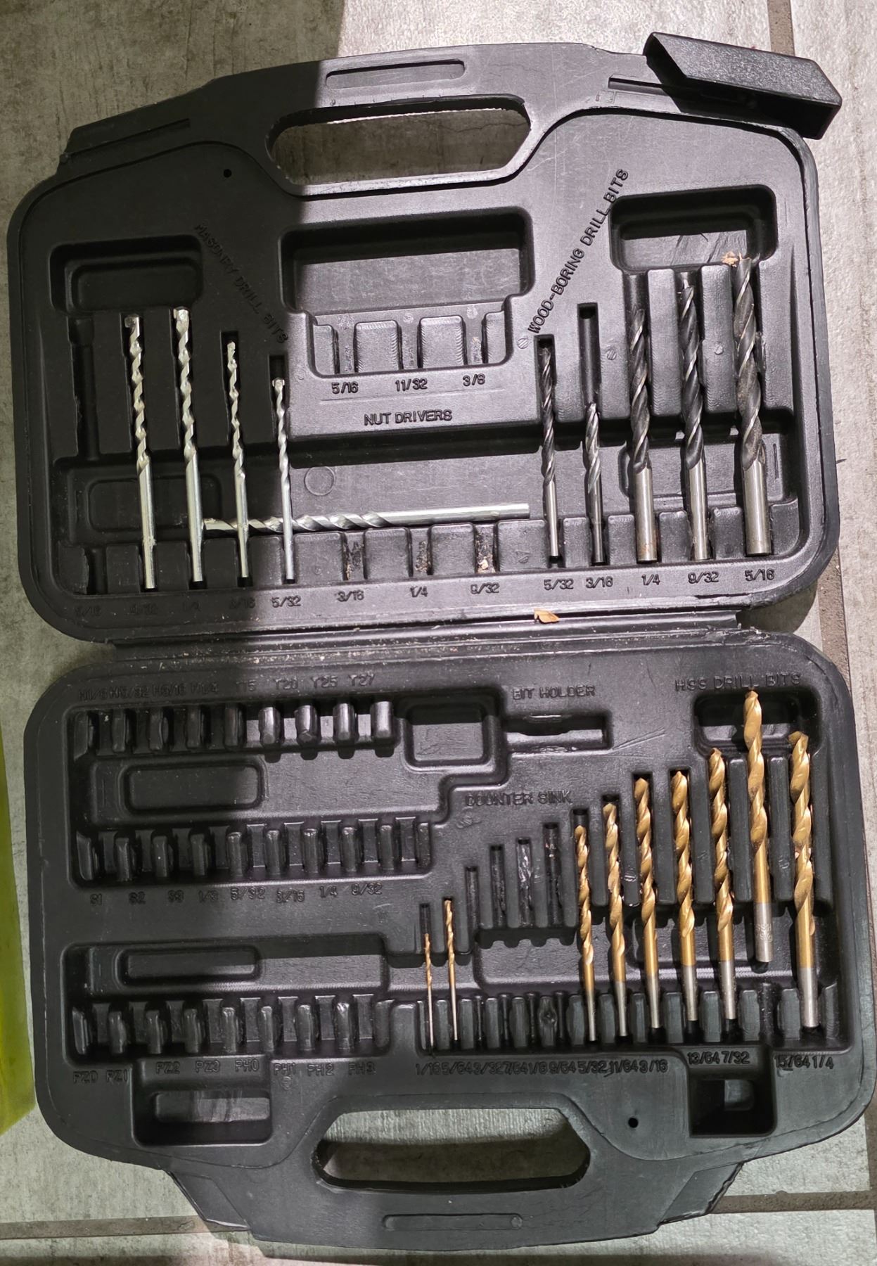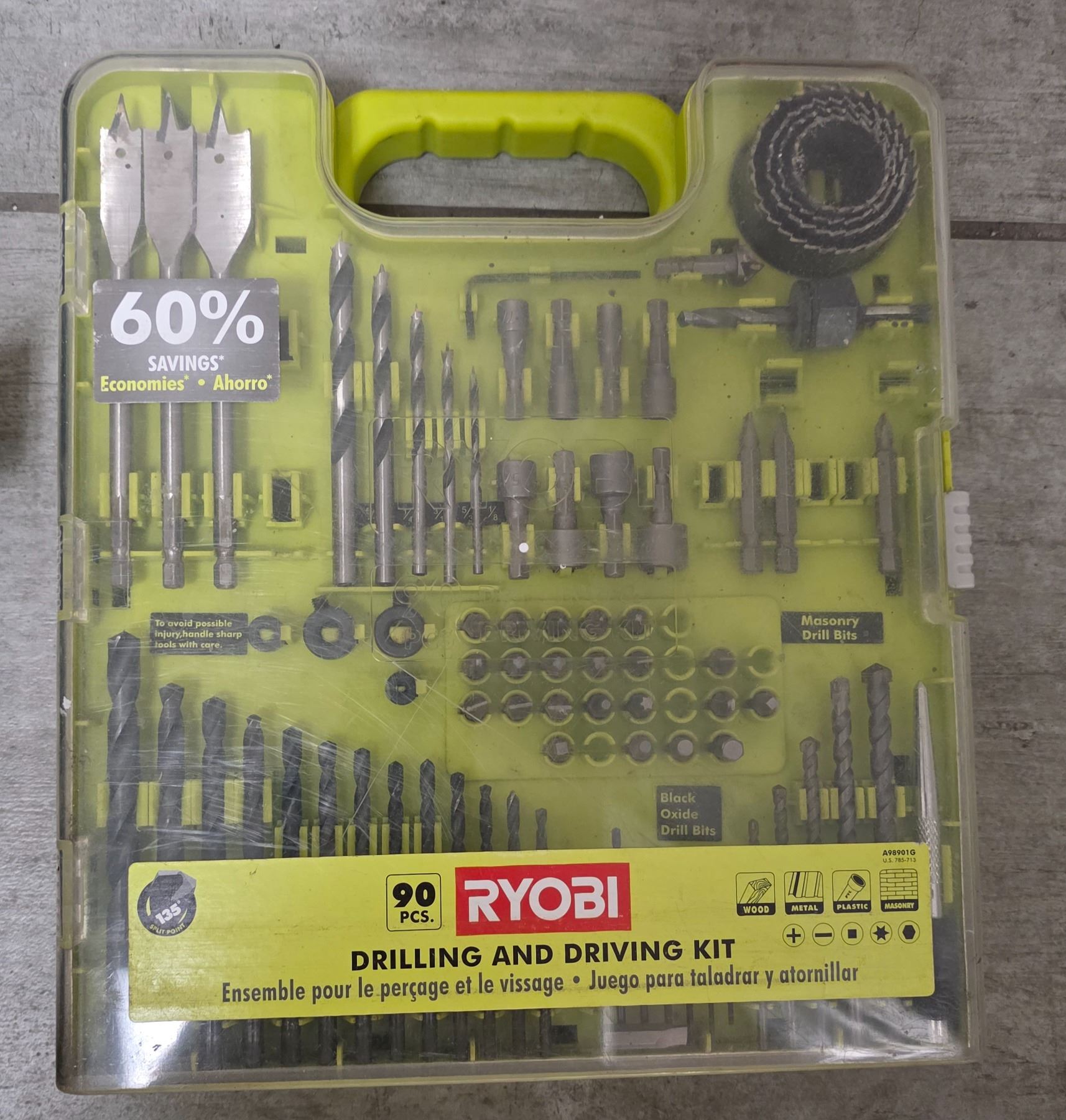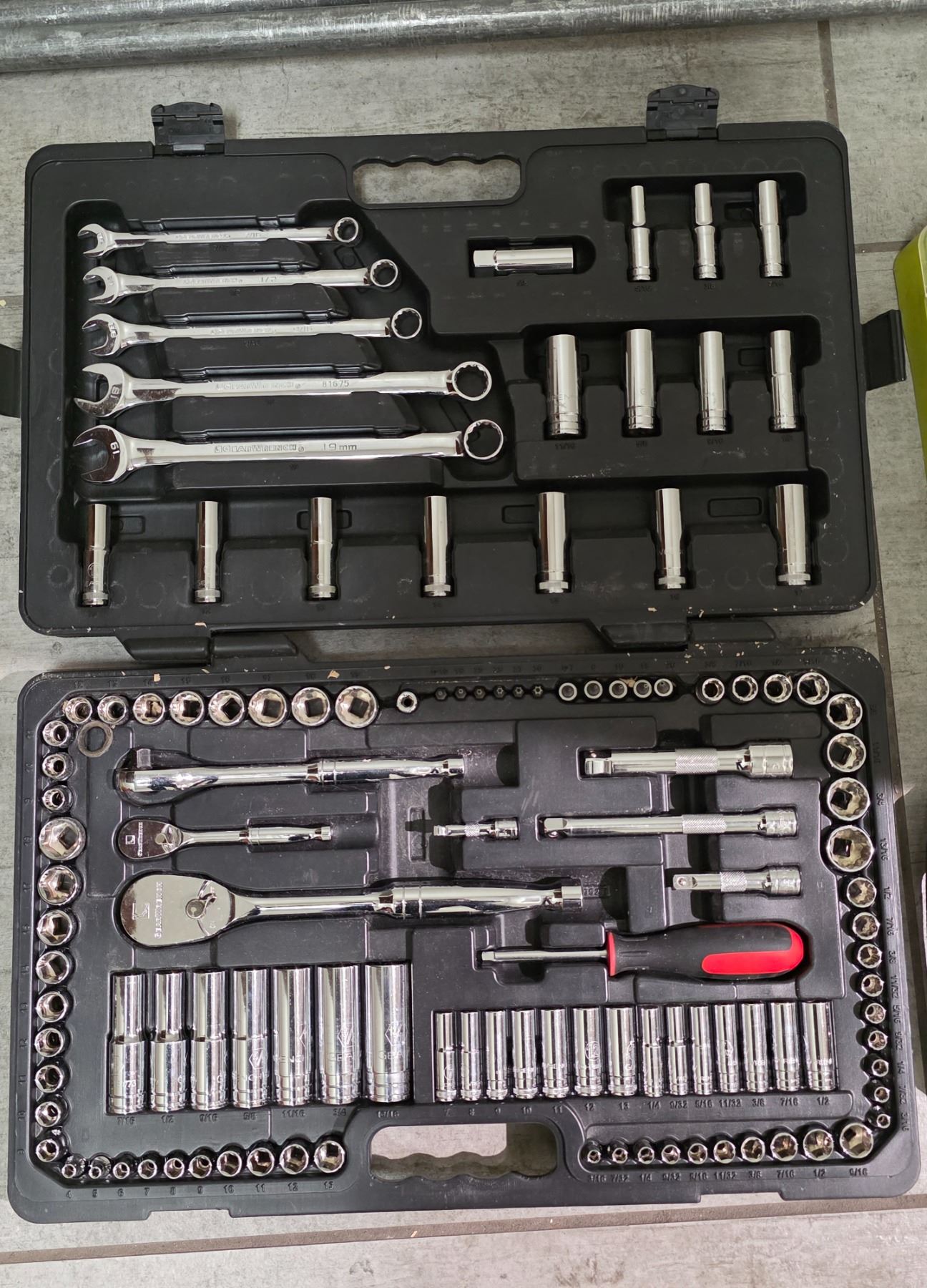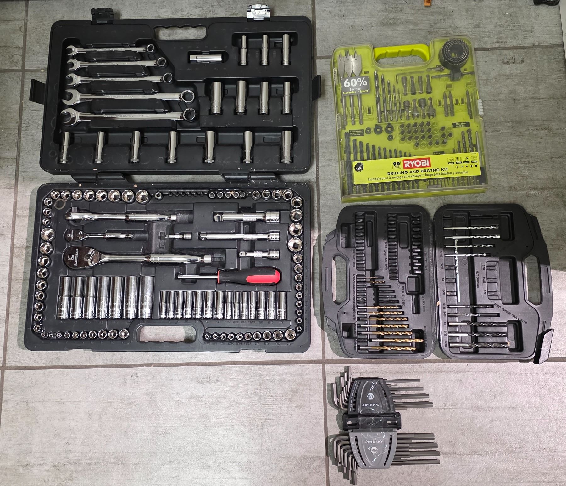 Mixed Hand Tools Lot: Socket & Wrench Set, Drill Bit Set, Ryobi Kit and Pipe Clamps