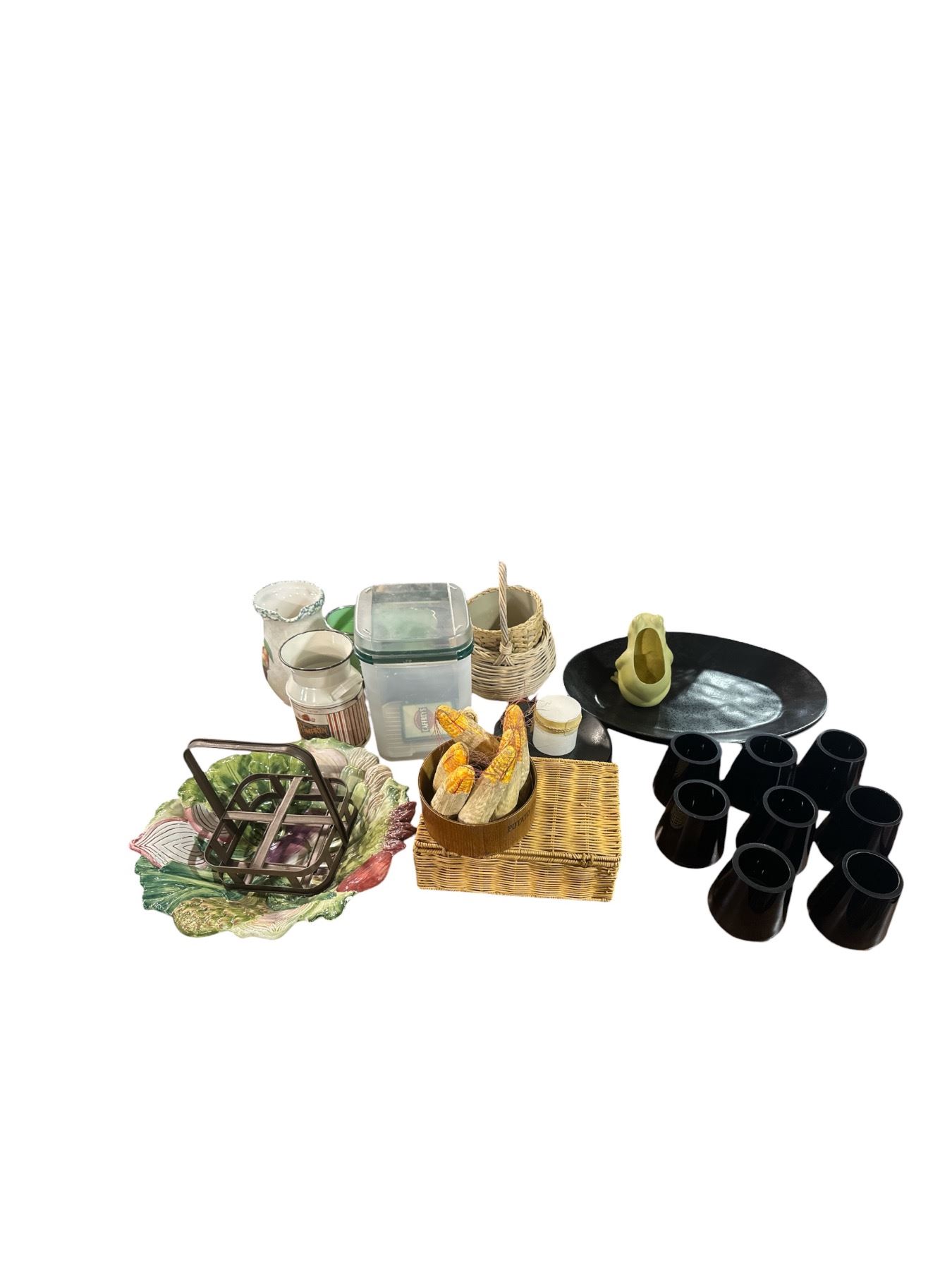 Mixed Kitchen & Decorative Lot - Ceramic Serving Bowl, Glassware, Baskets, Serving Tray & Assorted Household Items