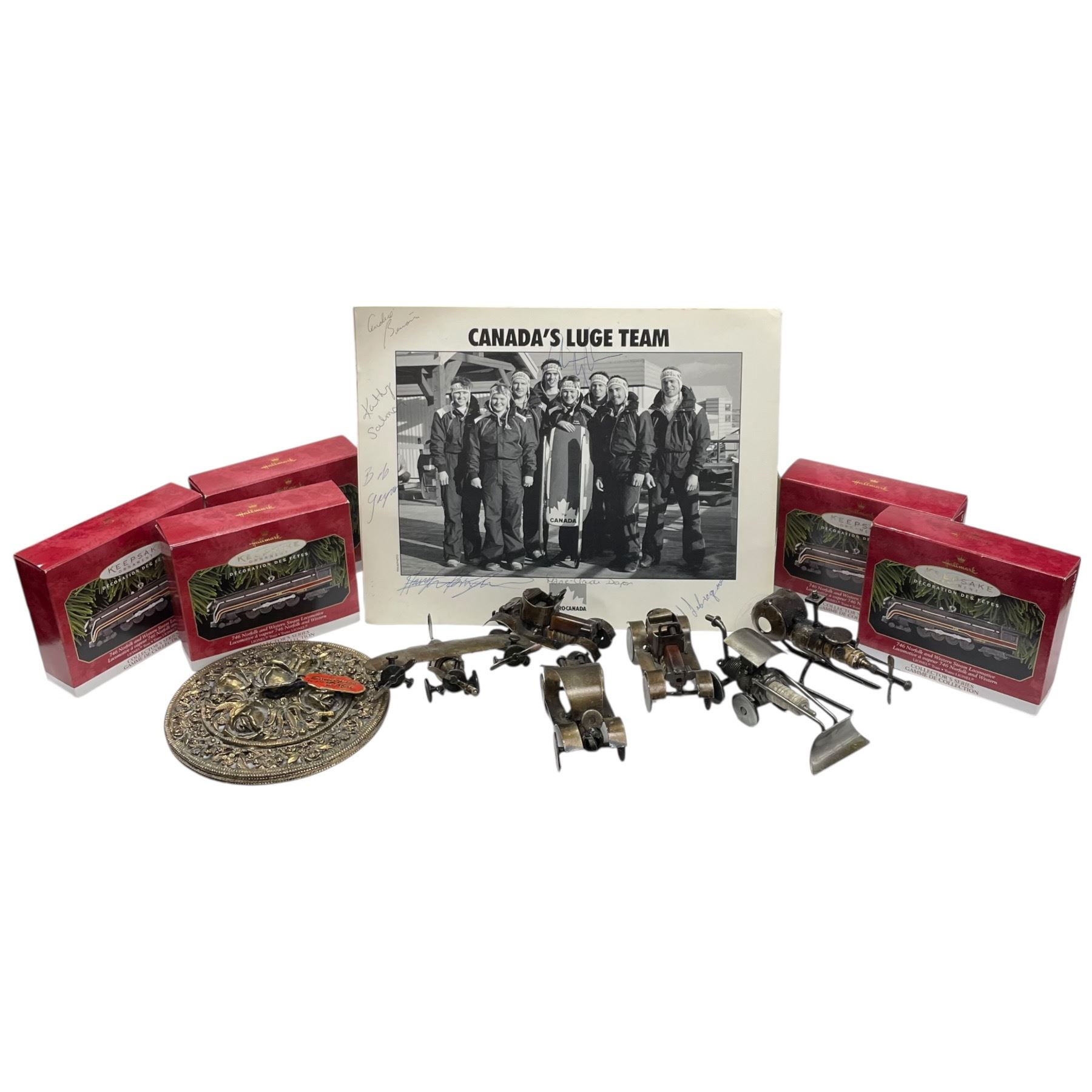 This mixed lot includes Bobsled Team autographs, Hallmark Christmas train ornaments, and spark plug cars. Items are as pictured, providing a mix of collectible autographed memorabilia, festive holiday decorations, and unique automotive-themed collectible cars.