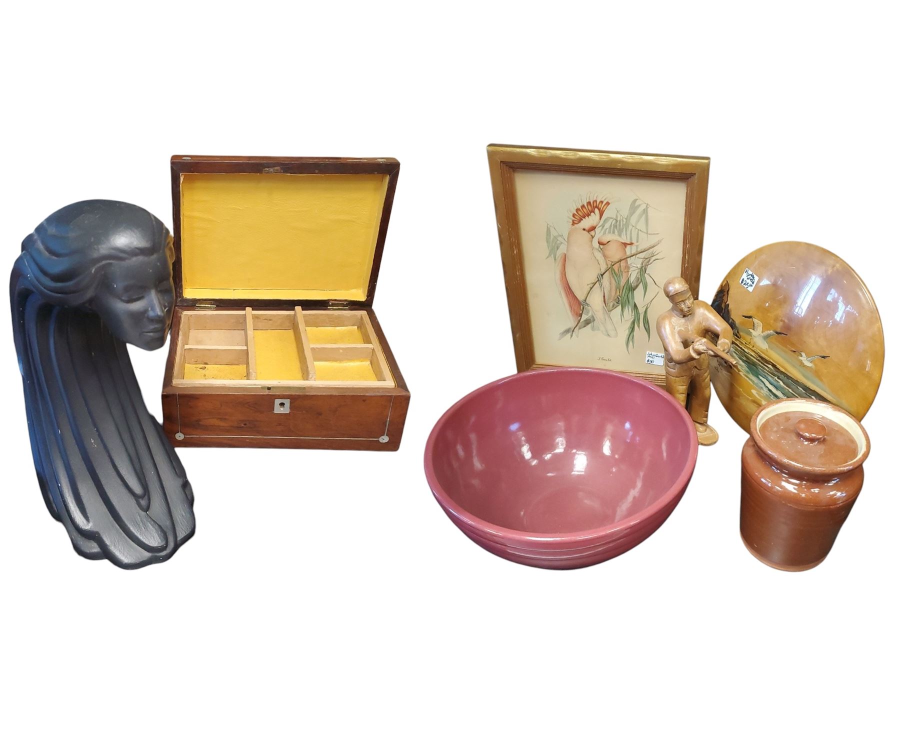 Mixed lot of decorative collectables including a carved wooden box, wooden hunter sculpture, assorted pottery pieces, a ceramic figure of a woman, and a print featuring a parakeet. Items display varied materials and artistic styles. Item is as pictured.