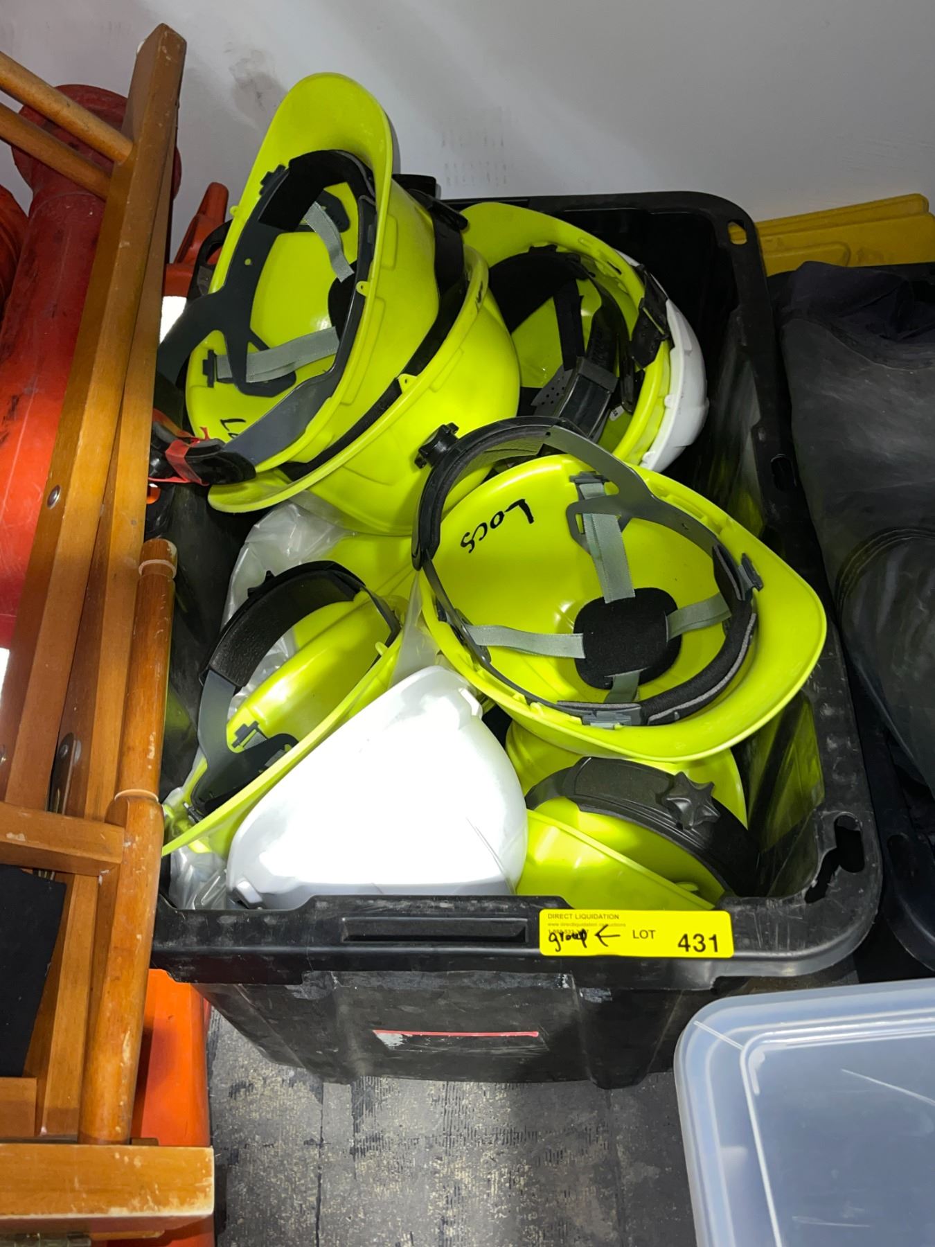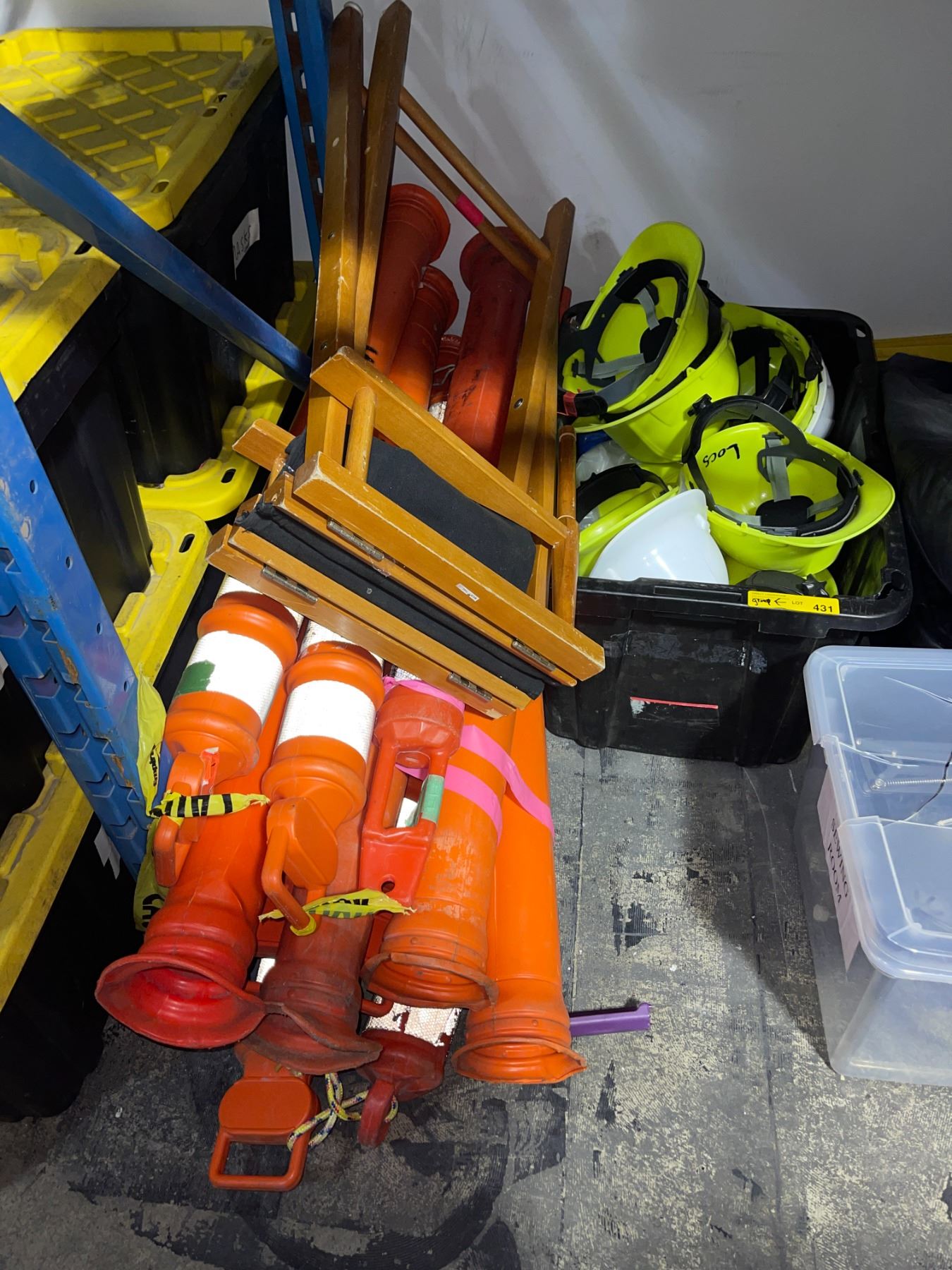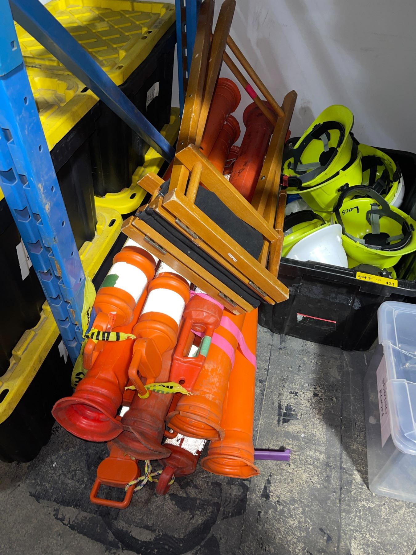 Mixed Lot of Safety Gear Includes Neon Hard Hats and Traffic Cones