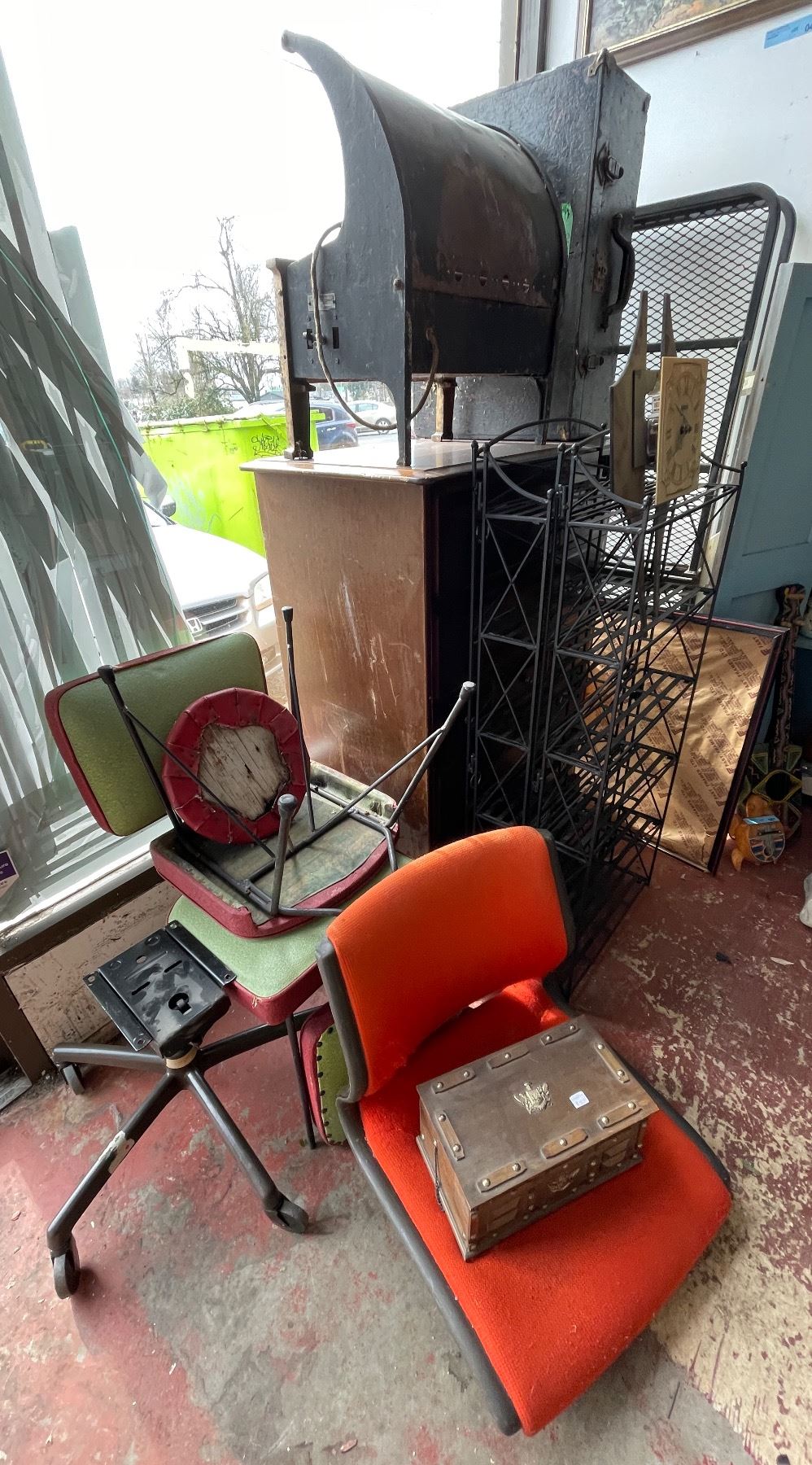 Mixed Vintage DÈcor & Furniture Group - Metal Rack, Drum Roaster, Clock Face, Chairs & Misc.