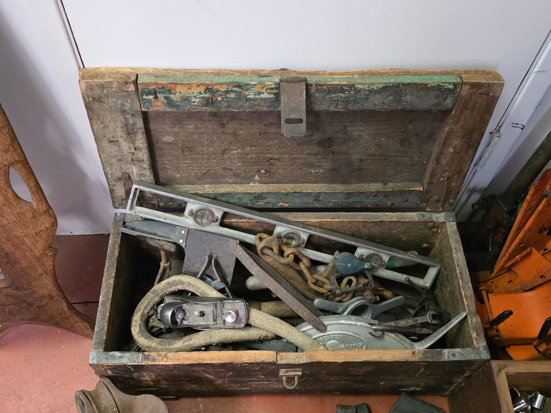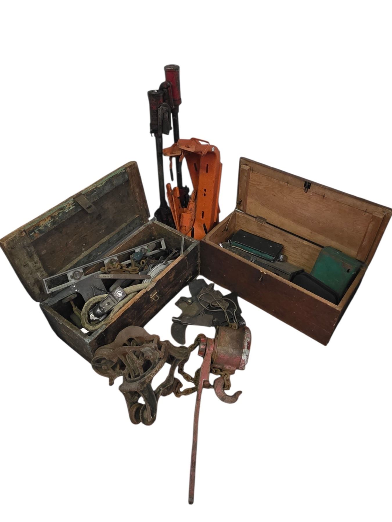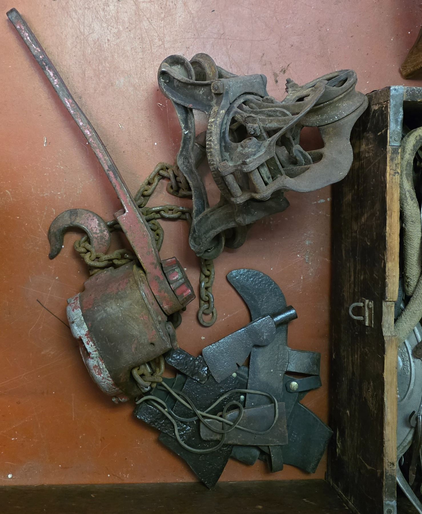 Mixed Vintage Workshop Tools - Chain Hoist, Come-Along, Pulleys, and More