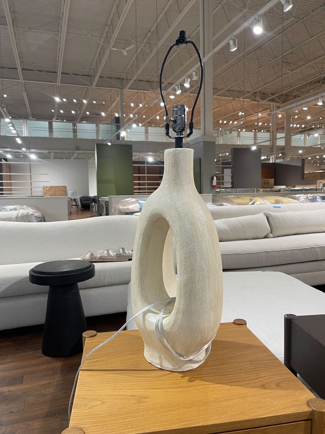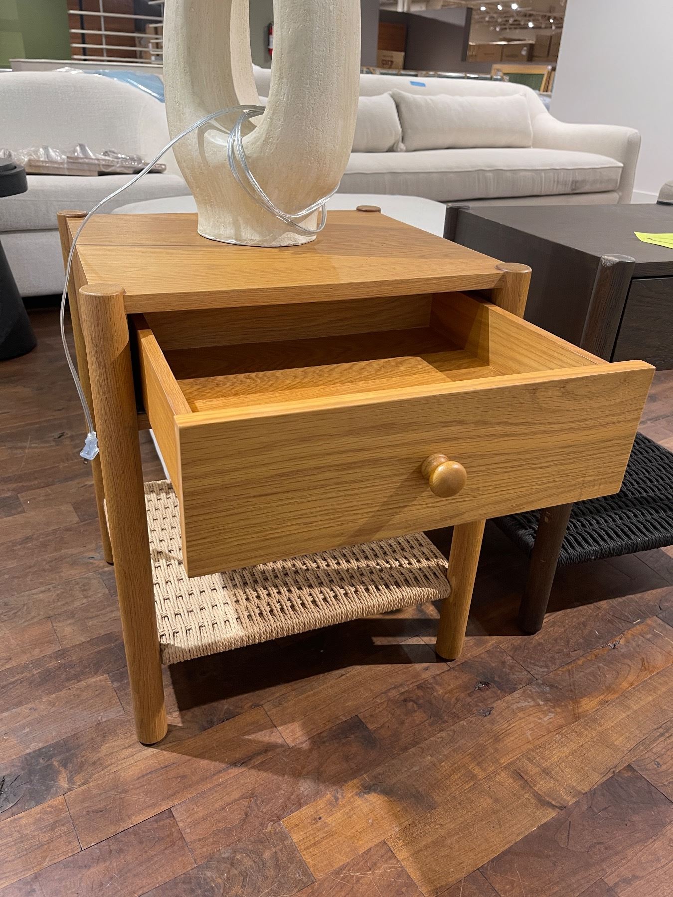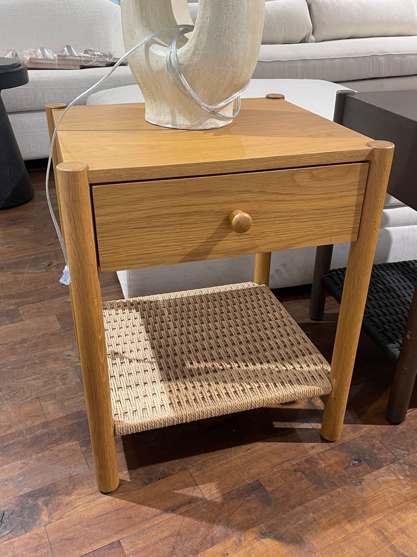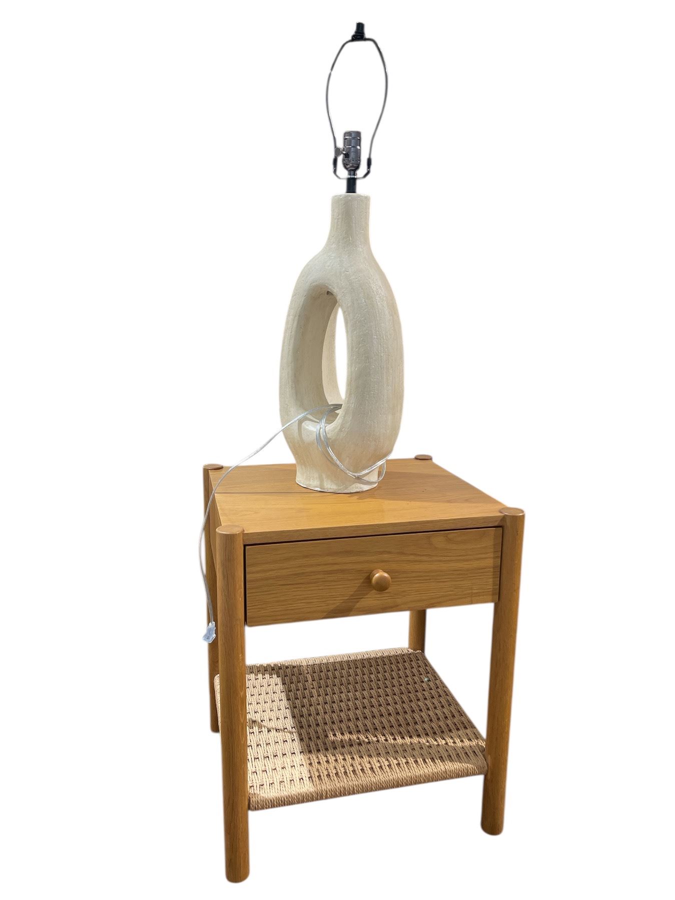 Modern Ceramic Table Lamp with Wooden Nightstand & Woven Shelf - 17.5" L x 19" W x 24" H