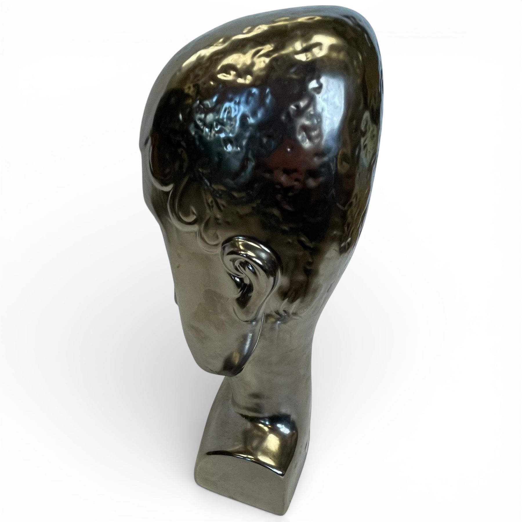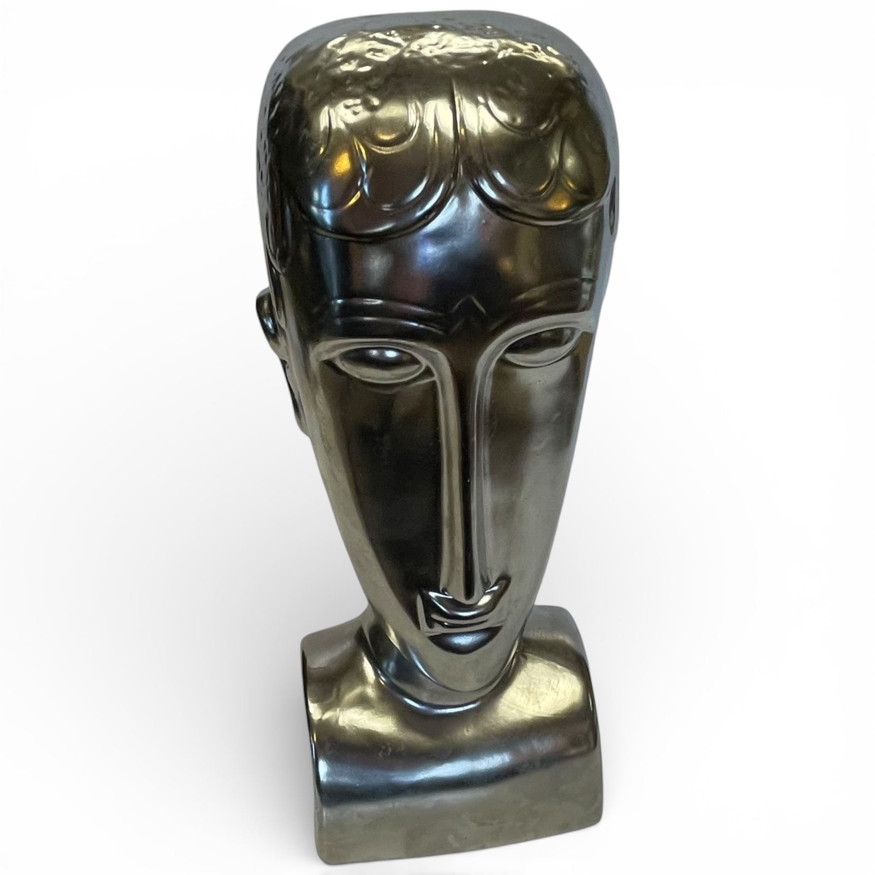 Modigliani-style elongated head sculpture crafted in chrome-finished ceramic. Measures 13-Inch in height. Features stylized proportions inspired by Modigliani's distinctive artistic aesthetic. Item is as pictured.