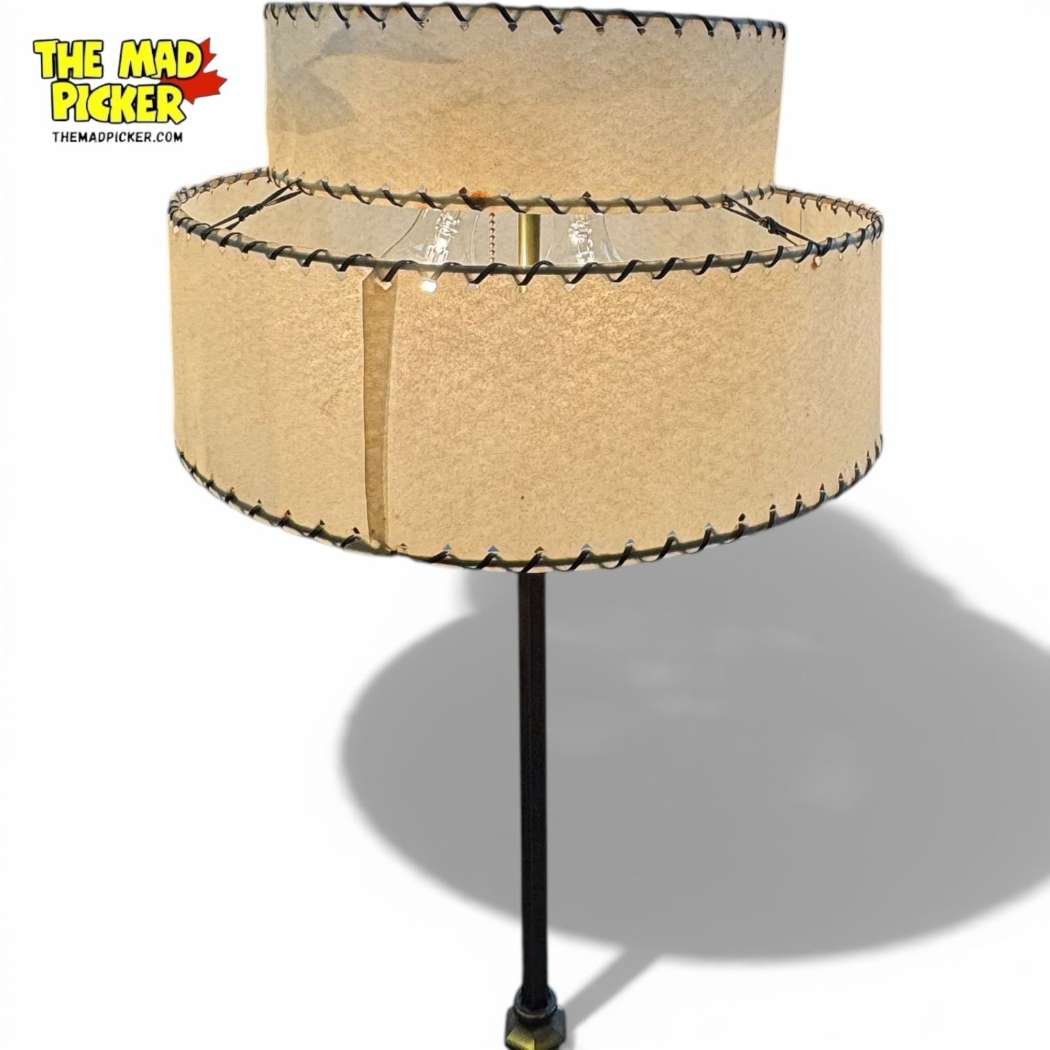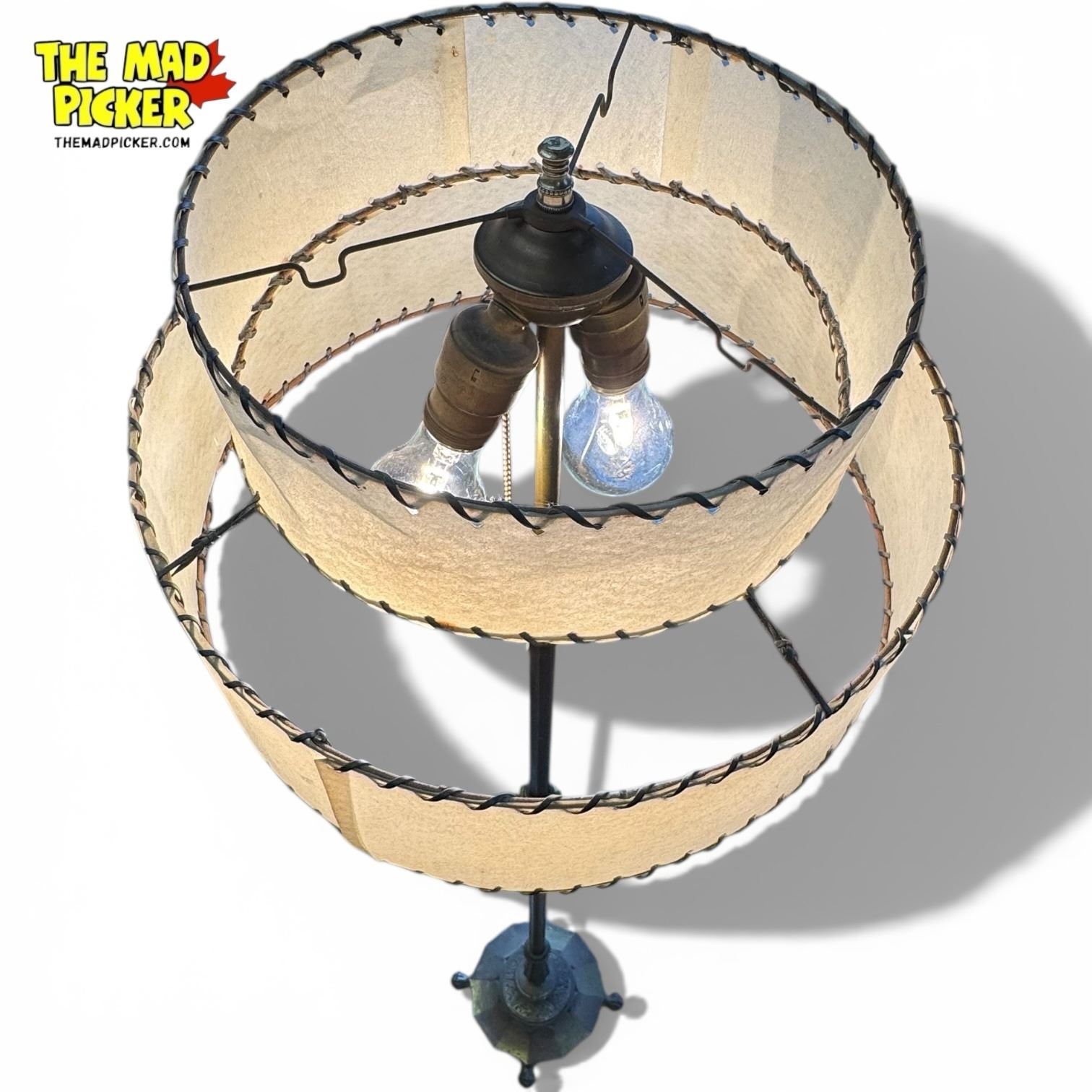 Moe Bridges bridge lamp, circa 1919-1934, produced in Milwaukee, Wisconsin. Double tiered shade and metal base in an Art Deco design. Known for their quality craftsmanship during their short operational span. Moe Bridges Co. specialized in decorative lighting fixtures, including this iconic style.