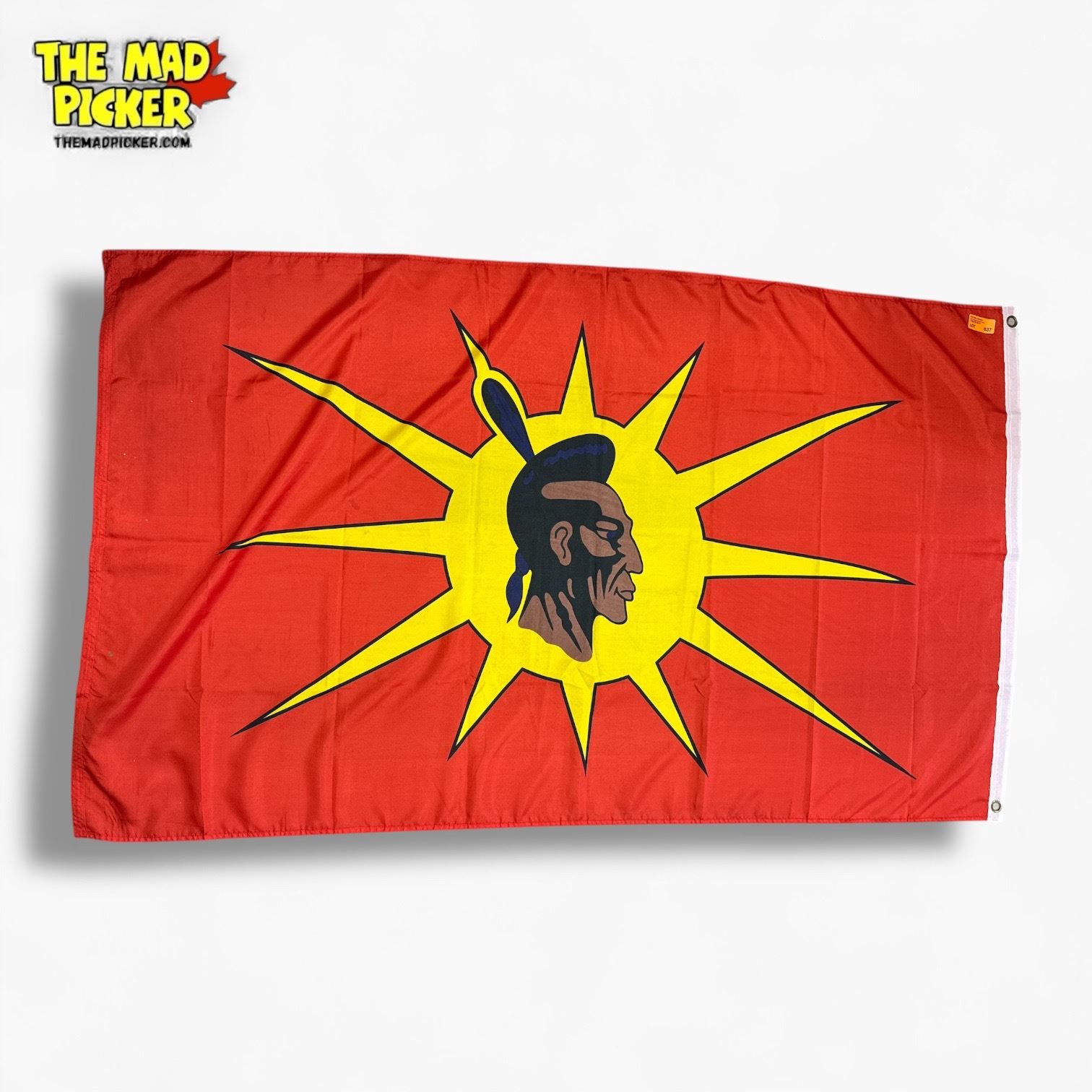 Mohawk Warrior Society Flag in 3x5 FT (90x150 CM) dimensions. Features red background, yellow sunburst, and profile of a Mohawk warrior with single feather. Symbolizes unity, resistance, and sovereignty. Designed by Karoniaktajeh Louis Hall in 1974, updated in the 1980s, and recognized during the 1990 Oka Crisis.