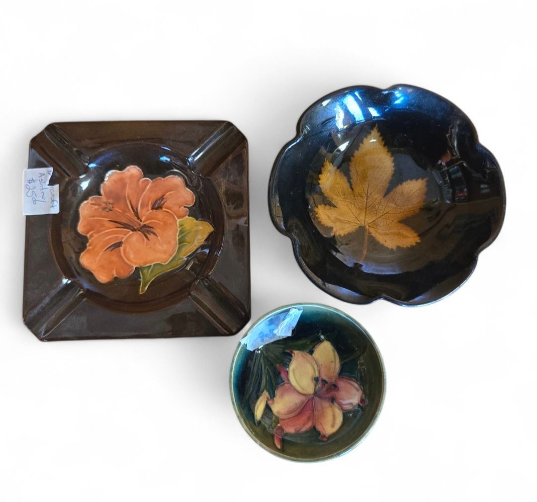 This lot includes a Moorcroft bowl and ashtray known for their distinct ceramic craftsmanship from England. Also included is a Chinese Jizhou Kiln porcelain bowl, showcasing traditional Chinese kiln techniques. Items are as pictured.