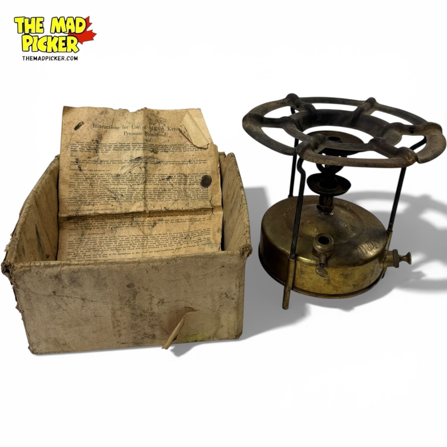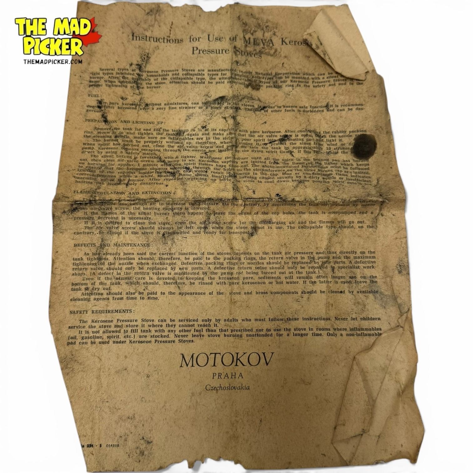 Motokov Praha kerosene camp stove made in Czechoslovakia. Constructed from brass, designed for outdoor cooking. Mid-20th century production. Features a durable brass tank with burner assembly. Known for its reliability in camping and outdoor activities.