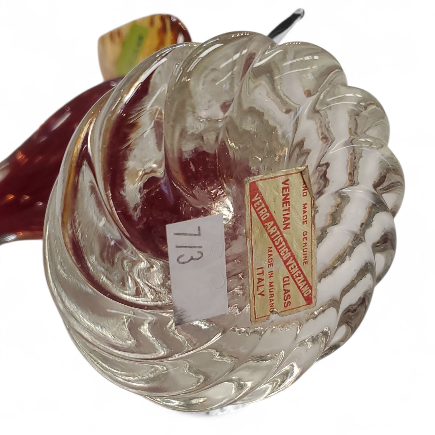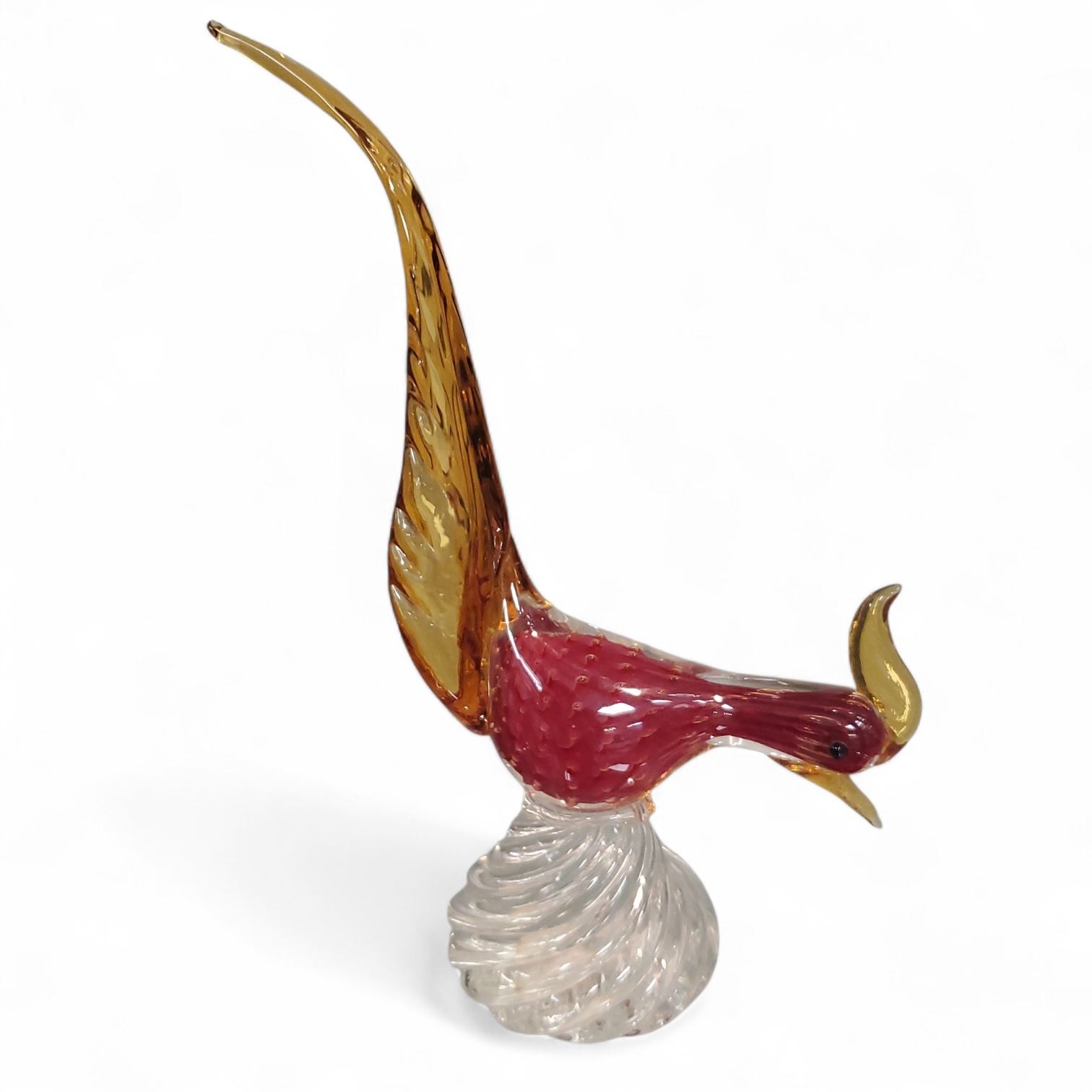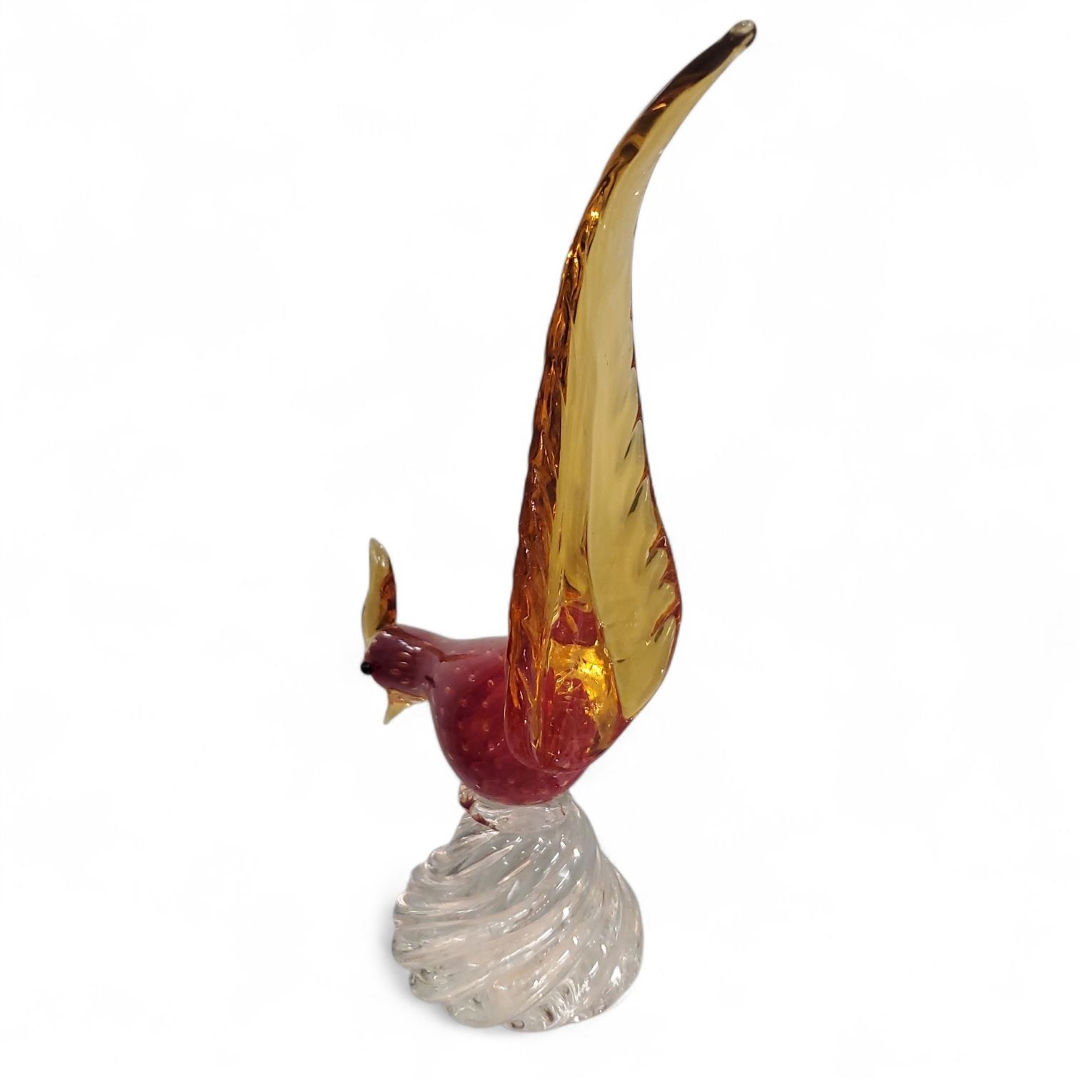 Vintage hand-blown Murano art glass pheasant figurine, 1950s-1960s. Features red and amber/gold body with gold flecks, clear glass base. Recognized as Italian art glass, often unmarked. Measures 9.5 inches tall. Mid-century Venetian craftsmanship.