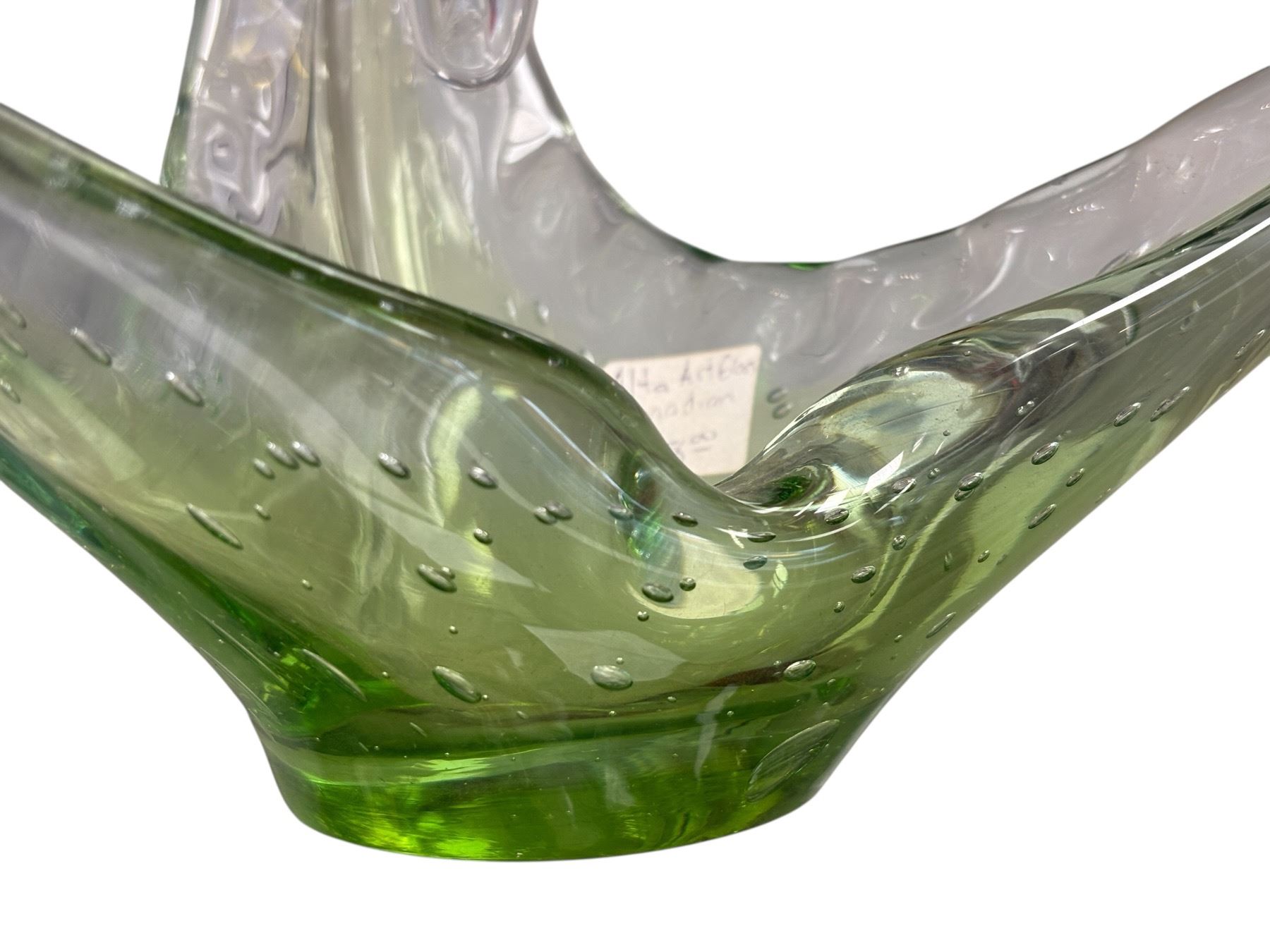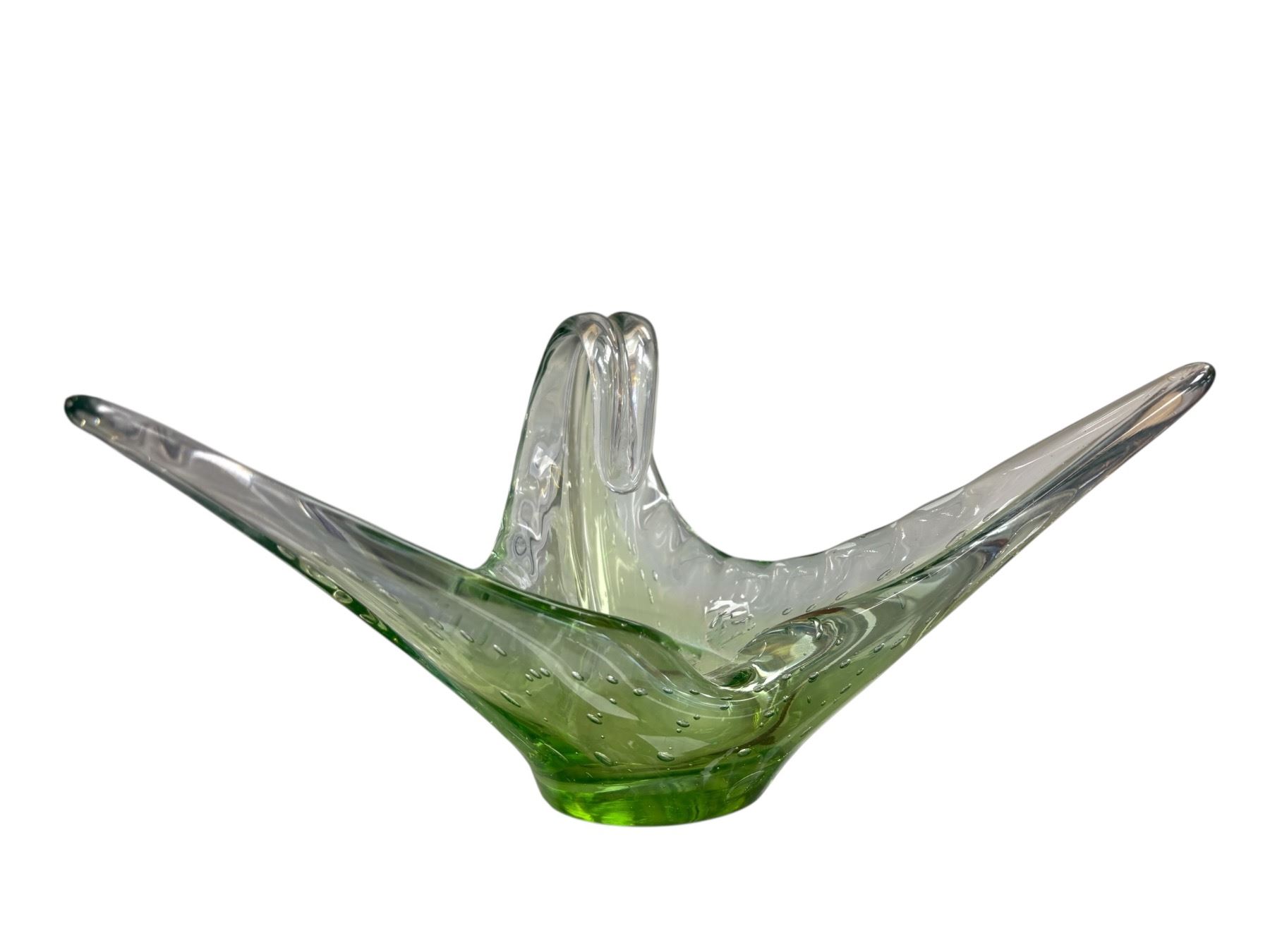 Murano style art glass centerpiece with controlled bubble design and light green splash pattern. Measures approximately 6 inches in height. Crafted with intricate glasswork techniques, the piece showcases a textured blend of color and bubble inclusions characteristic of Murano-inspired designs.