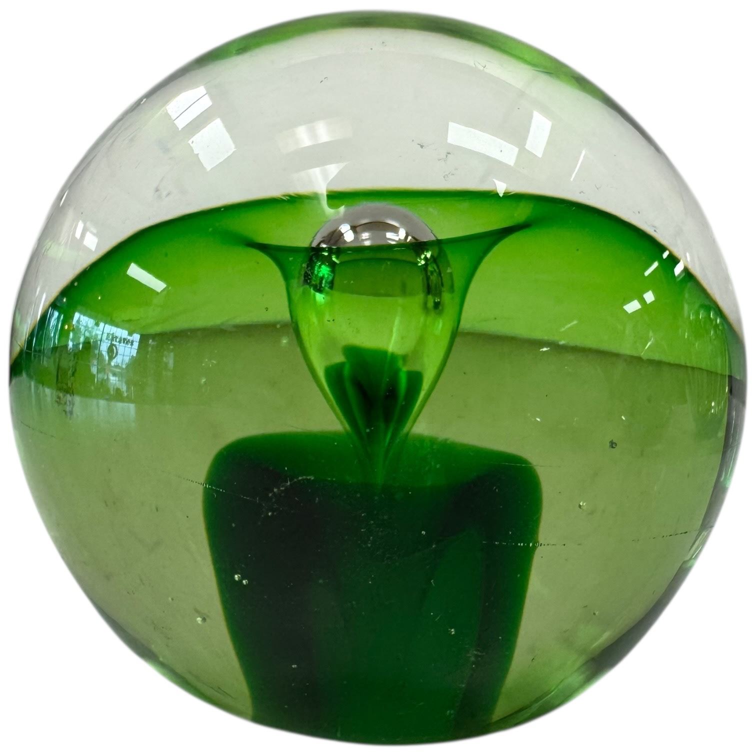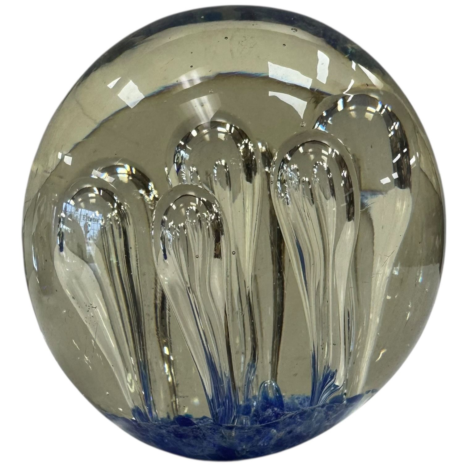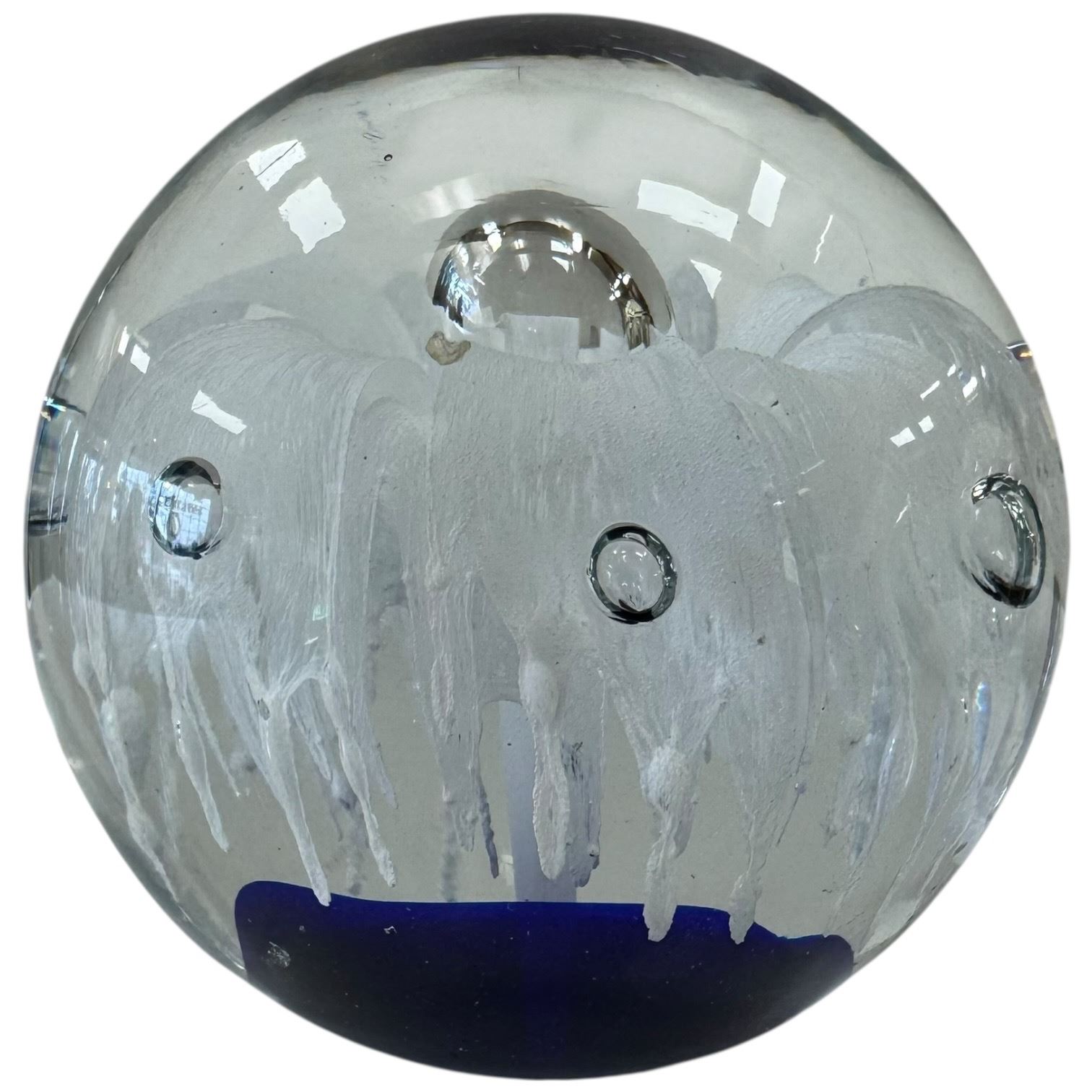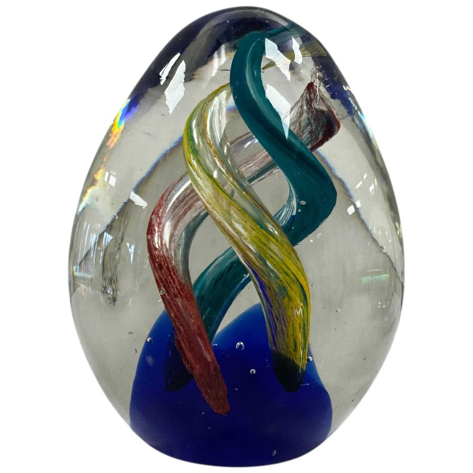 Set of four Murano style art glass paperweights featuring vibrant colors and patterns. Each piece is individually crafted with unique designs reminiscent of Murano artistry. Includes a variety of shapes and decorative details. Item is as pictured. Unsigned
