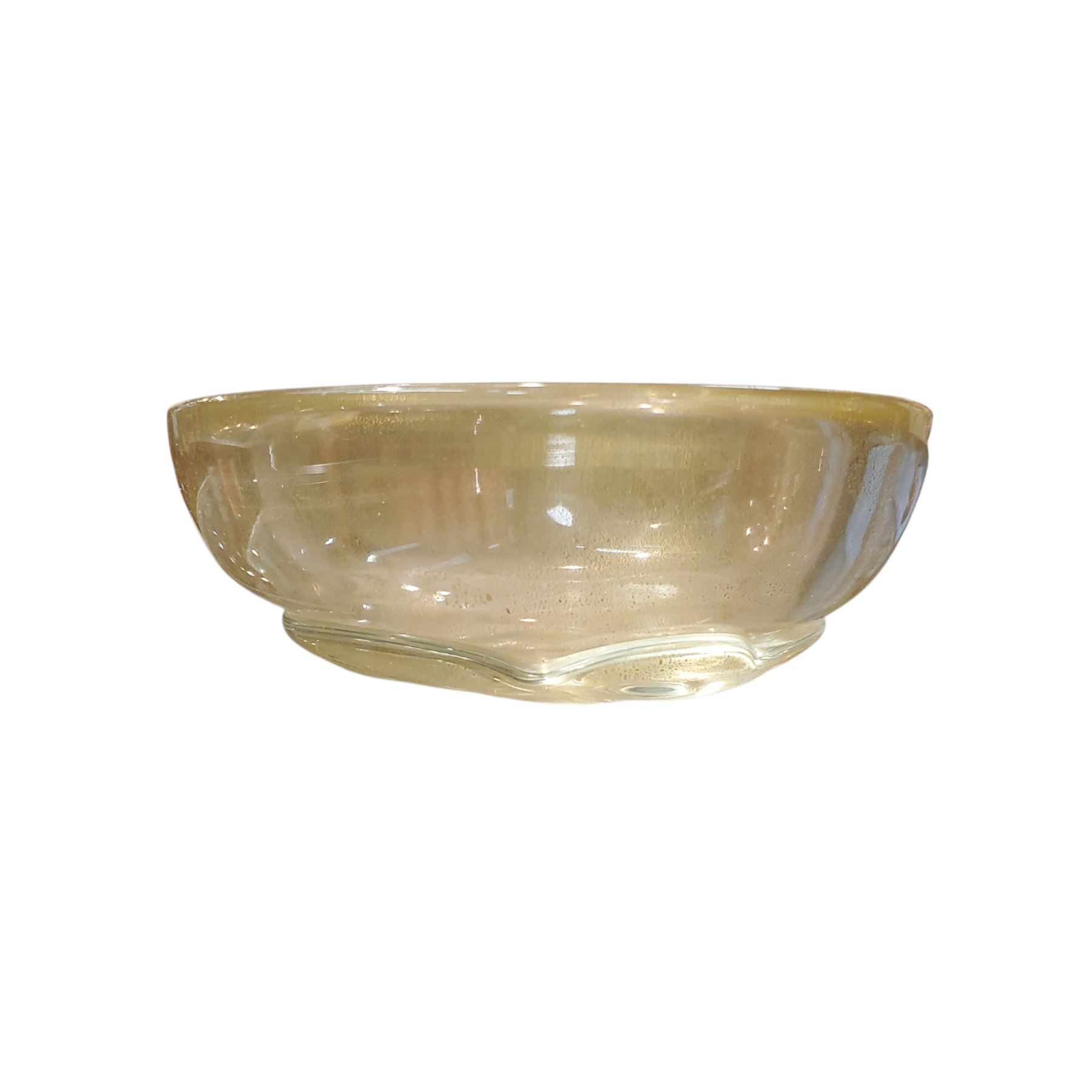 Murano style art glass bowl featuring vibrant gold fleck detailing throughout. Measures 6.5 inches across. Handcrafted with a wavy, organic form. The piece is unsigned, indicating it is in the style of Murano glass but without confirmed authorship. Elegant decorative item with intricate craftsmanship.