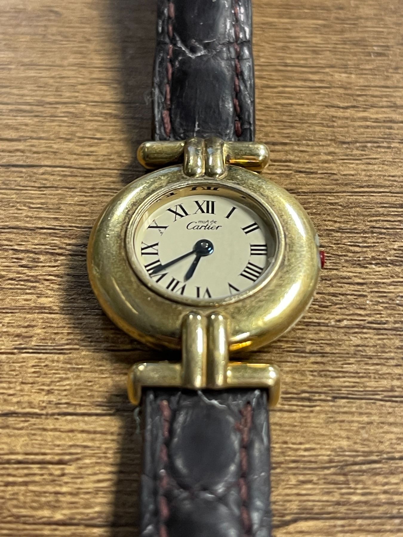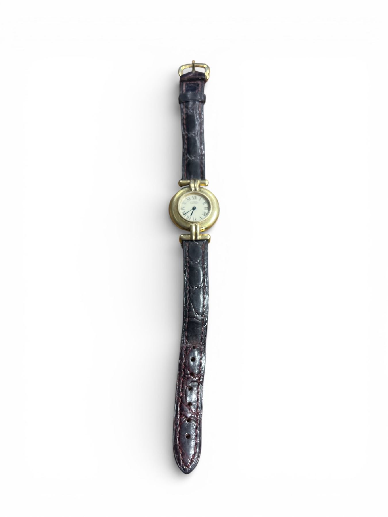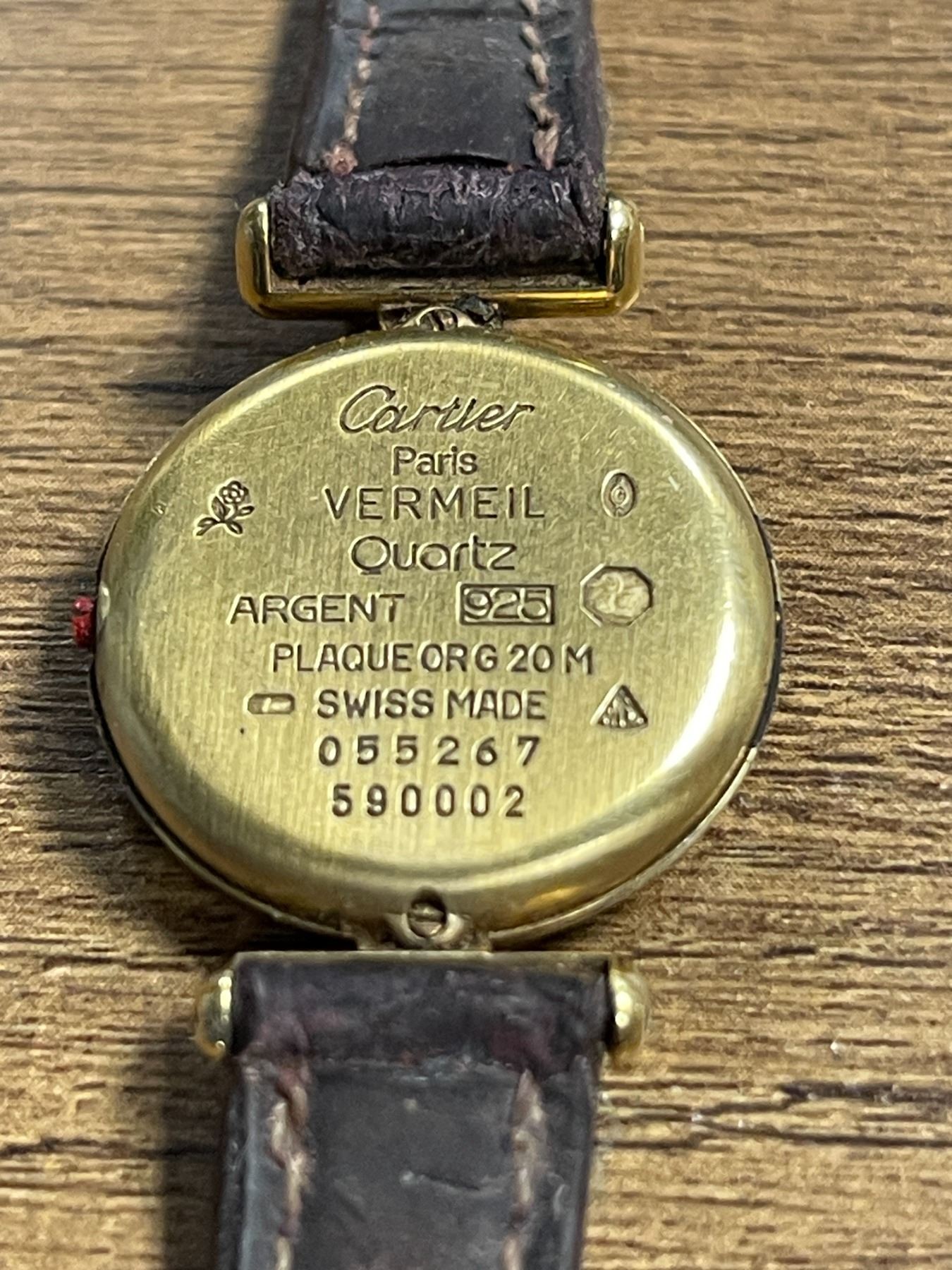 Must de Cartier vermeil over sterling silver 24 mm watch with a cream dial, Back Roman numerals and a brown leather strap. Missing its winding crown & pin stem. - Appraised Value $600