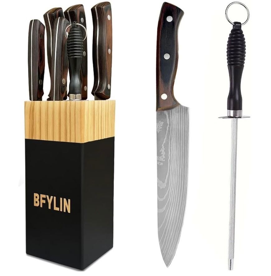 NEW 7-pcs Wood & Black Stainless Steel Chef Knife Set