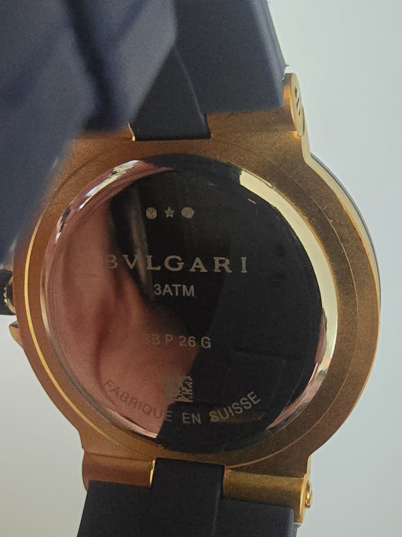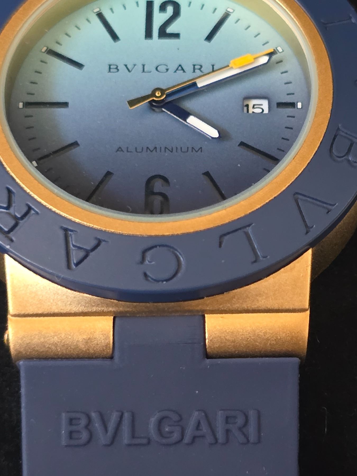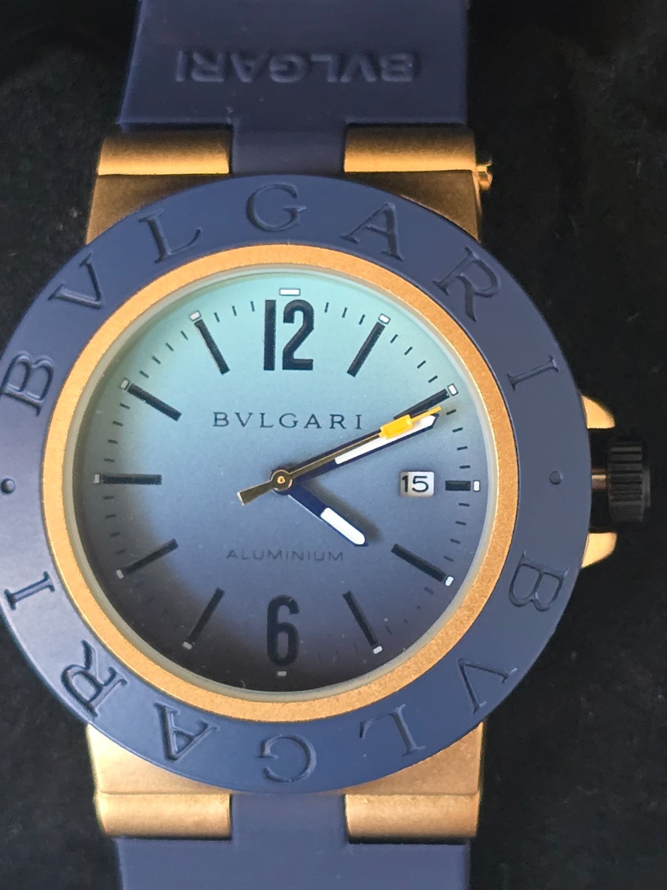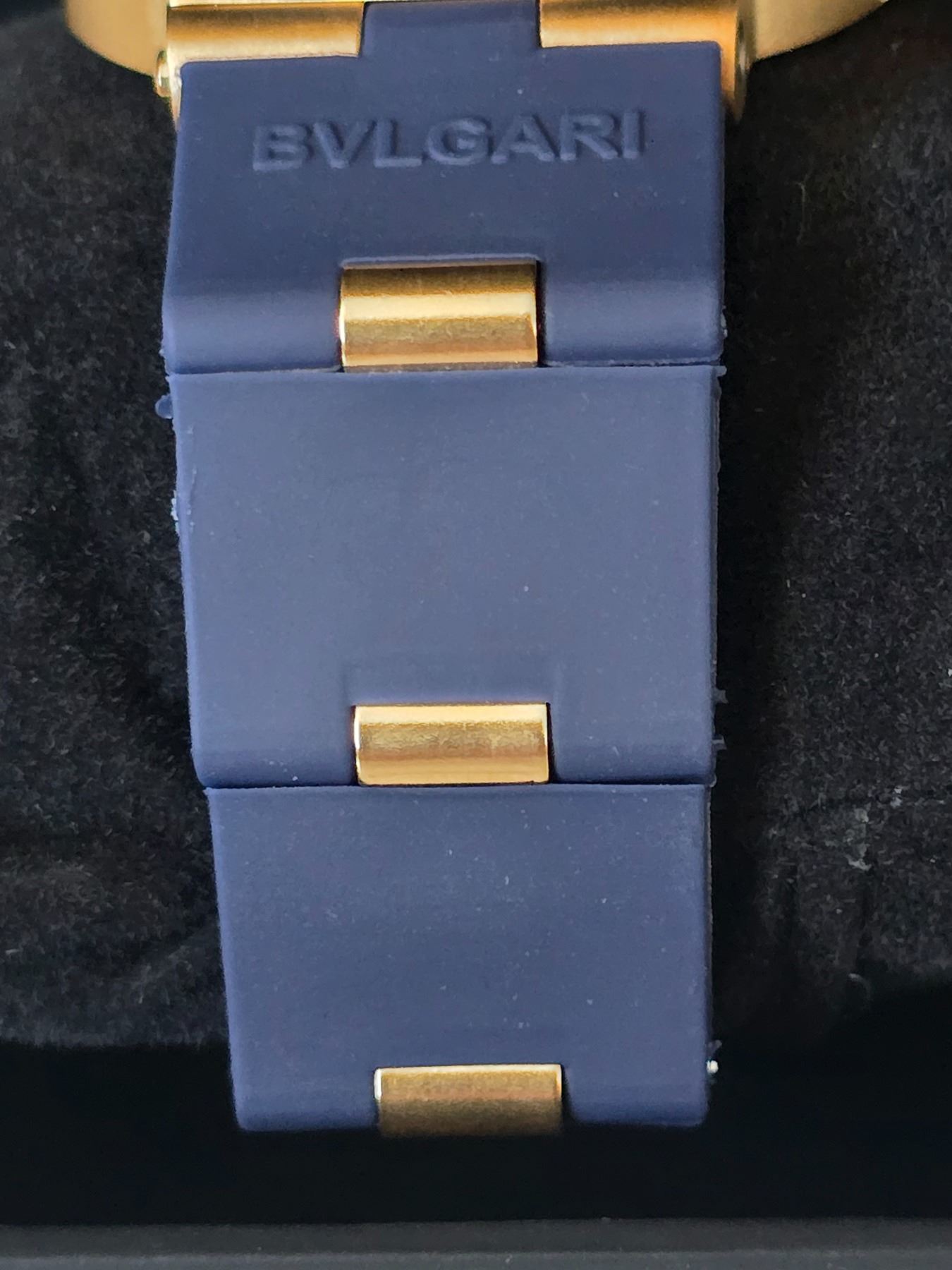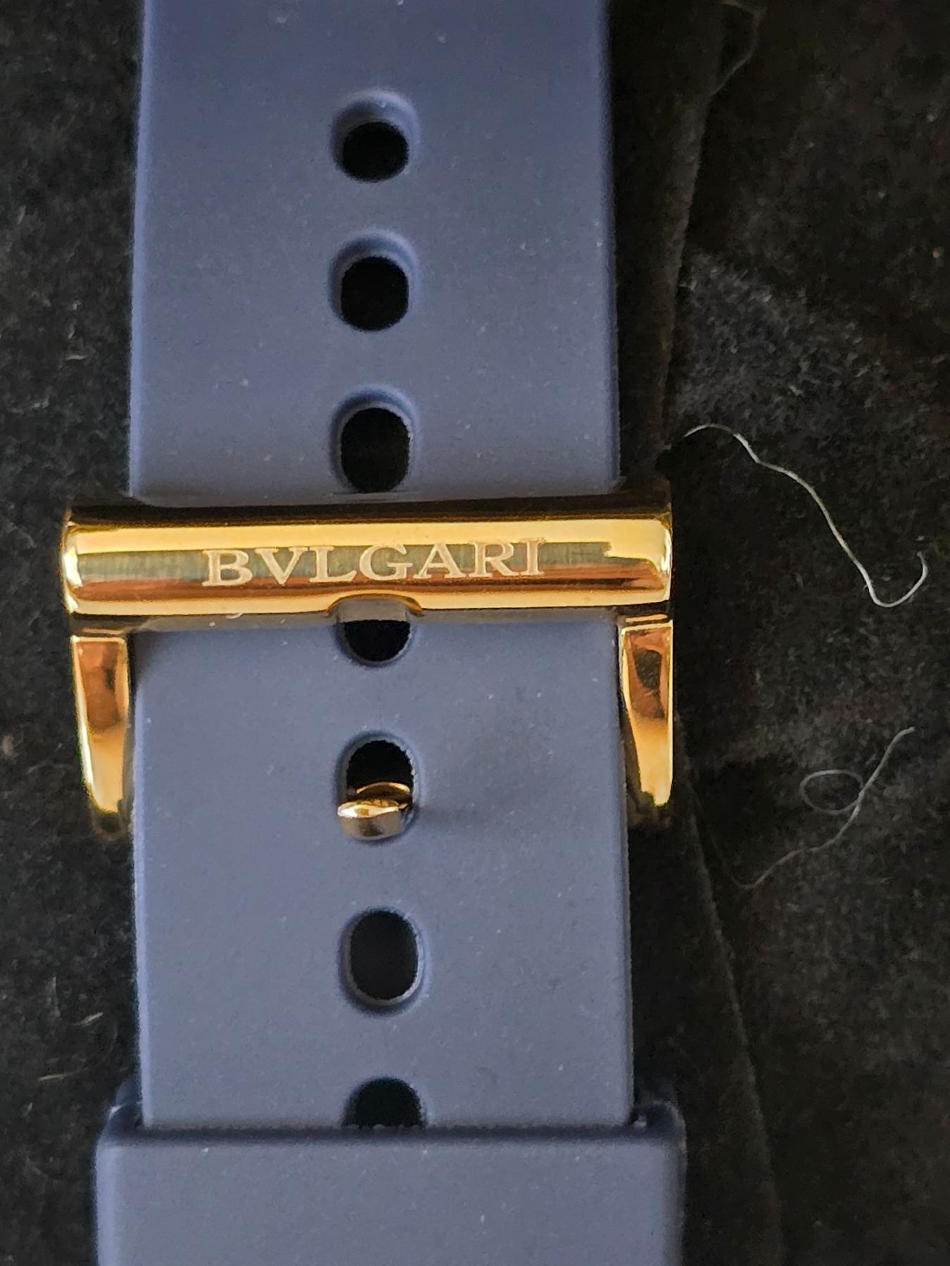 NEW QUARTZ BVLGARI LUXURIOUS REPLICA WATCH. BLUE DIAL. BLUE BEZEL WITH YELLOW INSIDE RING. STAINLESS-STEEL CASE. BLUE RUBBER FLEX STRAP. NEW IN BOX