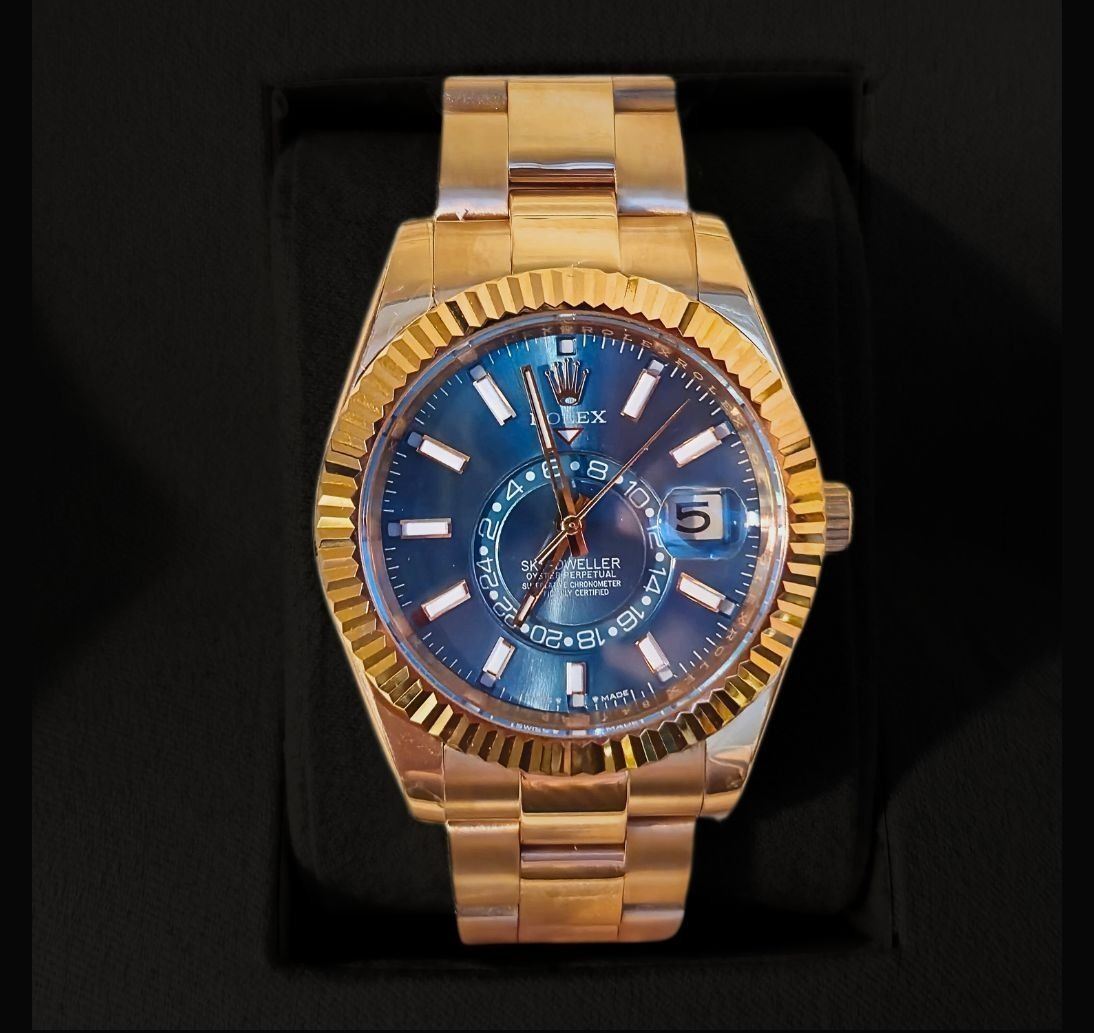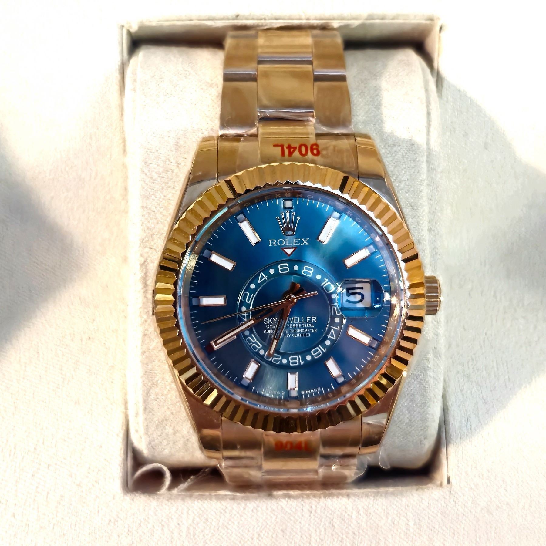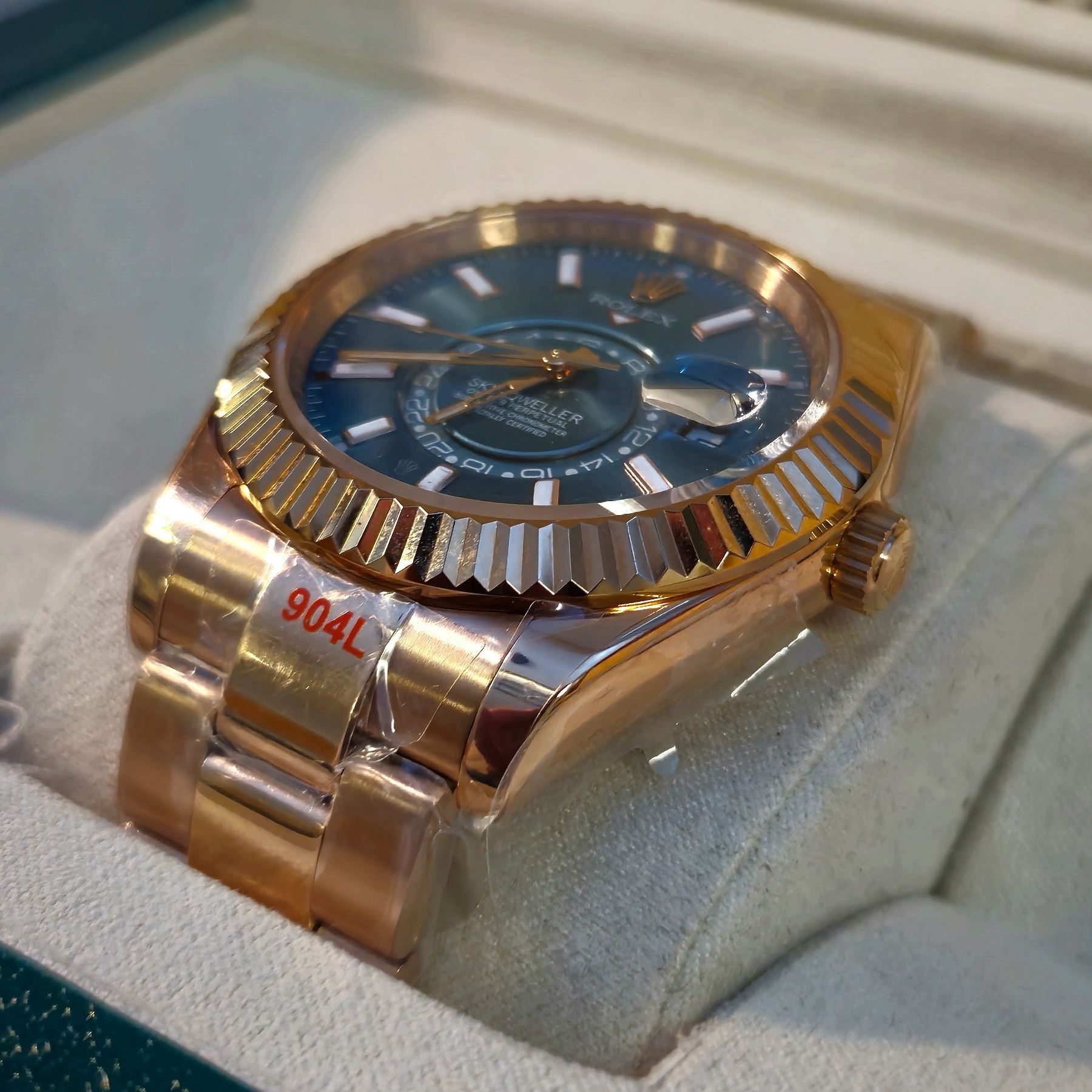 ROLEX Sky-Dweller, Blue Green Dial, Rose Gold Bezel – Super Clone. Brand New Watch With Complete Box And Paper Set. Sky Dweller has the most sophisticated watch movement in the Rolex world. Brand New w/ Display Box