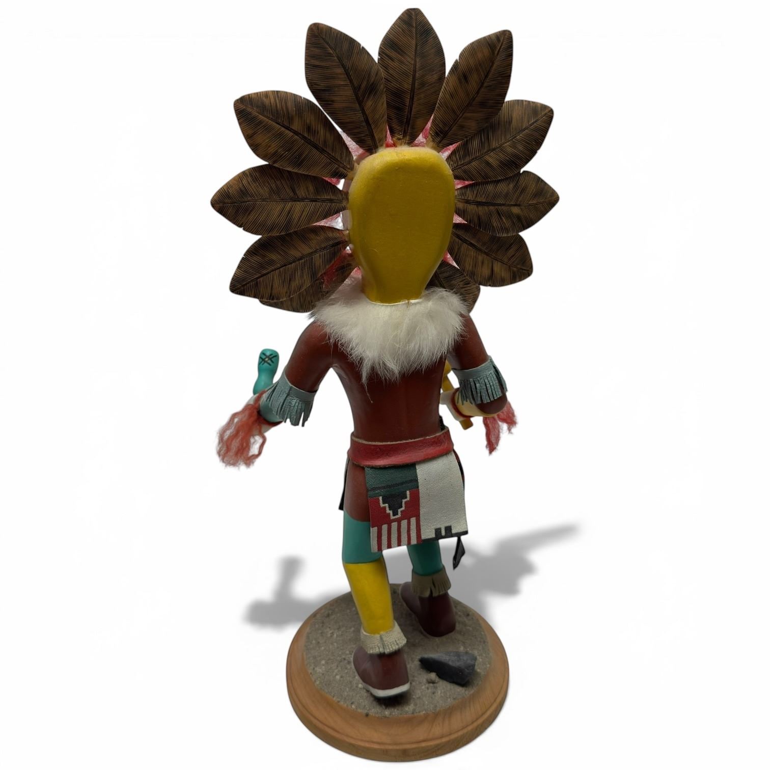 Native American Sun Kachina Doll representing Tawa, the creator spirit of the sun. Traditionally hand-carved by Hopi artists from cottonwood root. Features a large circular feather-like headdress symbolizing sun rays. Represents rain, fertility, and health. Height: 14-Inch.
