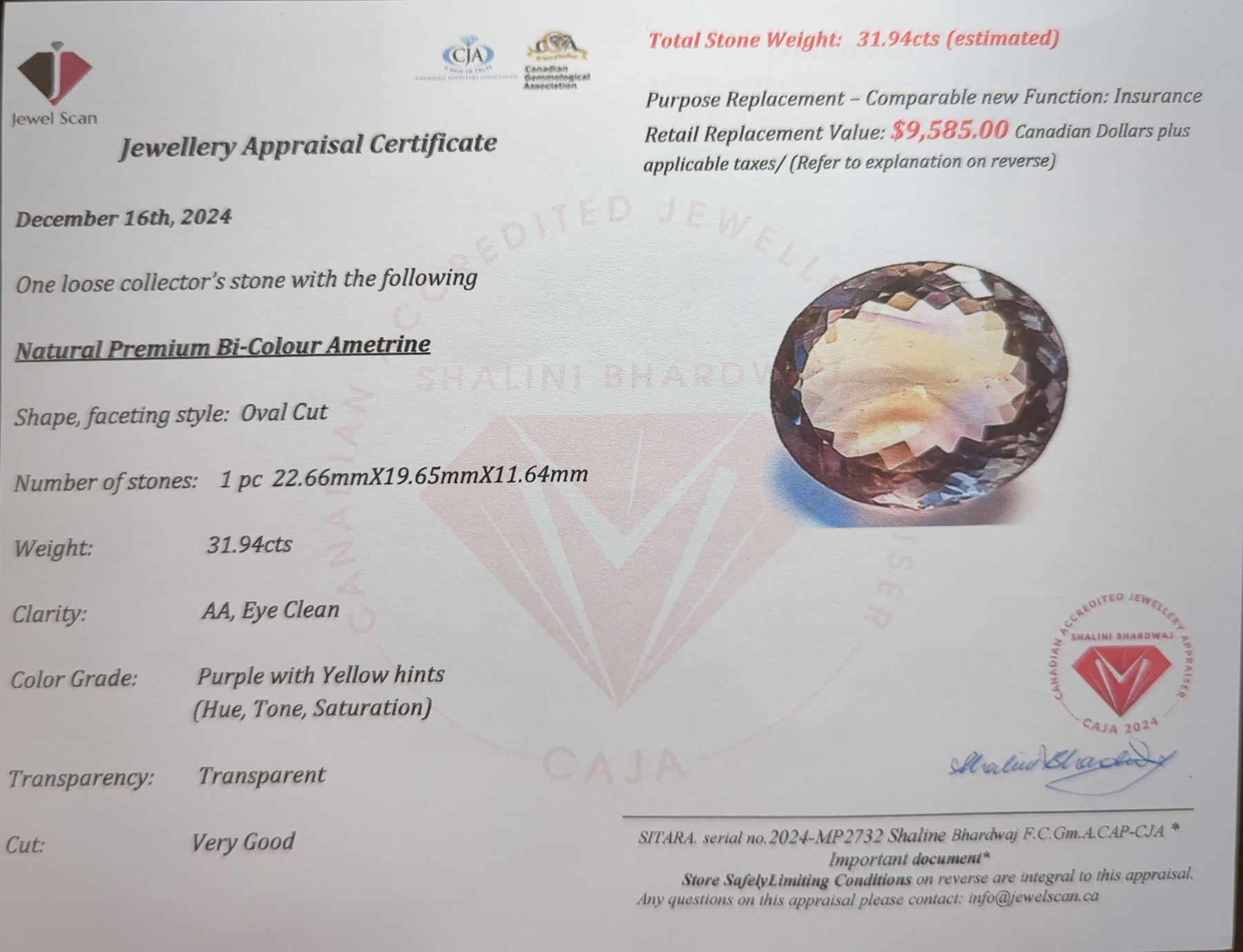 Natural Premium Bi-Colour Ametrine Shape, faceting style: Oval Cut Number of stones: 1 pc 22.66mmX19.65mmX11.64mm Estimated Retail Replacement Value: $9,585.00 CAD