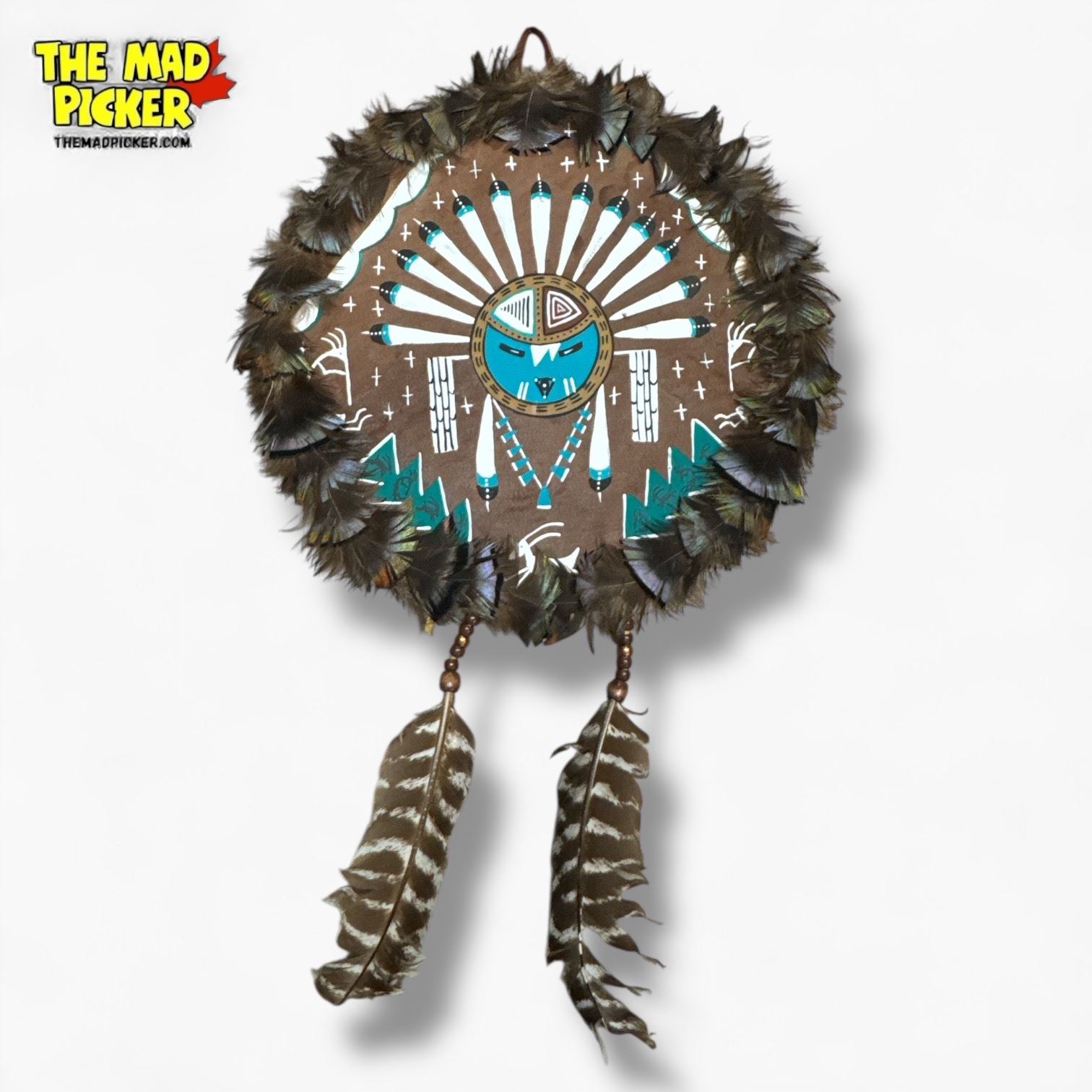 Navajo style dream catcher measuring 12 inches in diameter. Constructed with dyed buckskin leather and featuring traditional woven webbing. Decorative elements may include beads and feathers, embodying symbolic purposes in Native-inspired design.