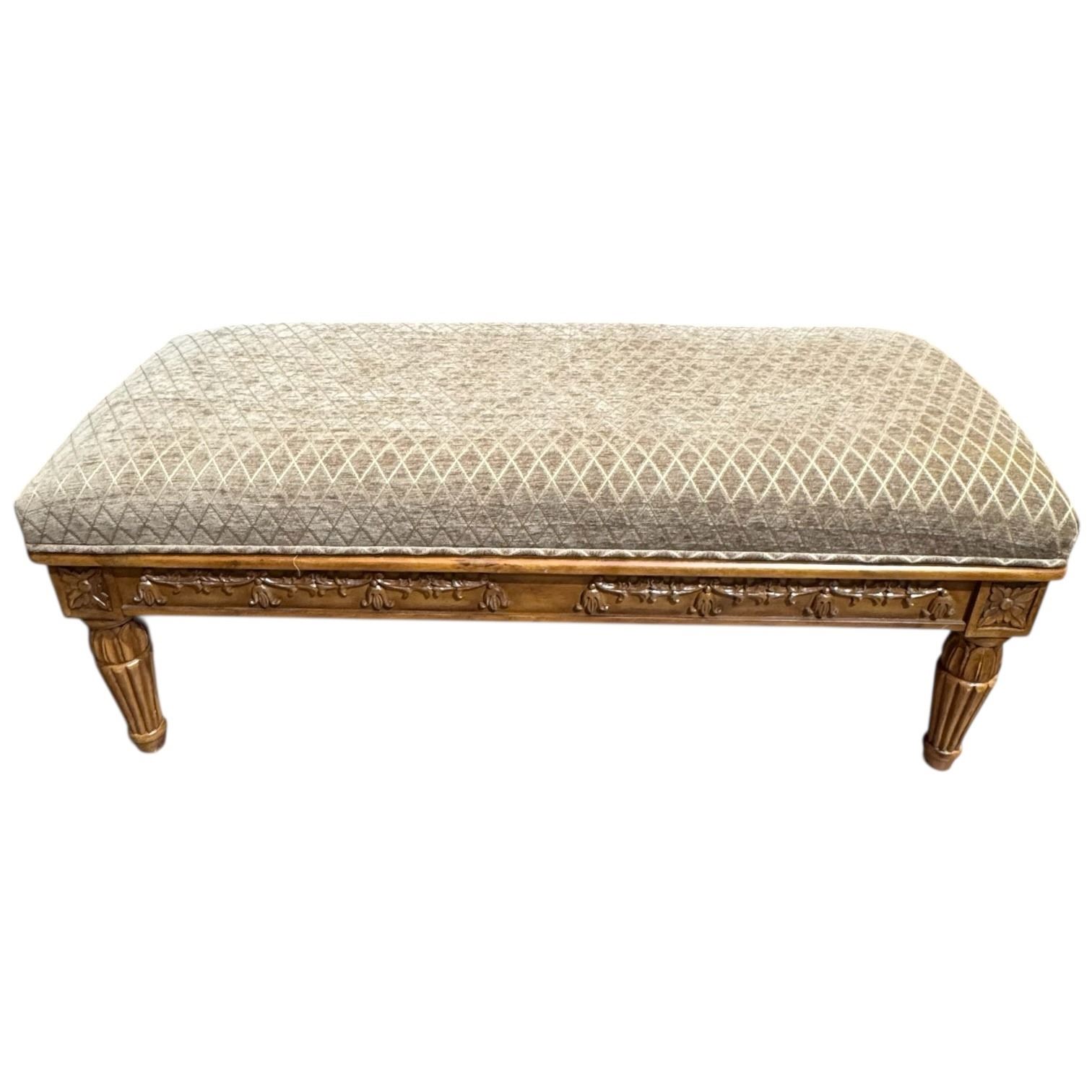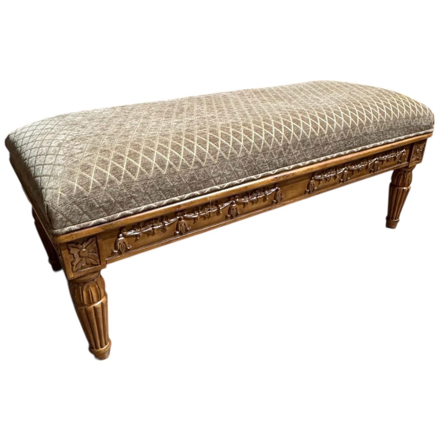 Neoclassical design bench with carved wooden legs and soft upholstered seating. Combines ornamental craftsmanship with functionality, inspired by classical influences. Dimensions are 48 In length, 21 In width, and 19 In height. Upholstery material and details as pictured. Item is as pictured.
