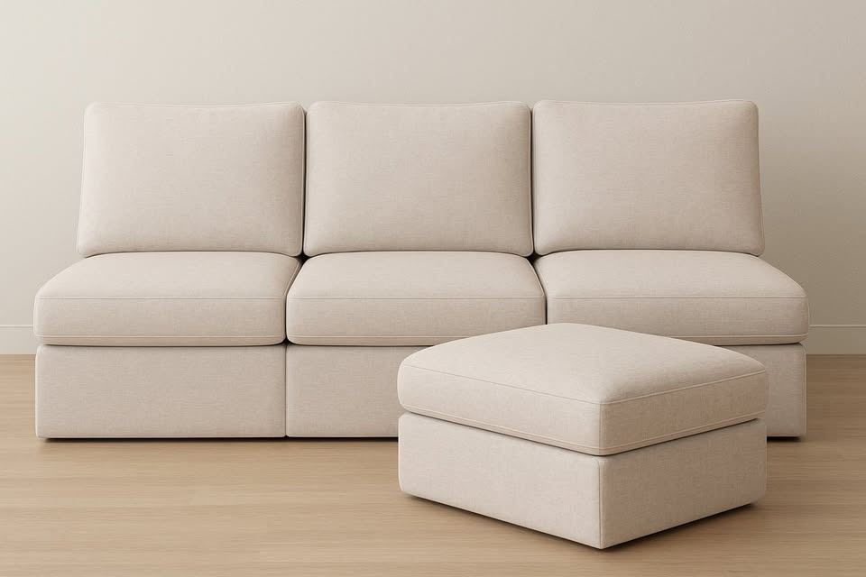 New 4pc. Moes Justin Lounge Modular Sofa, Light Taupe. 3 x slipper chair and 1 x ottoman. All new in boxes. 114" wide, retail value is $5,750.00