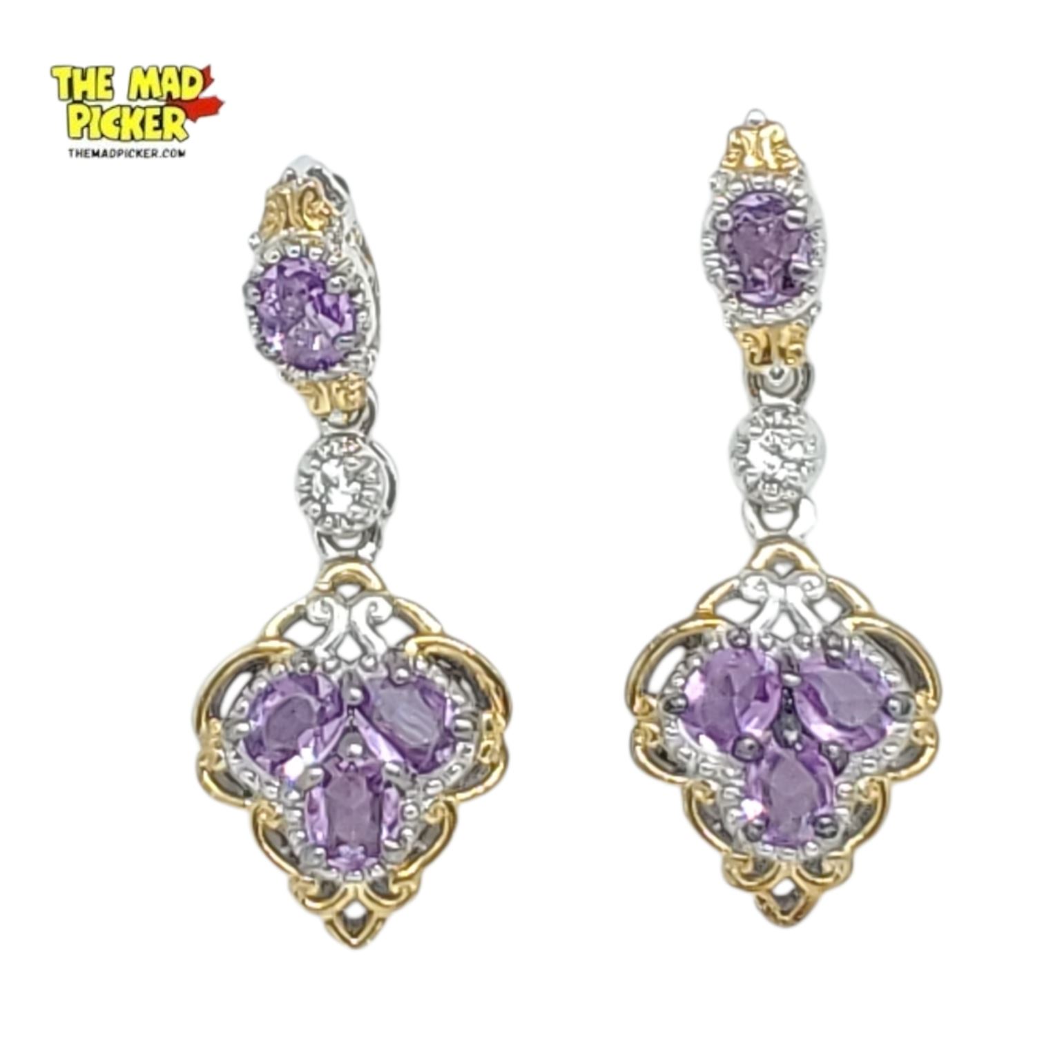 New .925 Silver Amethyst & Crystal Earrings with Gold-tone Accents for Pierced Ears - 1.25" Long