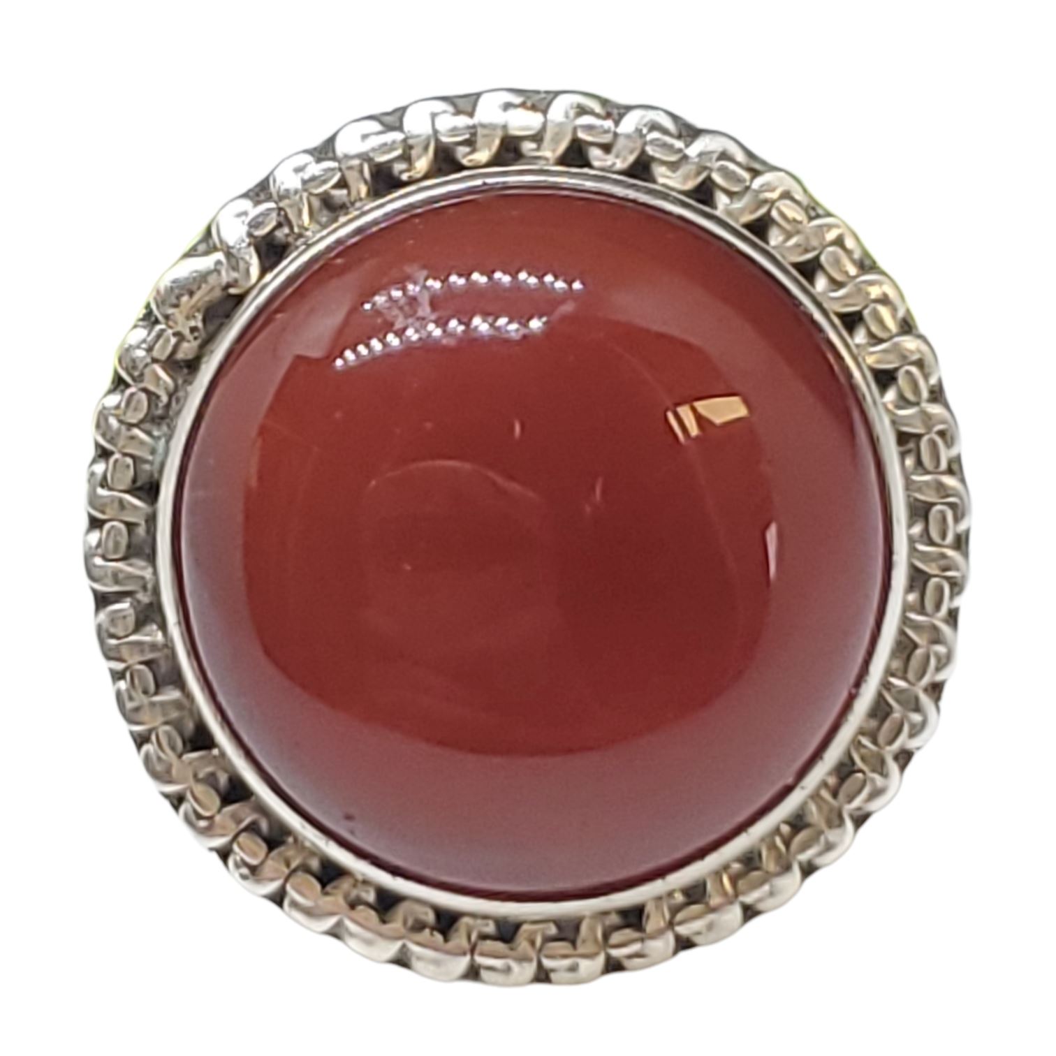 New Carnelian Cabochon Ring Set in .925 Sterling Silver - Size 9 ring is 23mm diameter - Total weight including gem: 7.9 grams
