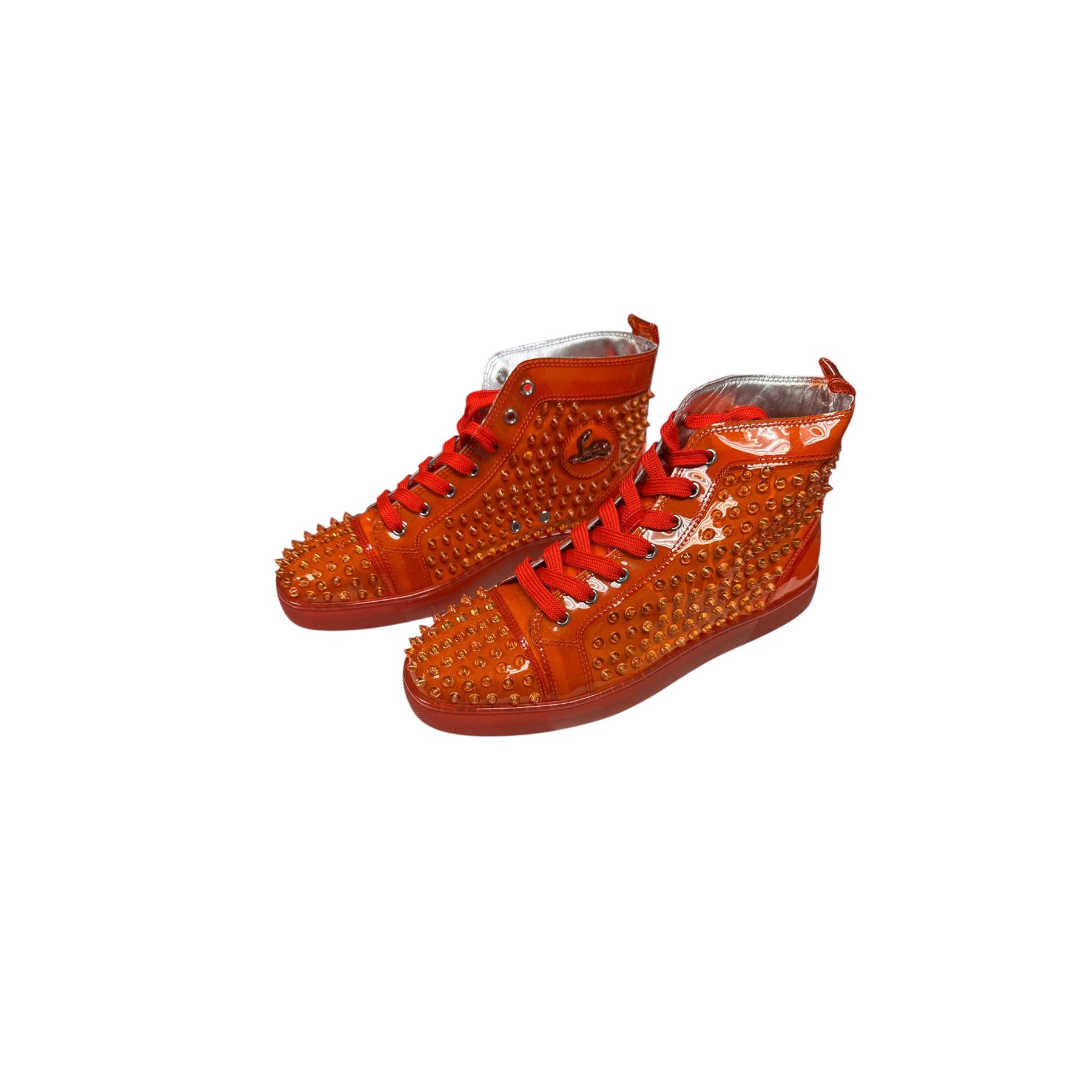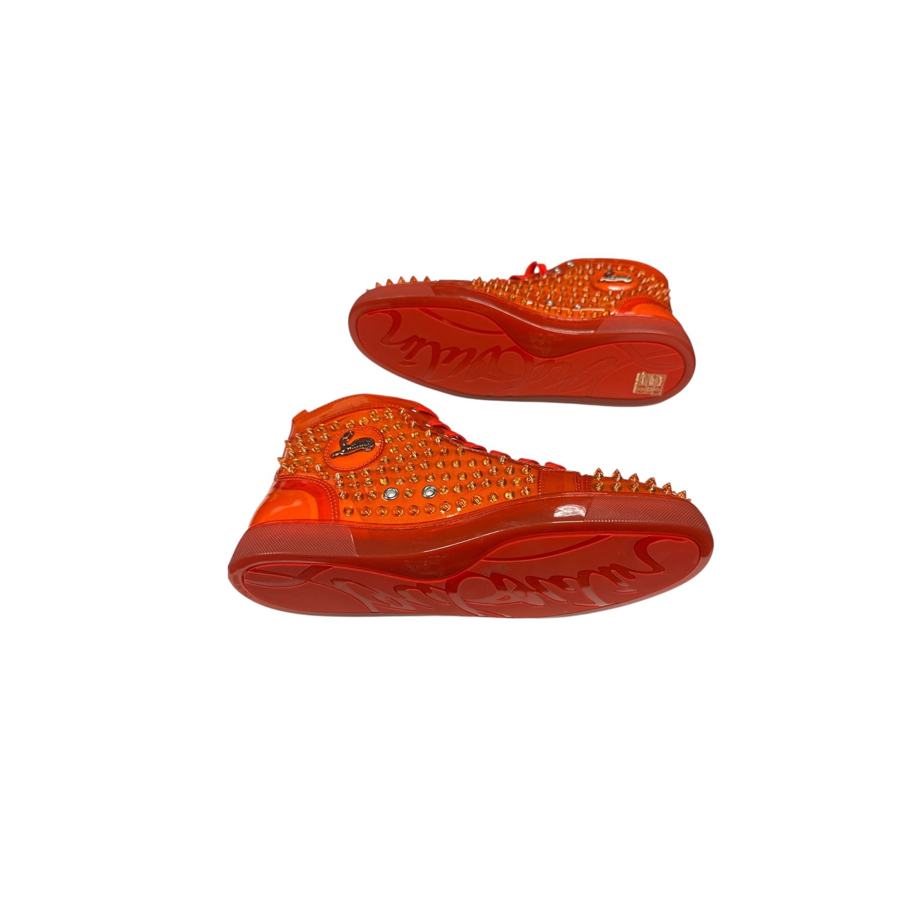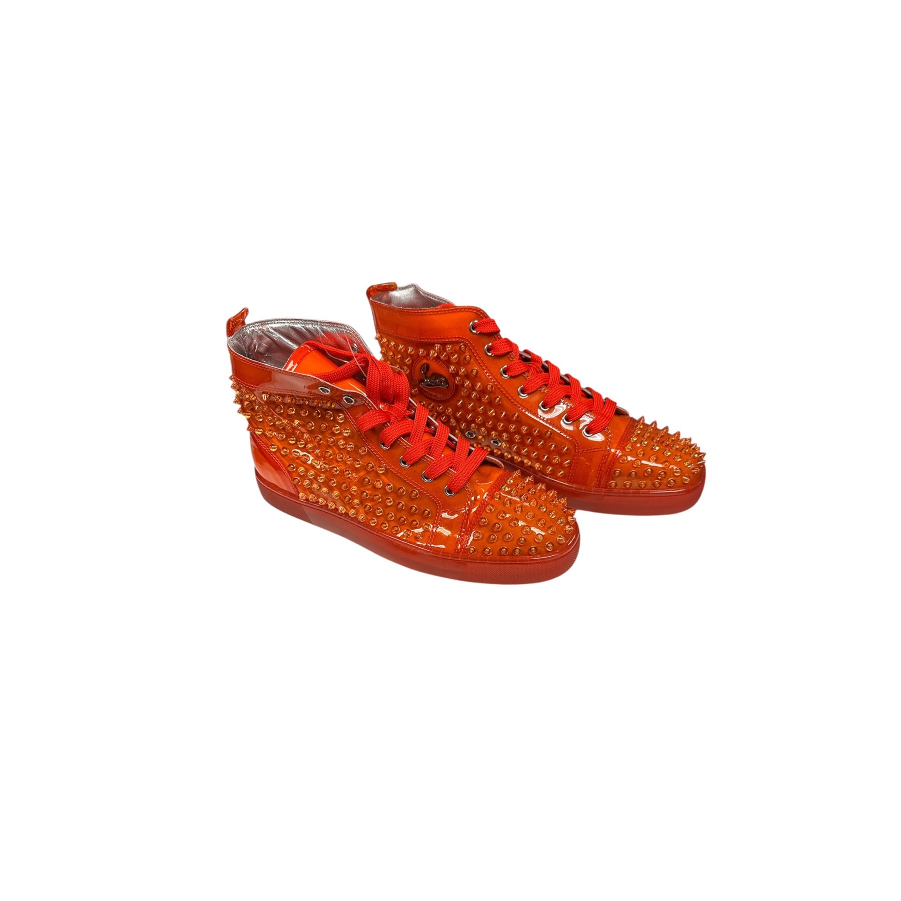 New Christian Louboutin Mens Red/Orange PVC Spiked High Top Sneakers Euro Size 44