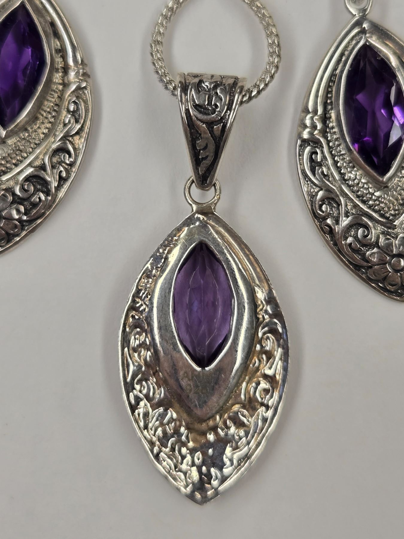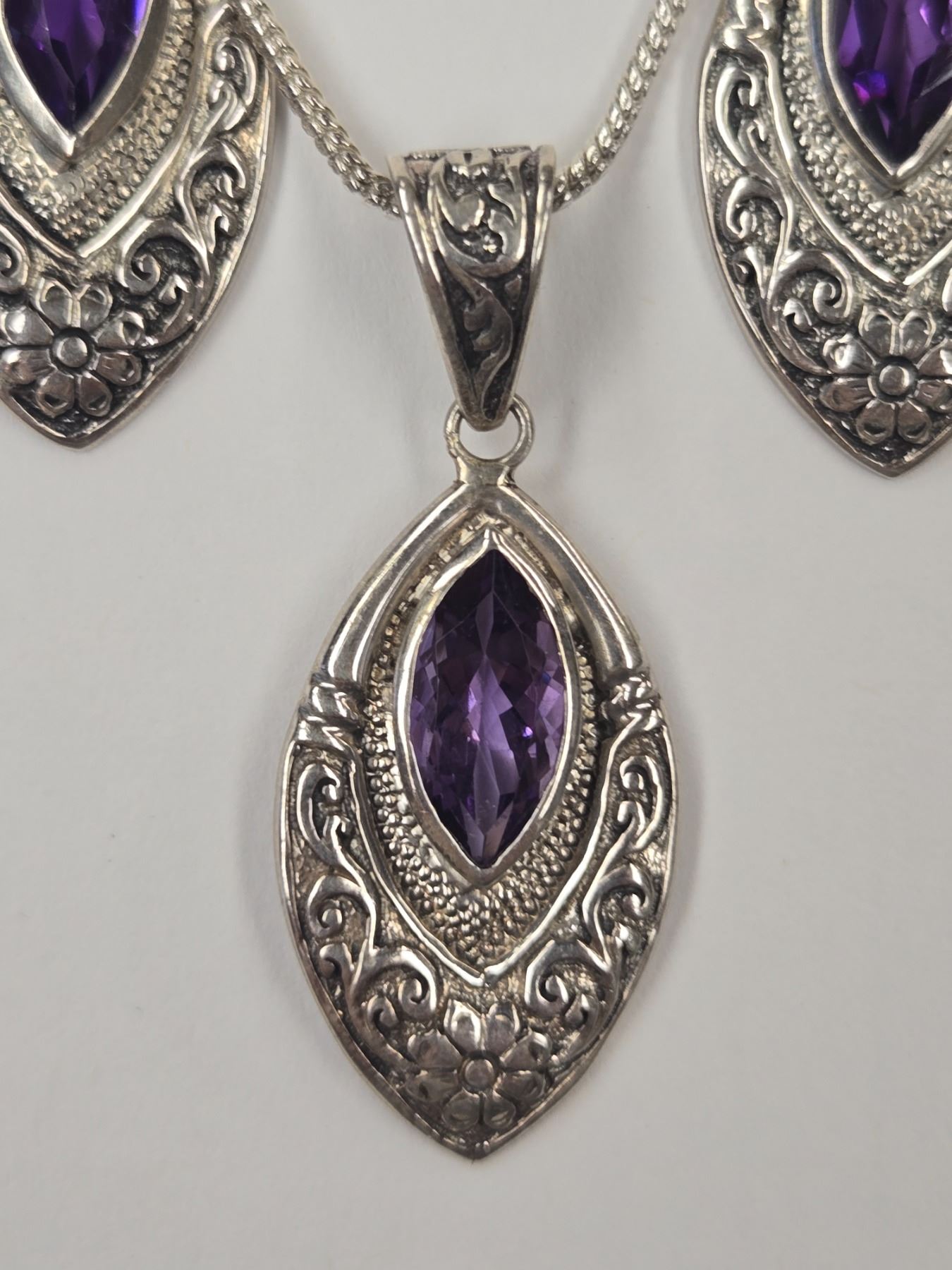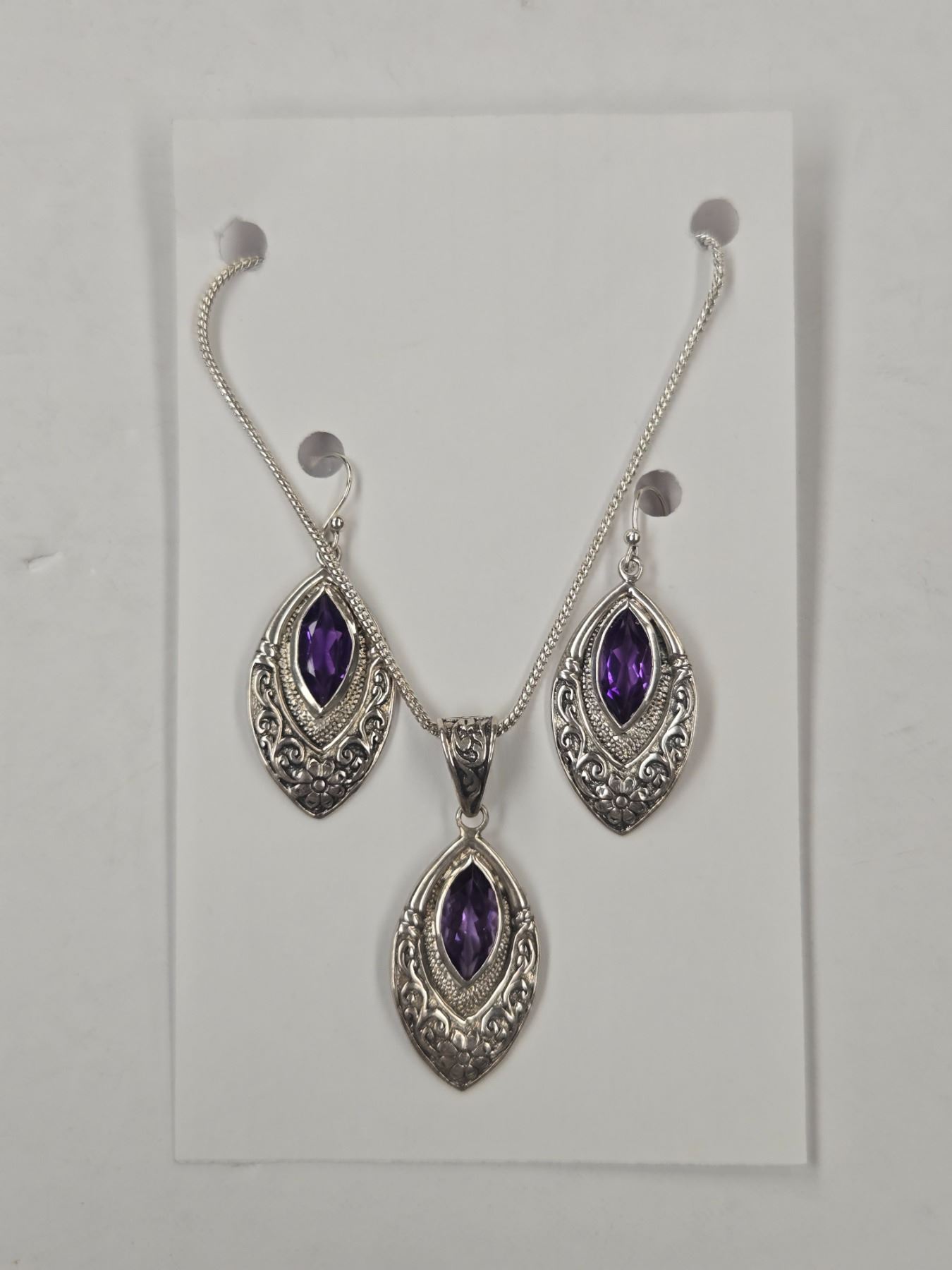 New Faceted Amethyst Crystal Necklace & Earrings Set in Silver Settings (all stamped .925) Total weight including chain: 18.4 grams