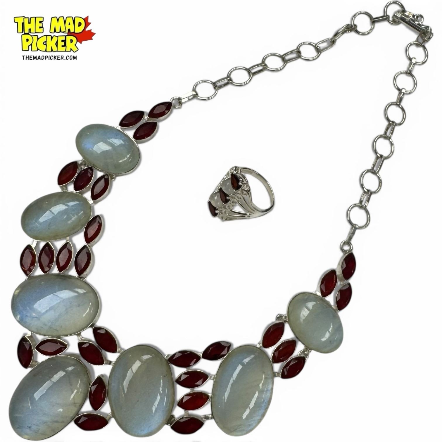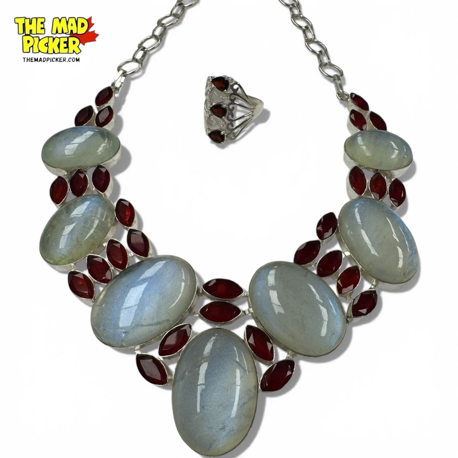 New Faceted Garnet Crystal, Polished Quartz Cabochon Necklace & Earring Set - Collar Necklace is 2" wide (size 10 ring is stamped .925)