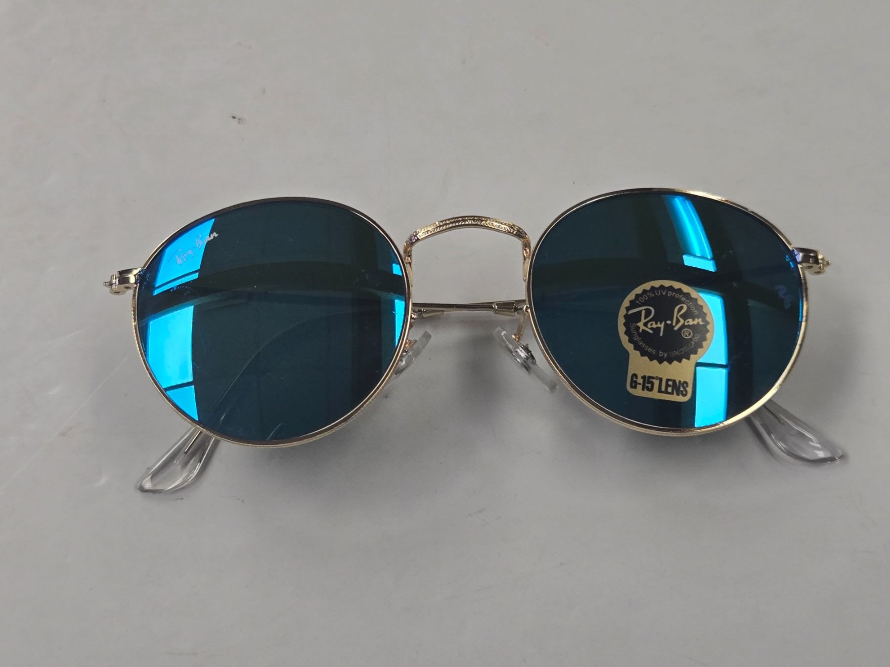 New Genuine Ray-Ban Gold Wire Frame Sunglasses with Reflective Blue G-15 Lenses