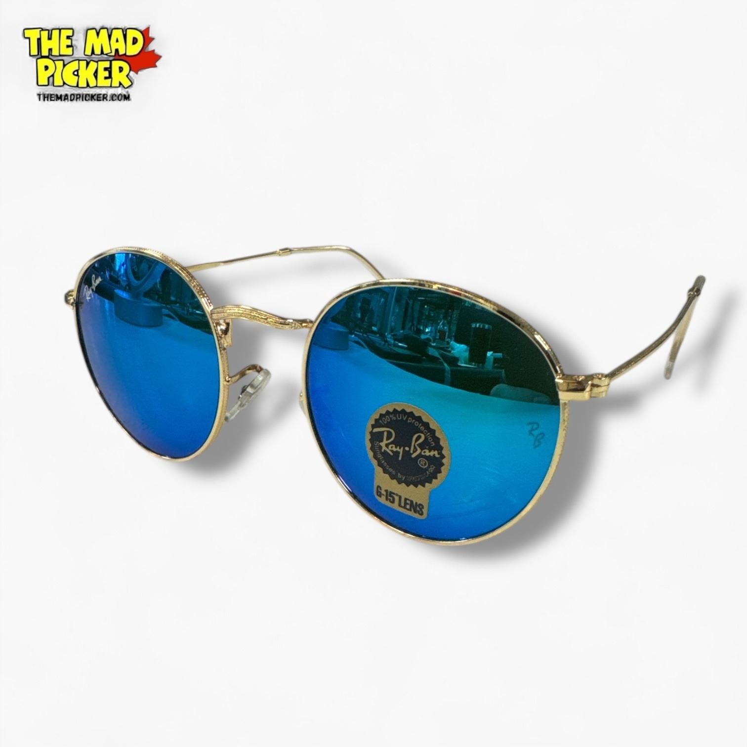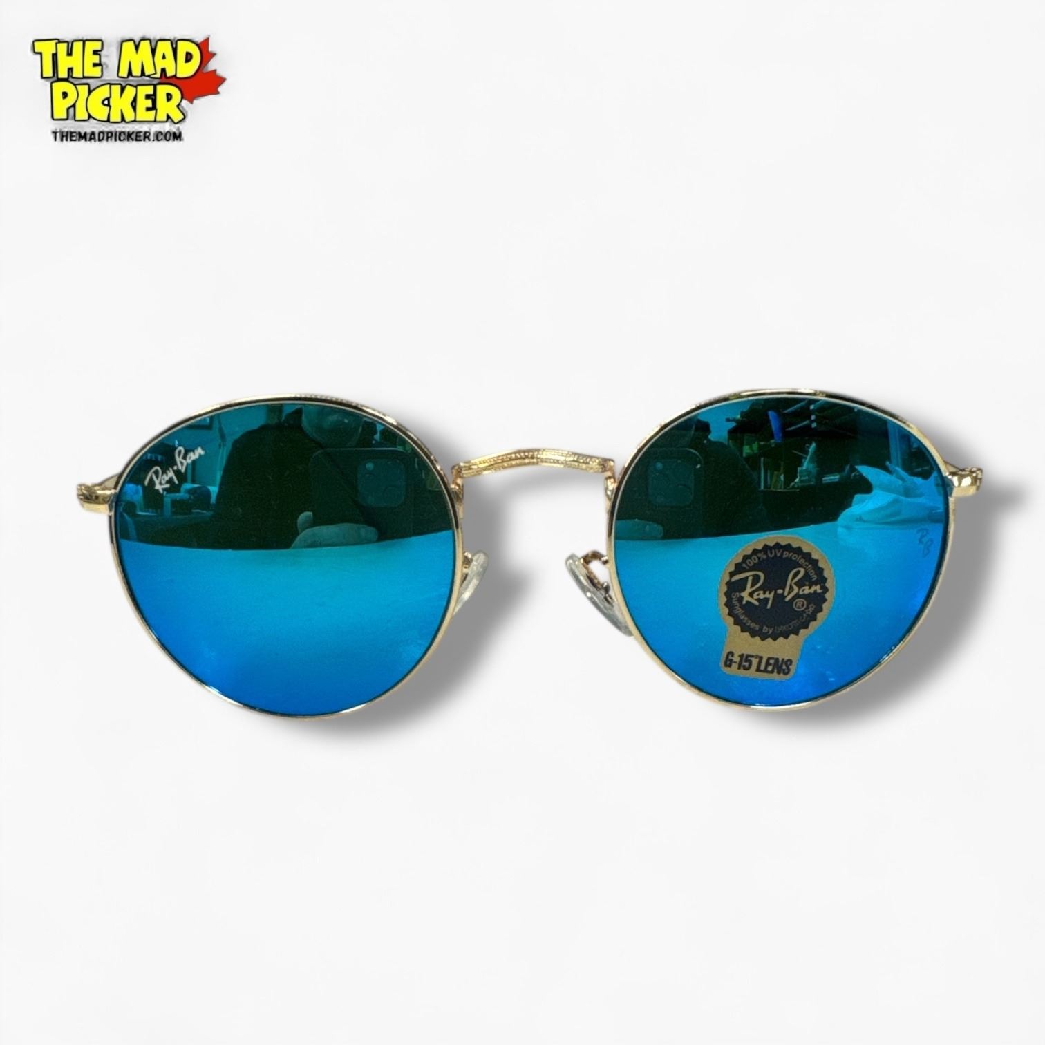 New Genuine Ray-Ban Round Flash Sunglasses - Gold Wire Frame with Blue G-15 Lenses