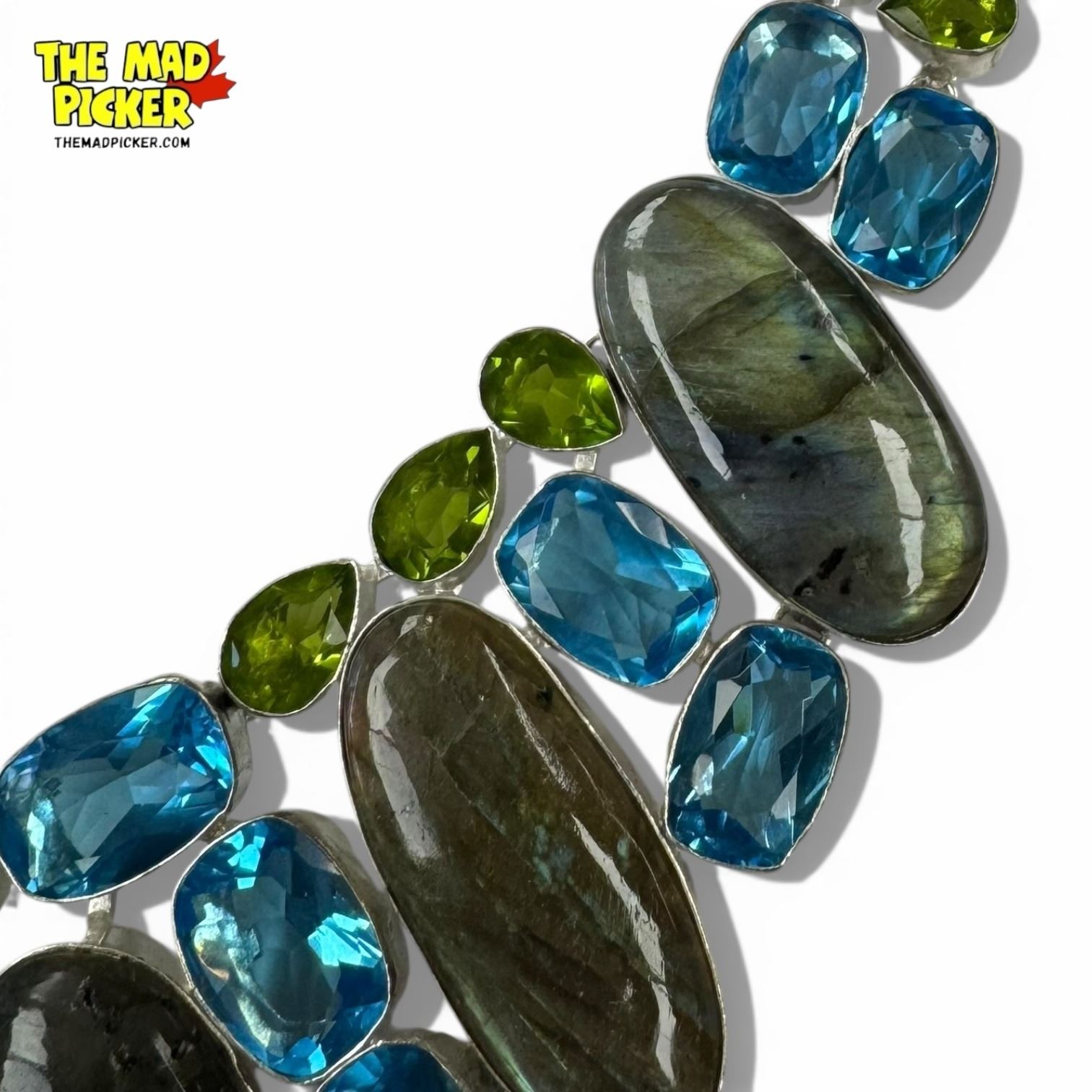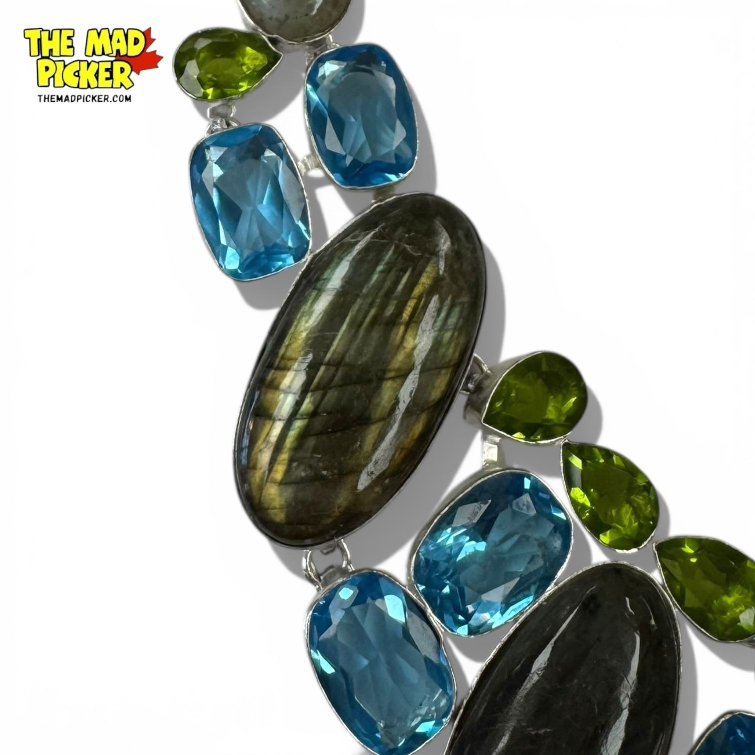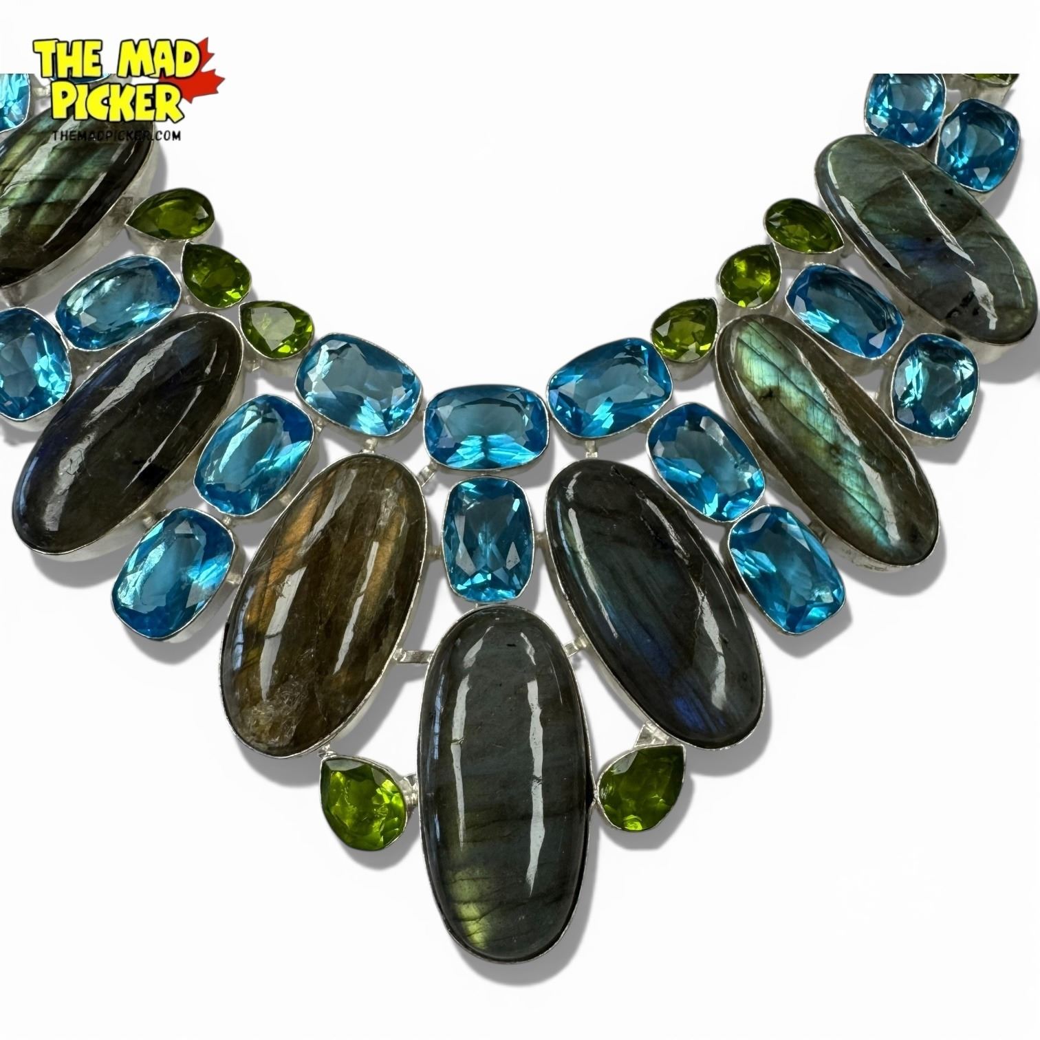 New Labradorite, Peridot & Blue Crystal Collar Necklace - Necklace center is 2.5" deep