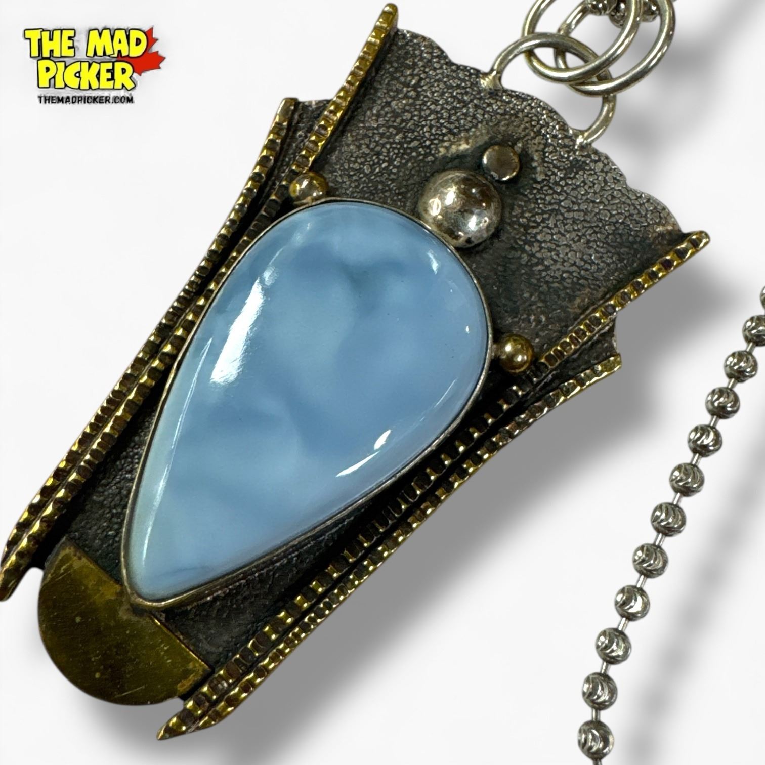 New Sterling Silver Blue Lace Agate Necklace with Golden Accents- (34 x 61 mm pendant on 28" chain) - Total weight: 24.5 grams