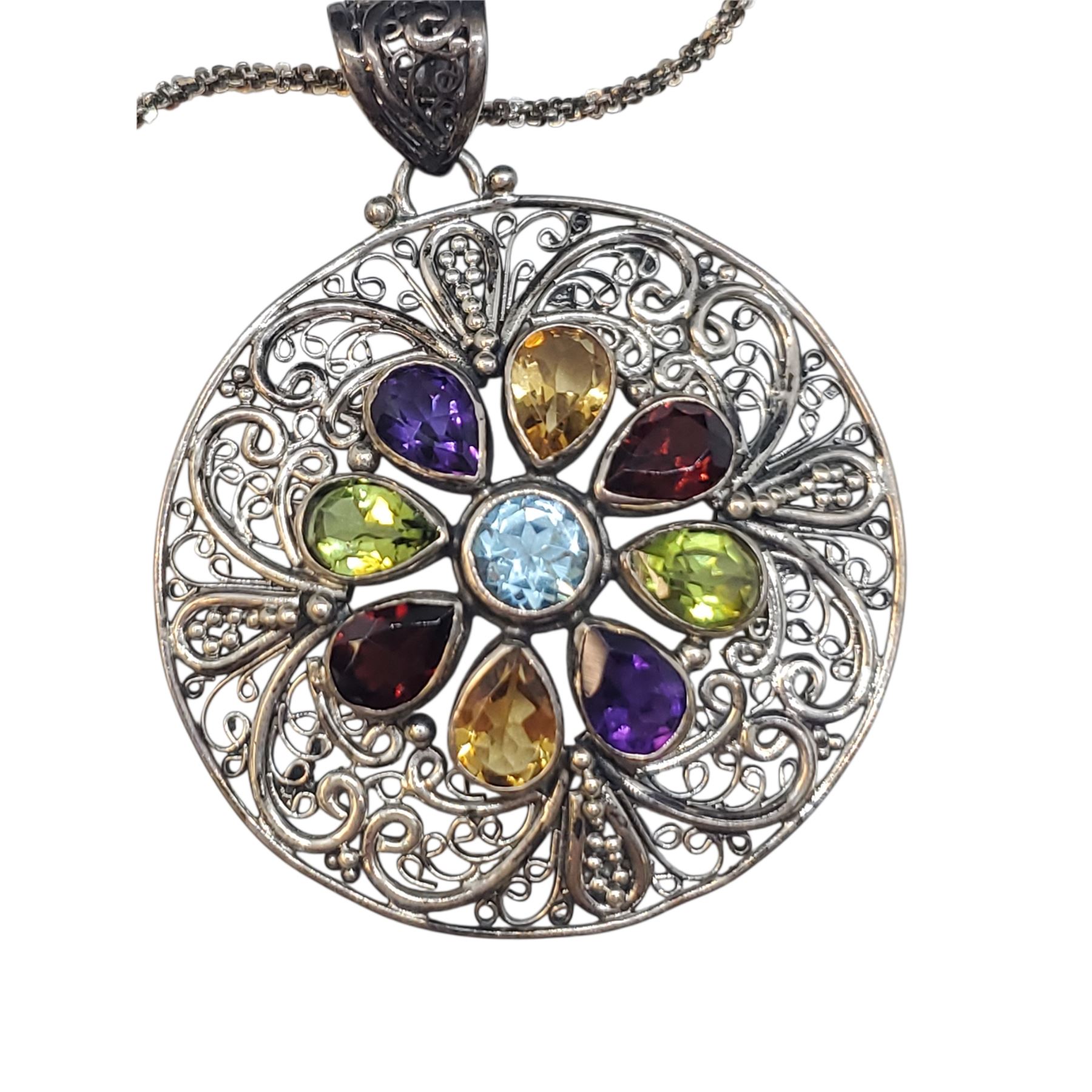 New Sterling Silver Multi-Gemstone Necklace (38 mm pendant on a 36" chain) - Total weight: 15.5 grams