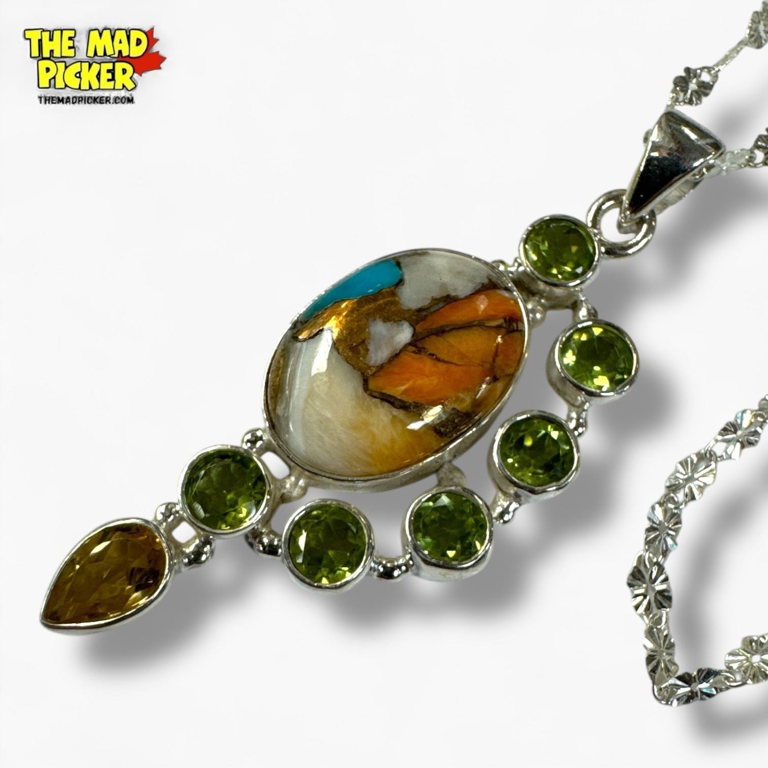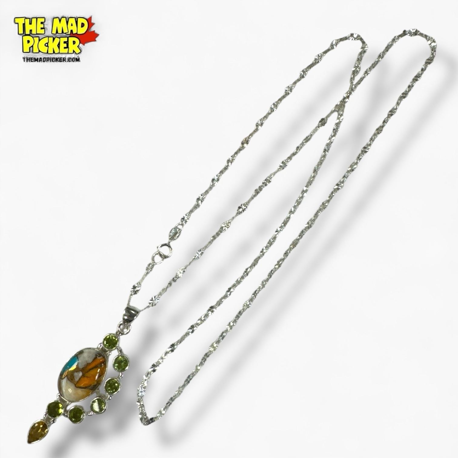 New Sterling Silver Spiny Oyster Turquoise, Peridot & Citrine Necklace (20 x 48 mm pendant on 26" chain)- Total weight: 10.5 grams