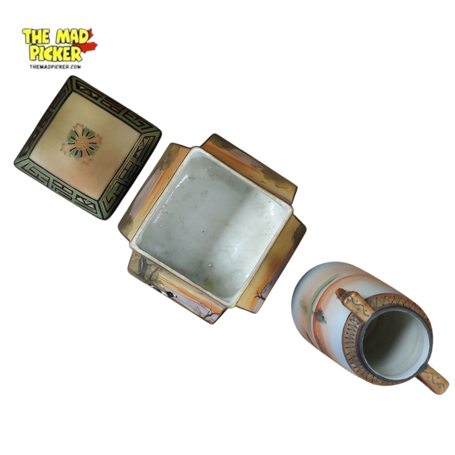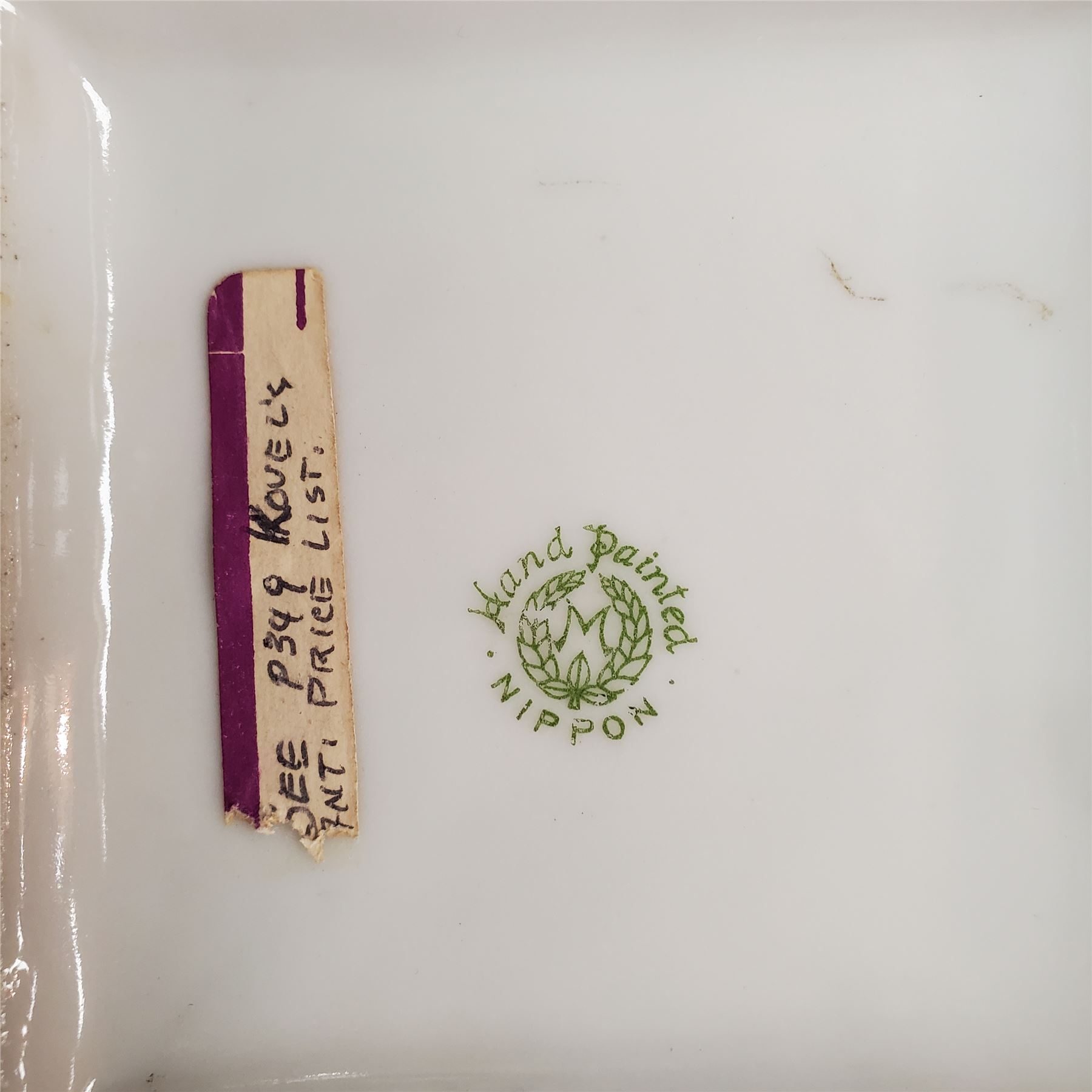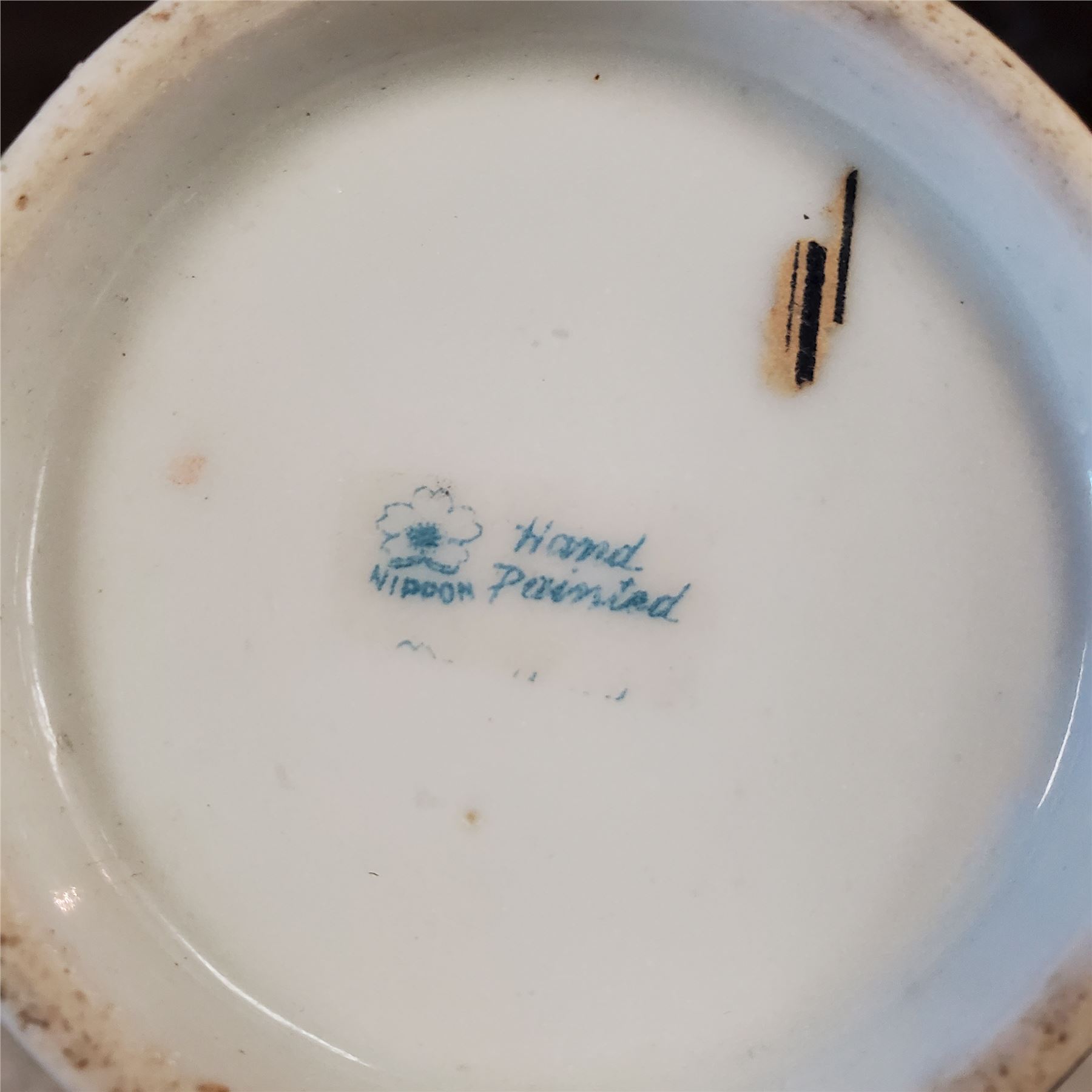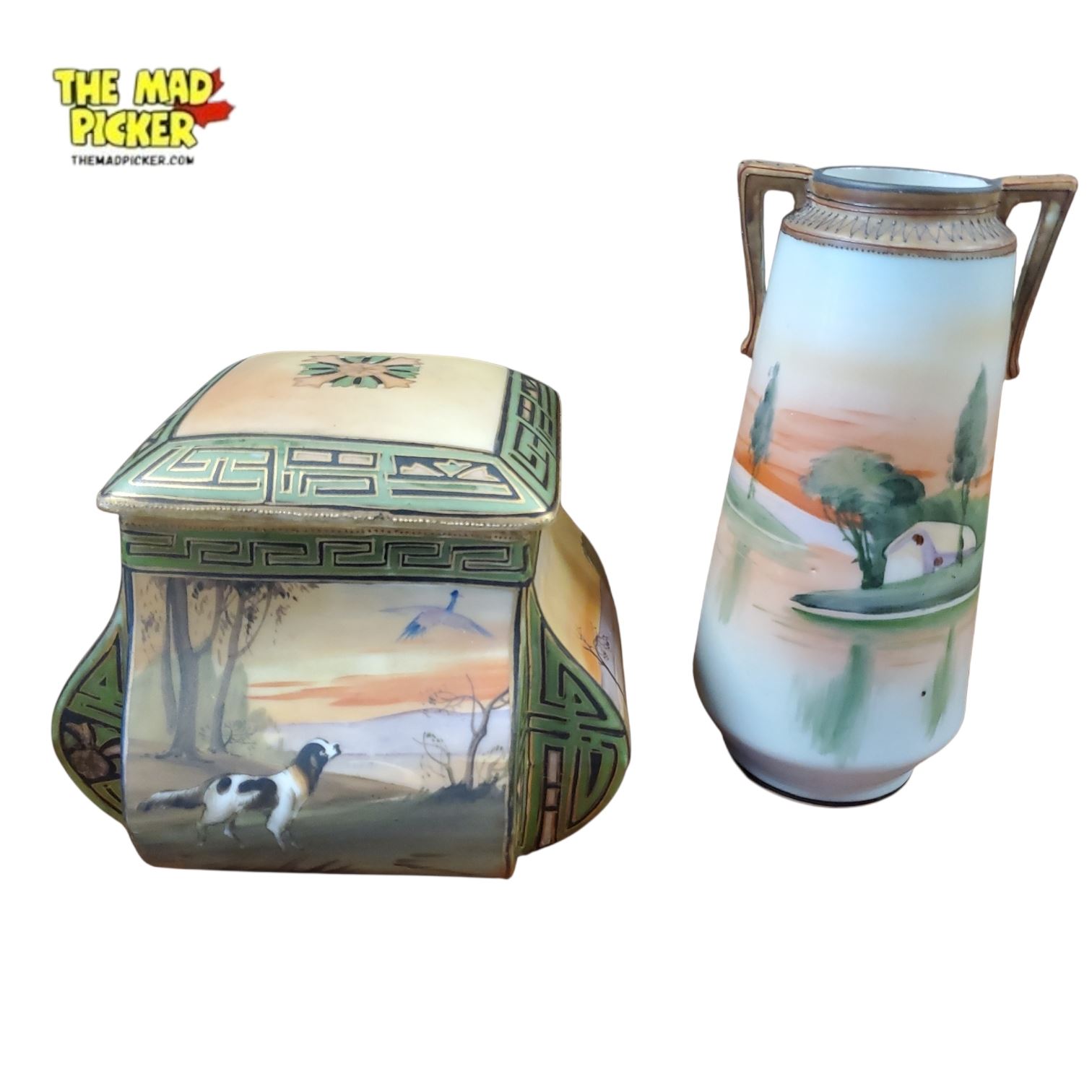Pair of Nippon era porcelain pieces (1891-1921): a 7-inch hand-painted vase and matching porcelain box. Both feature intricate designs typical of Nippon artistry. Produced during the late Meiji to early Taisho period. Fine examples of Japanese export porcelain craftsmanship.