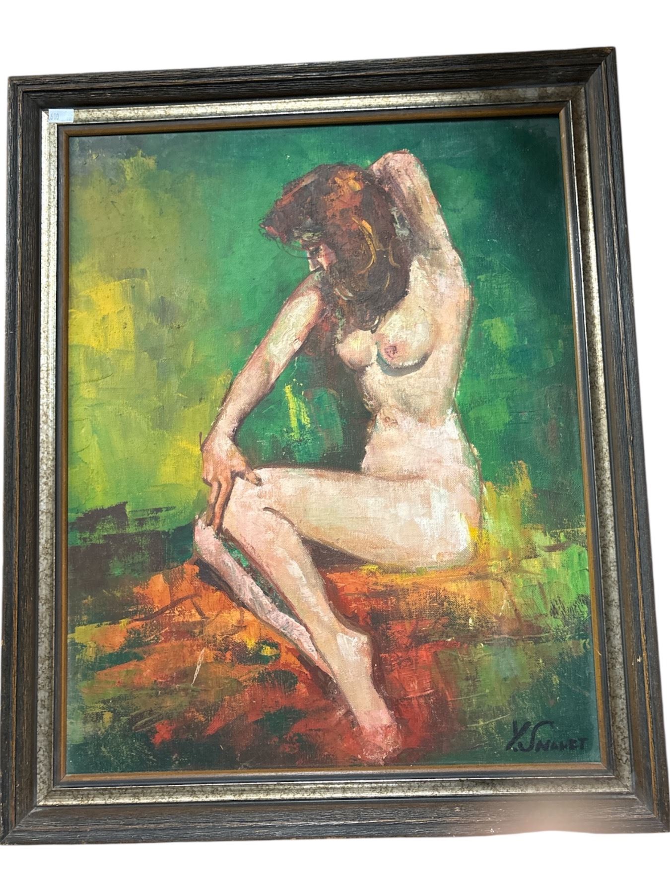 Oil painting on canvas depicting a nude subject signed by artist Y. Snanet. Measures 19x23-Inch. Features detailed brushwork and a focus on form and composition. Item is as pictured.