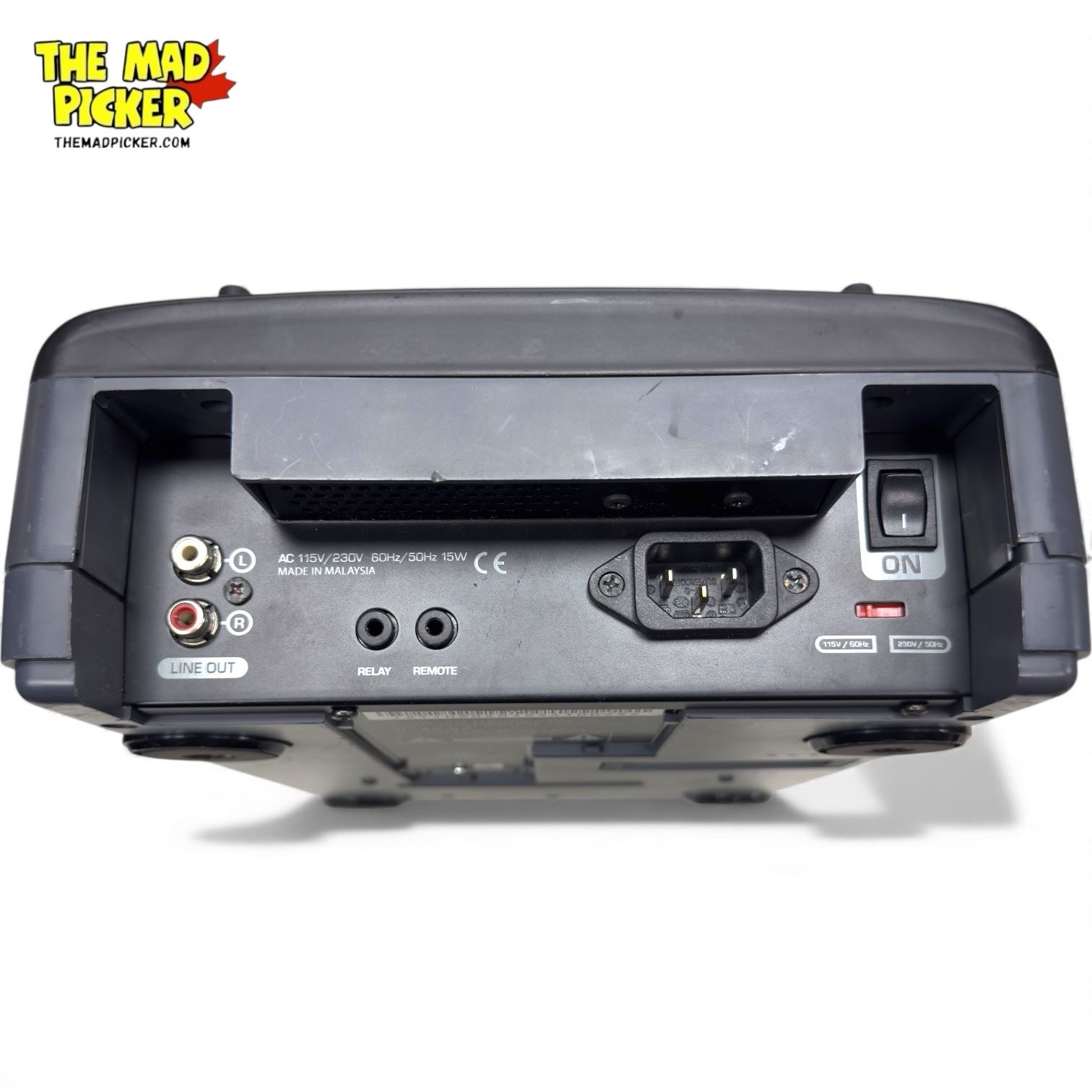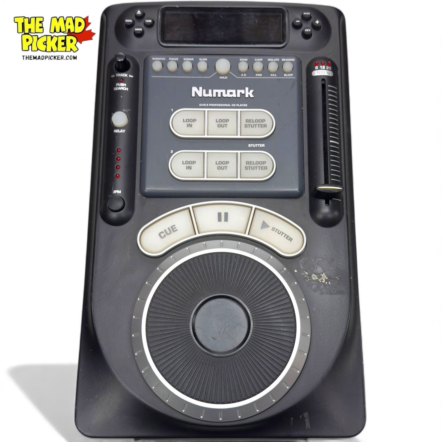 Tested and working. The Numark Axis 9 professional CD player features a touch-sensitive jog wheel for scratching; multiple DSP effects including reverse; built-in Beatkeeper with auto-synchronization; pitch control range +/-6, +/-12, +/-25, and +/-100% with +/-100% Key Lock; stores up to 3,000 cue points transferable to compatible units; CDR compatible; two seamless loops with three hot stutter starts; 48-second Anti-Shock buffer for continuous playback; adjustable startup and braking speeds; recessed rear panel with fader/remote start and relay connections; illuminated transport bay; user-upgradeable via internet downloads.