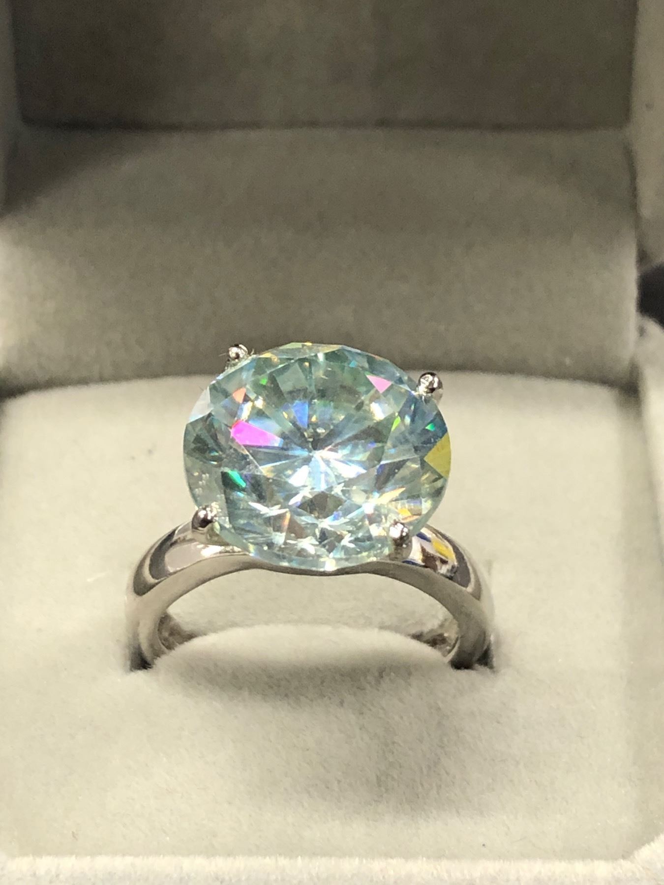 ONE MOISSANITE SET IN PLATED SILVER WEIGHING APPROXIMATELY 12.00 CARATS APPRAISED VALUE $5,975.00 #(38)