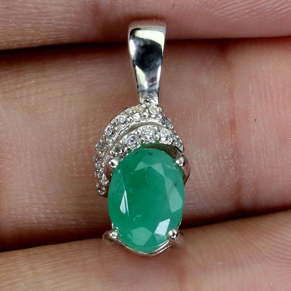 OVAL CUT 7X5 mm EMERALD PENDANT IN 14K WHITE PLATED GOLD OVER 925 STERLING SILVER - SIZE 8 - APPRAISED REPLACEMENT VALUE CAD 425