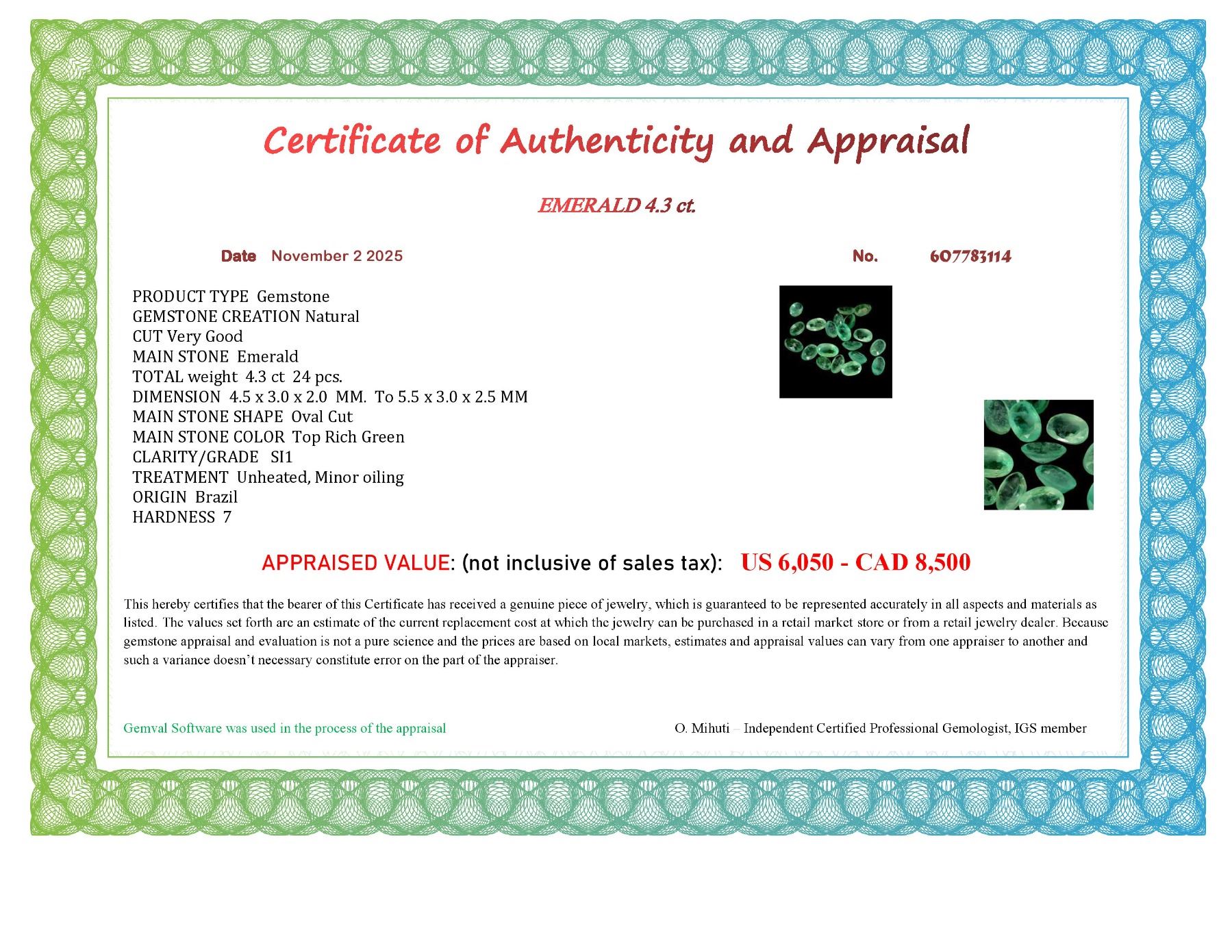 OVAL CUT NATURAL UNHEATED EMERALD 24 pcs. 4.30 CT. - Appraised value CAD 8,500