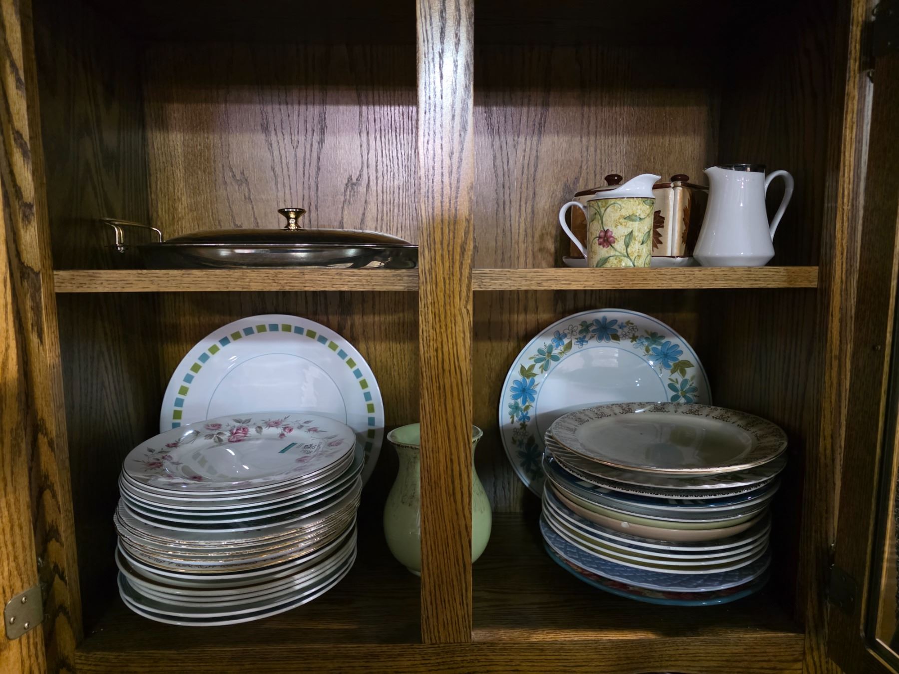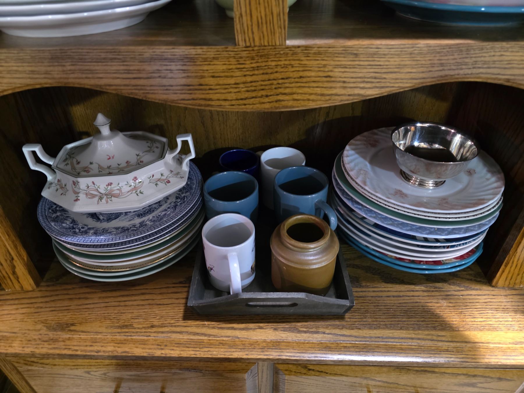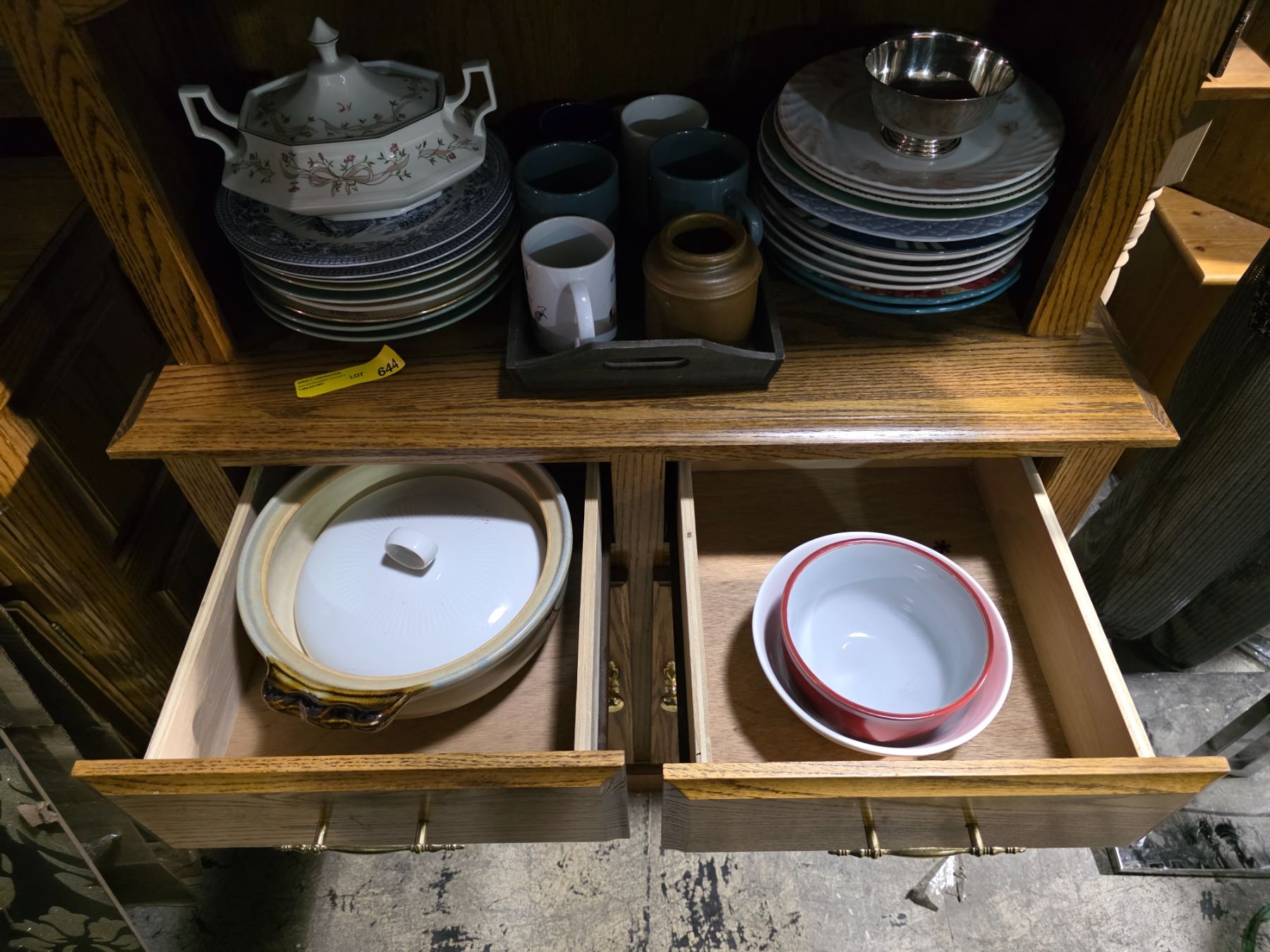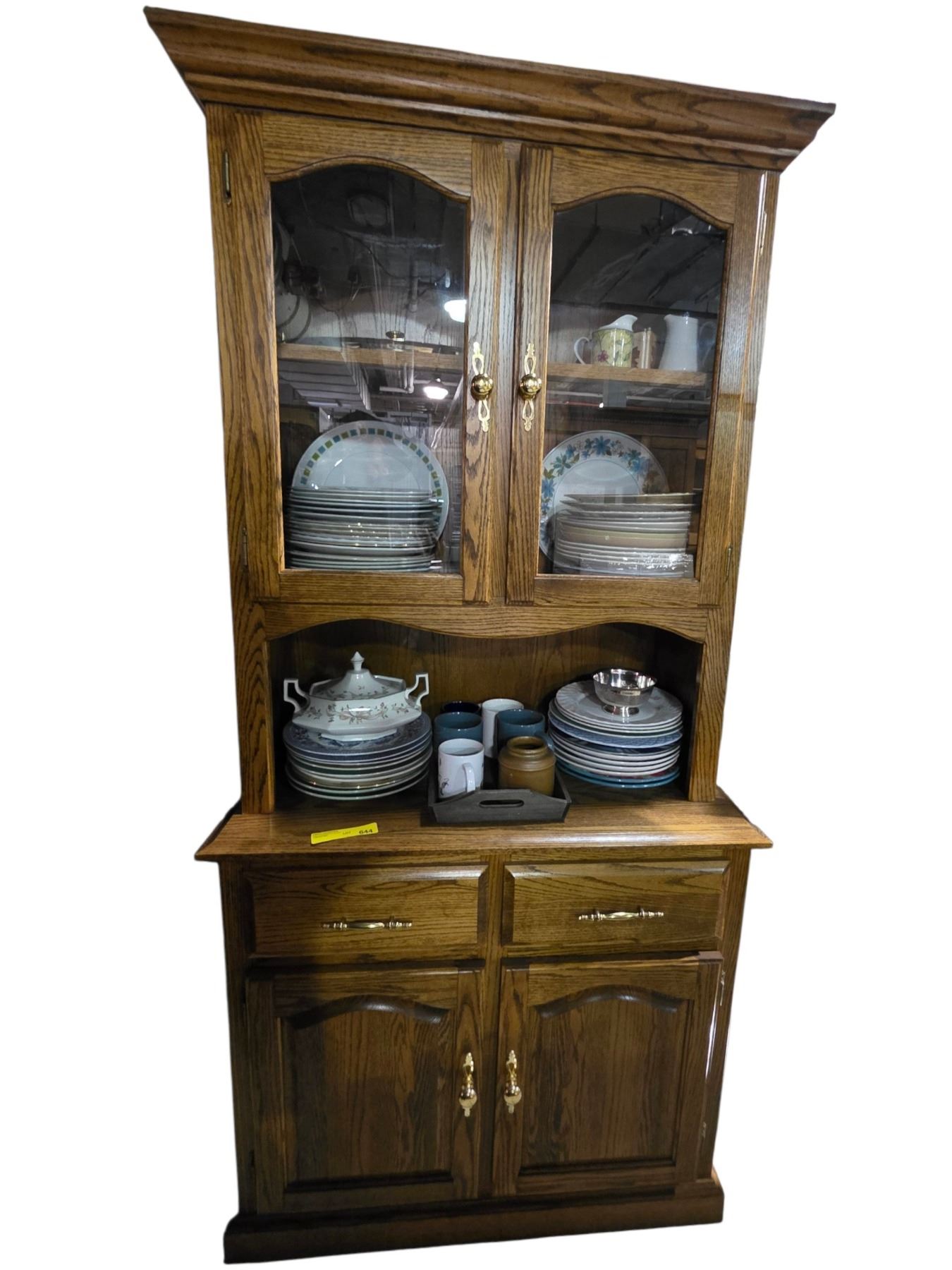 Oak Finish China Cabinet / Hutch with Glass Doors & Dishware Contents