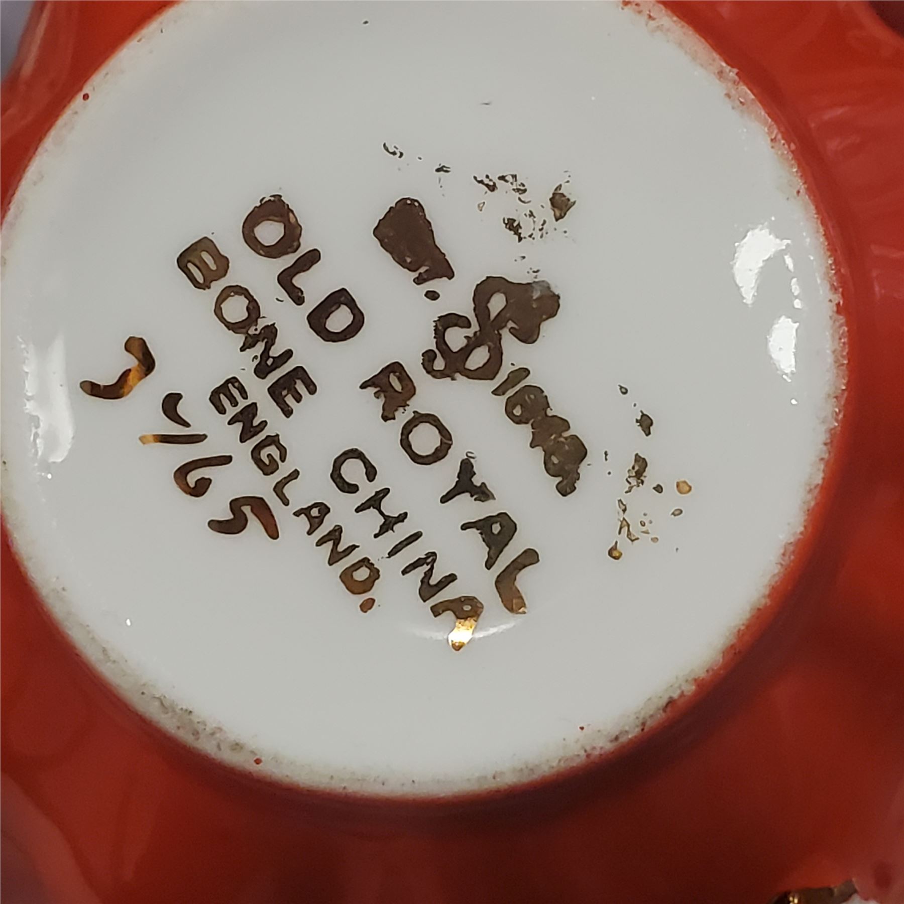 Set of Old Royal China including 4 cups with matching saucers and 1 extra saucer. Bright orange porcelain with gold trim detailing. Likely mid-20th century production, known for vibrant color patterns. Item is as pictured.