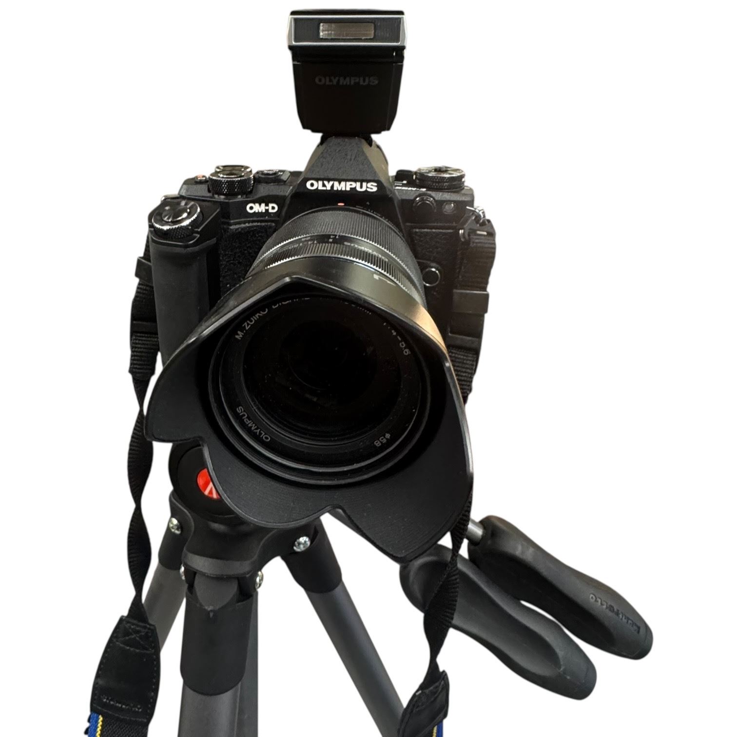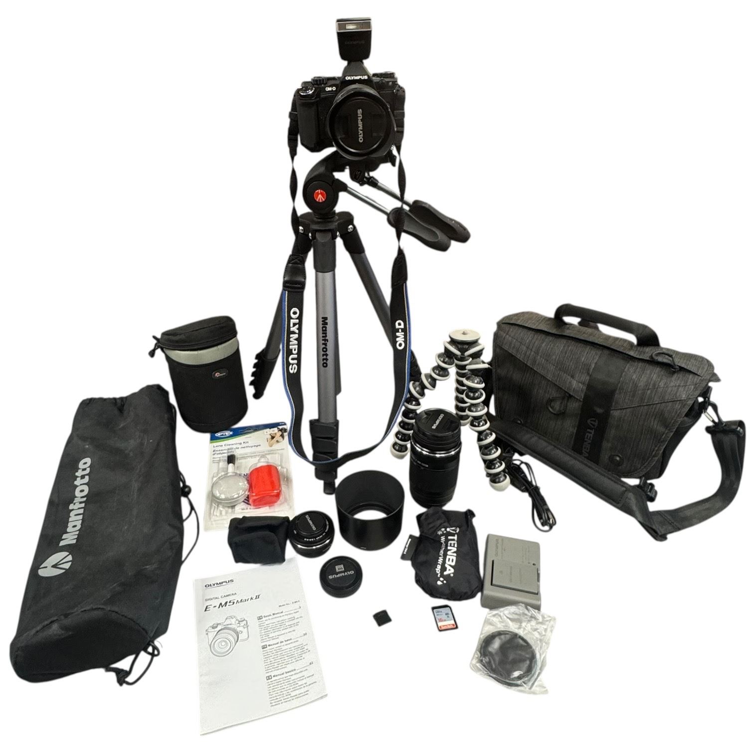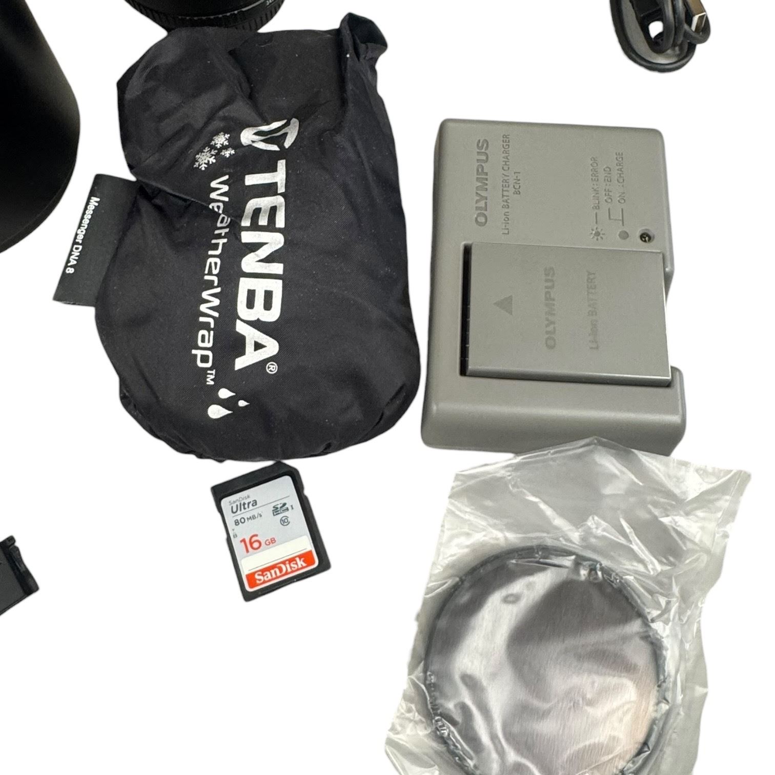 Olympus OM-D digital camera includes lenses and assorted accessories as pictured. Notable for its Micro Four Thirds system, renowned for compact size and high-quality imaging. Item is as pictured. Item has not been tested