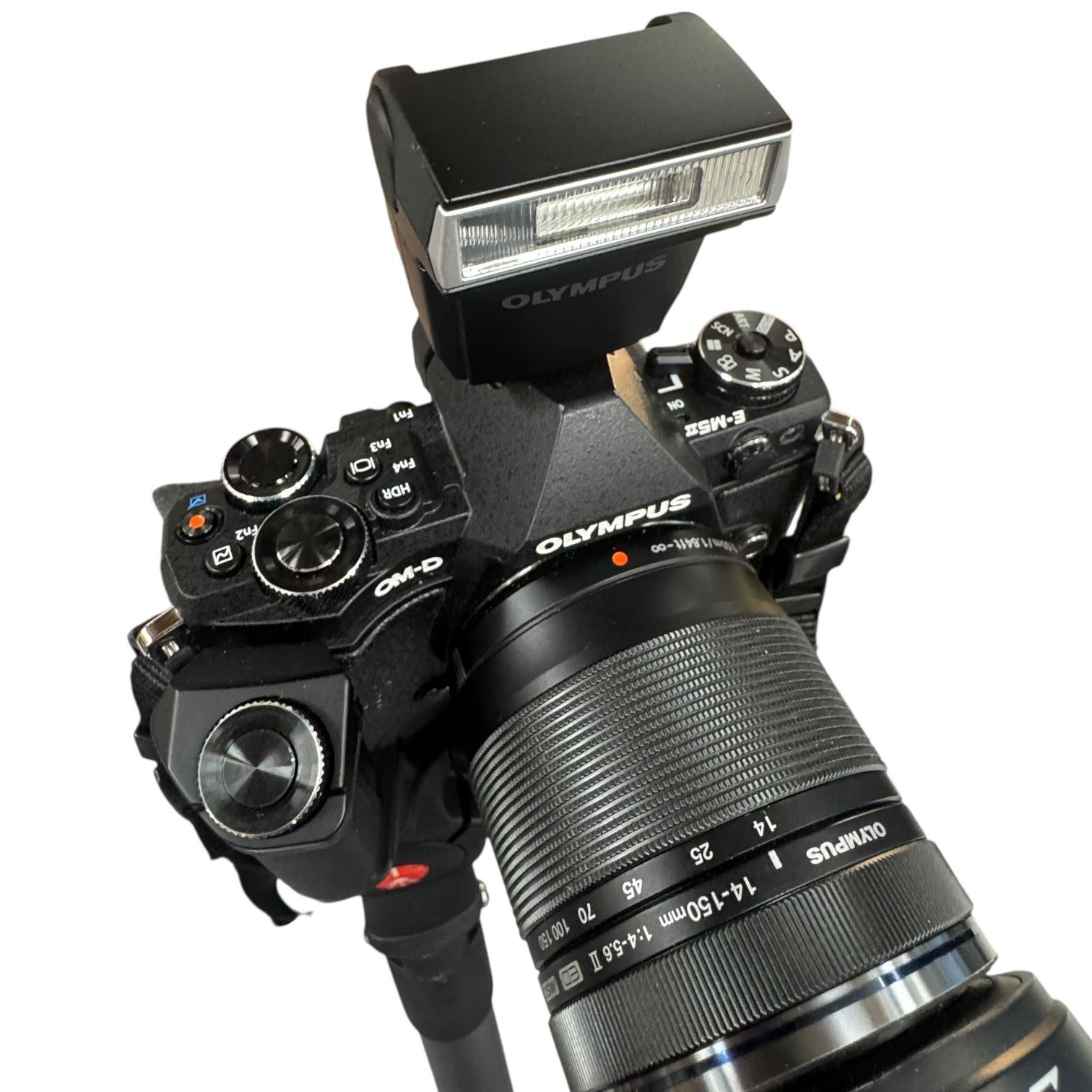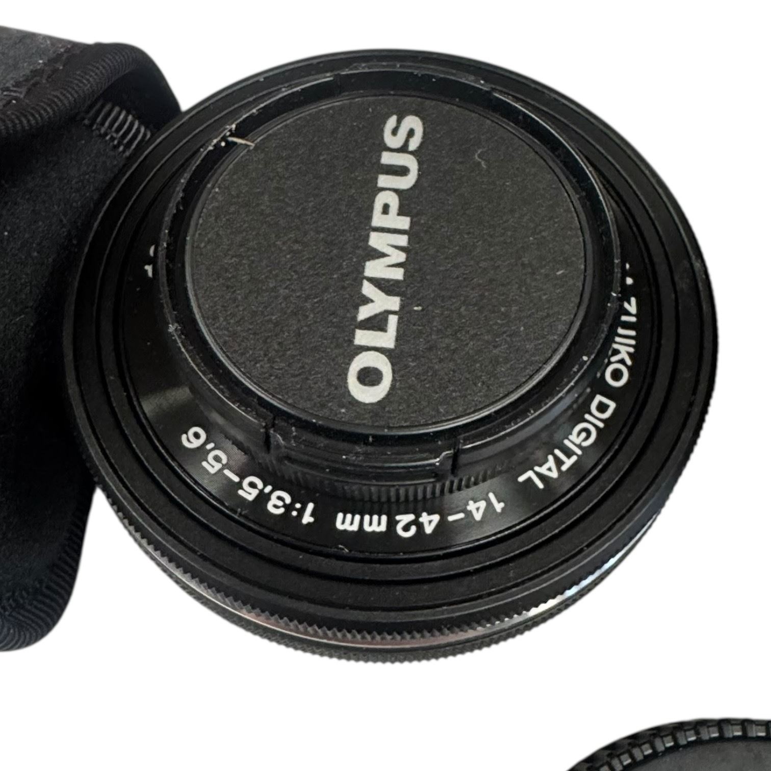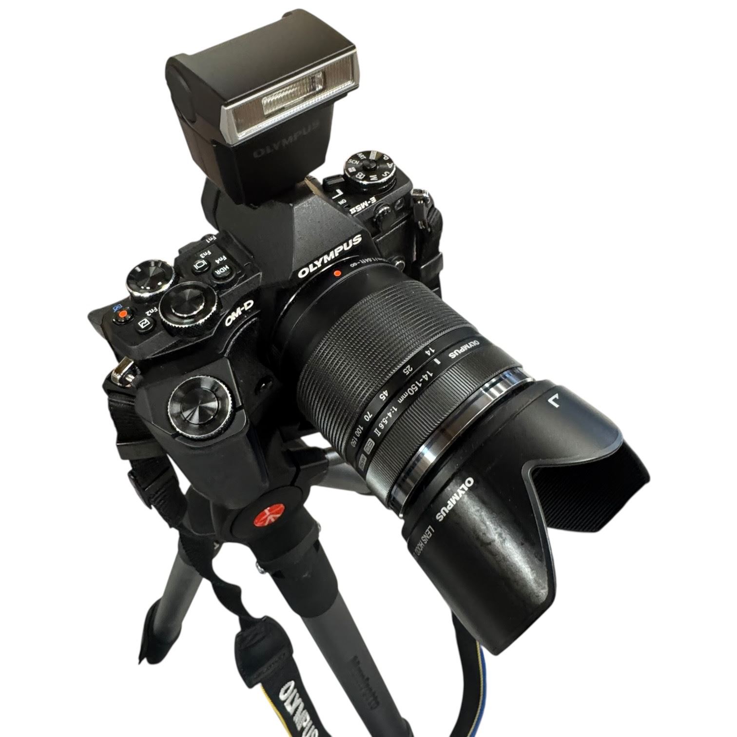 Olympus OM-D digital camera includes lenses and assorted accessories as pictured. Notable for its Micro Four Thirds system, renowned for compact size and high-quality imaging. Item is as pictured. Item has not been tested