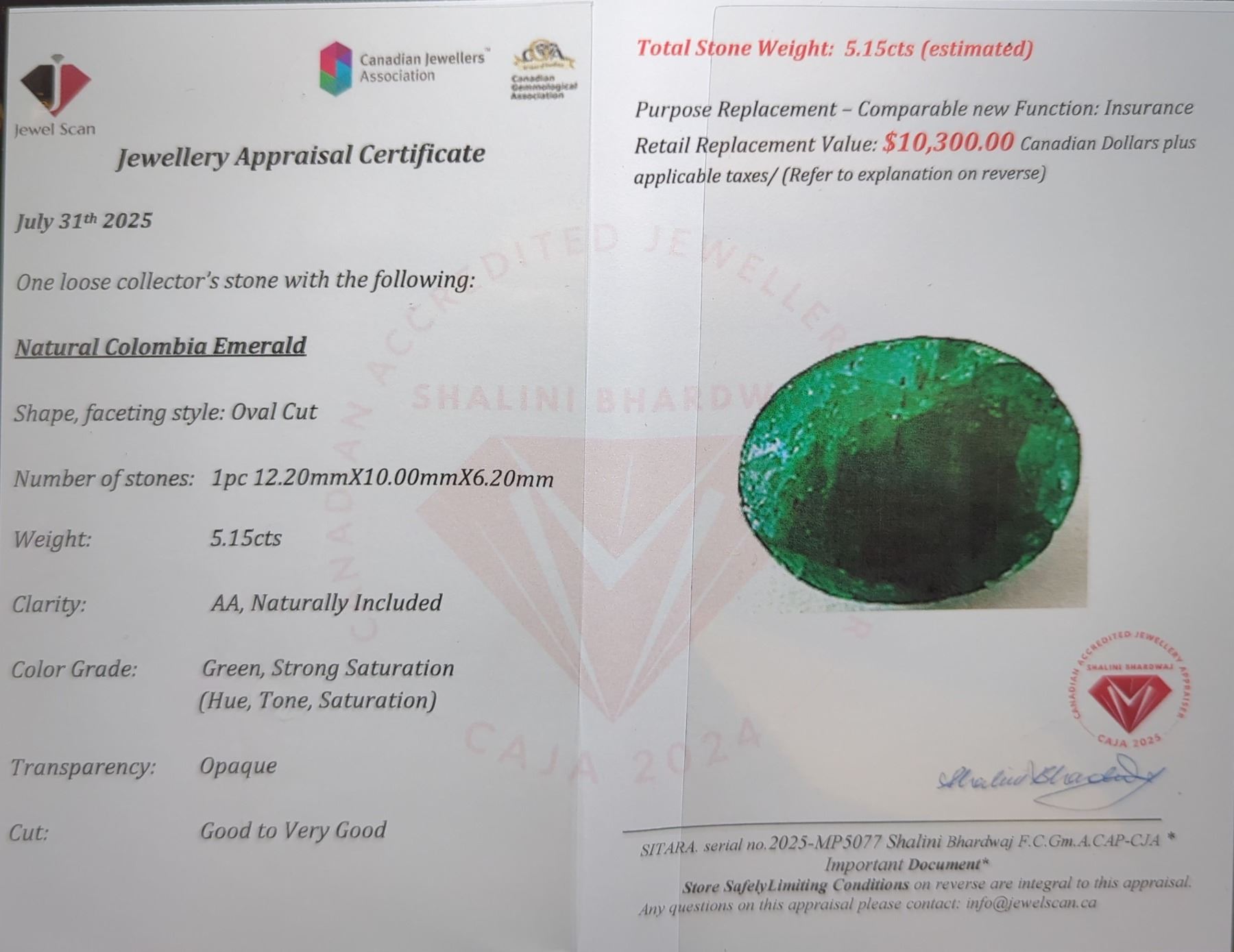 One loose collector's stone with the following:Natural Colombian Emerald Shape, faceting style: Oval Cut Number of stones: 1pc Estimated Retail Replacement Value: $10,300,00 CAD
