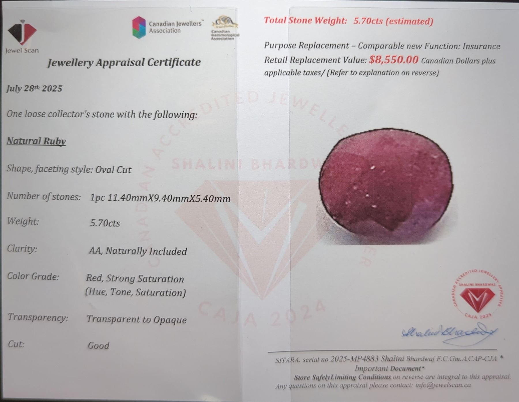 One loose collector's stone with the following: Natural Ruby Shape, faceting style: Oval Cut Number of stones: 1pc 11.40mmX9.40mmX5.40mm Estimated Retail Replacement Value: $8,550.00