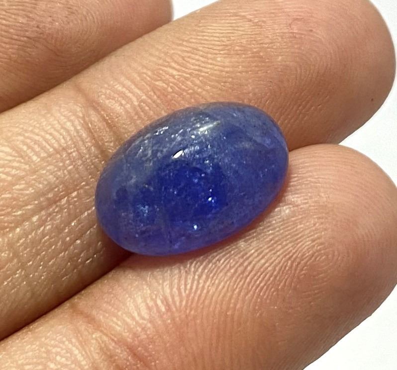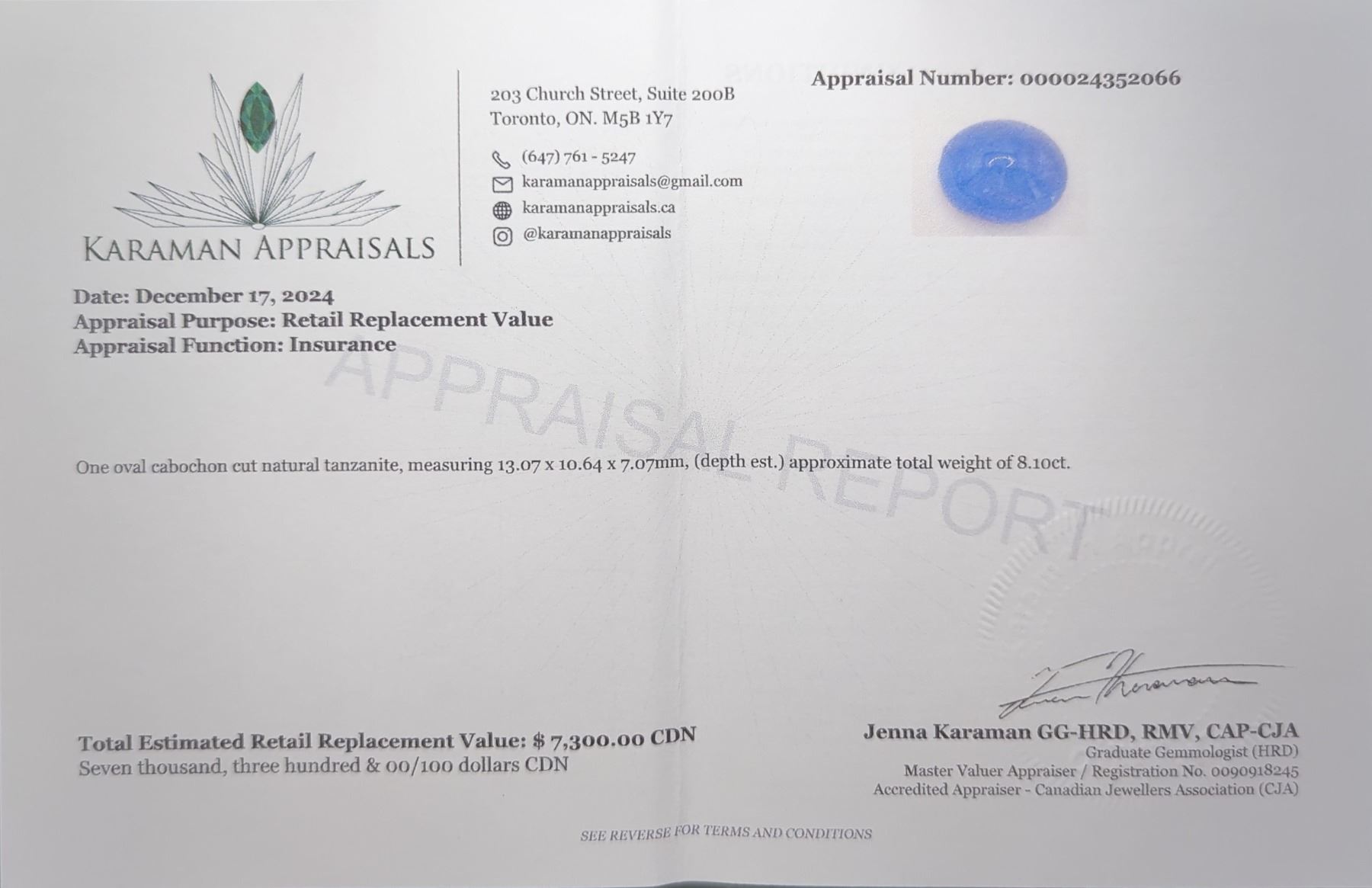 One oval cabochon cut natural tanzanite, measuring 13.07 x 10.64 × 7.07mm, (depth est.) approximate total weight of 8.10ct. Estimated Retail Replacement Value: $ 7,300.00 CDN